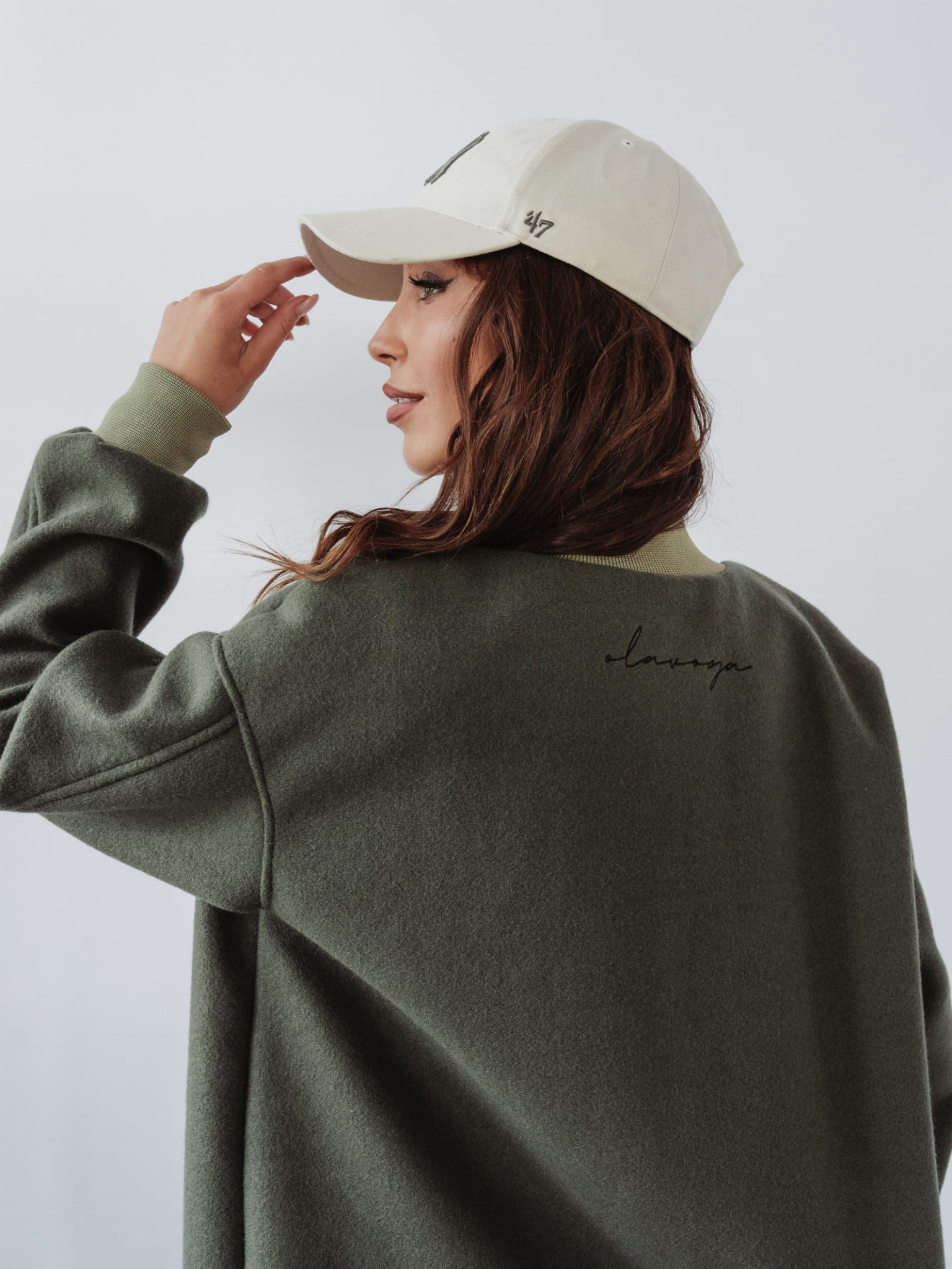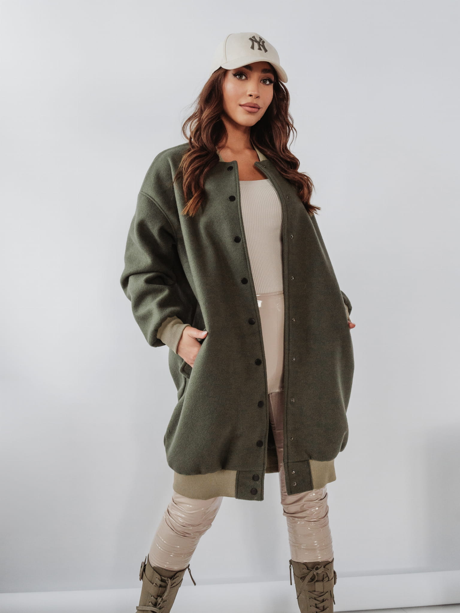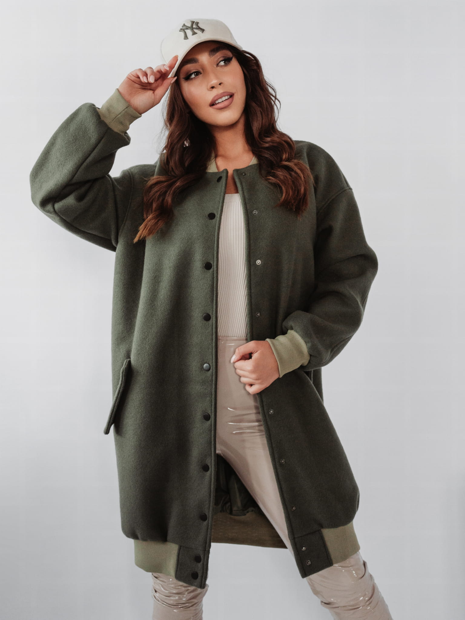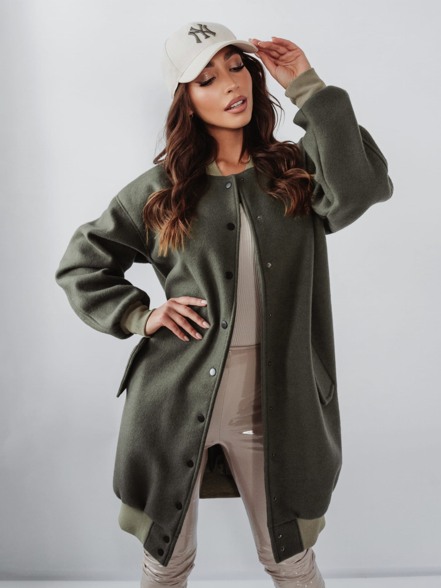 Uszyta z dbałością o każdy szczegół - oversizowa, przedłużana bomberka, zapinana na eleganckie, matowe napy. Kołnierz, rękawy i dół kurtki zakończone prążkowanym ściągaczem. Bomber Jacket, który musi znaleźć się w Twojej jesiennej garderobie.