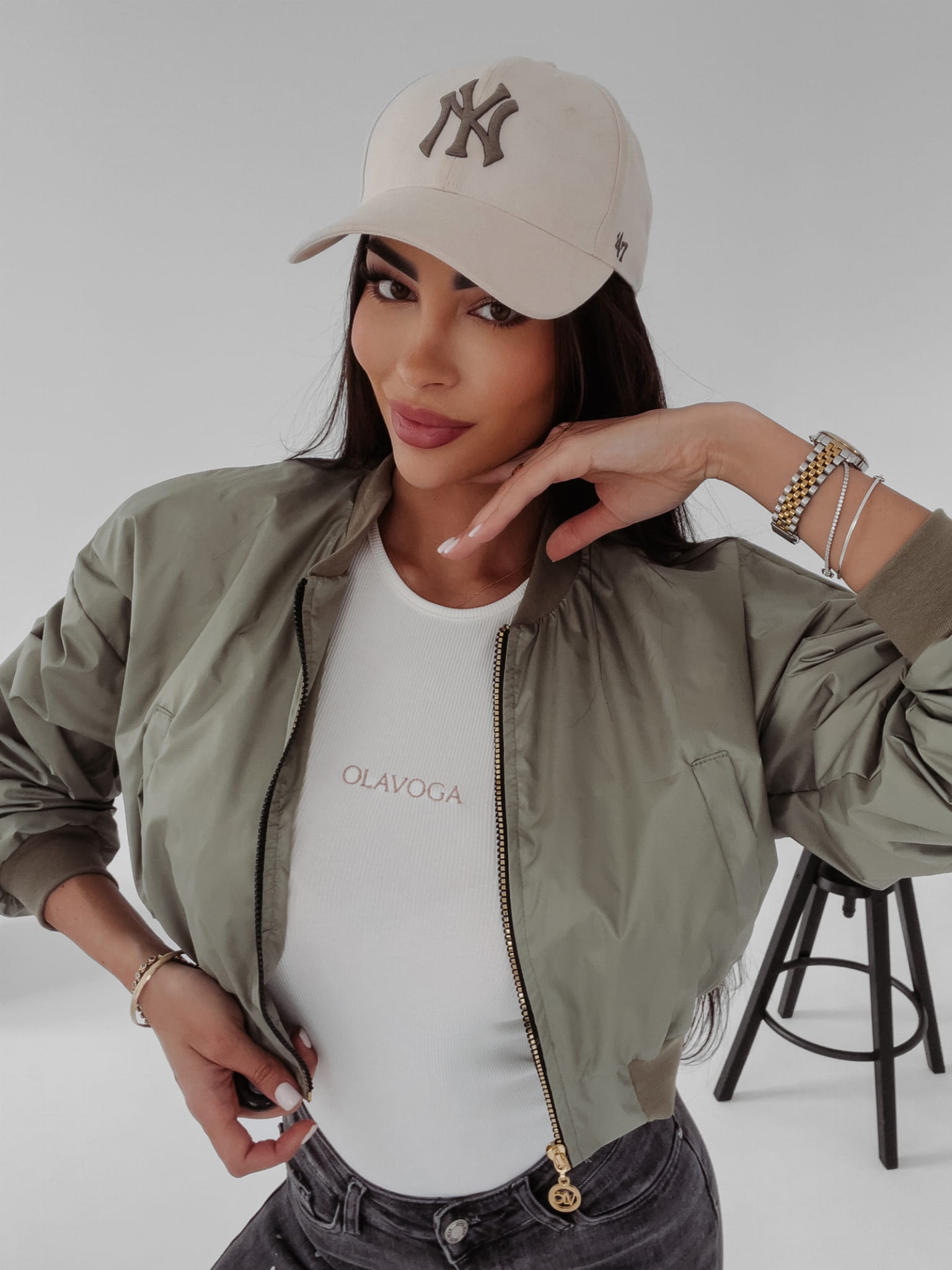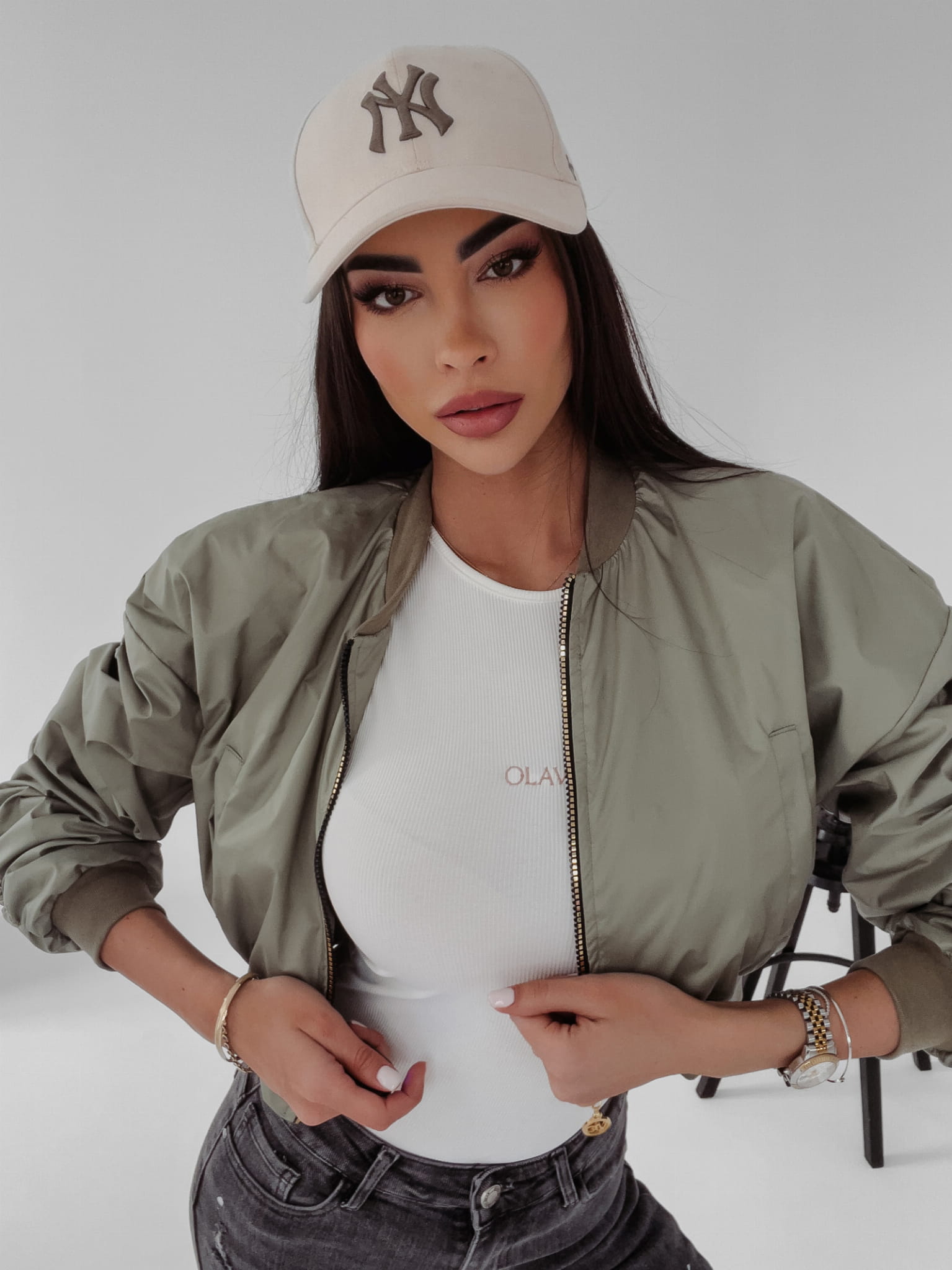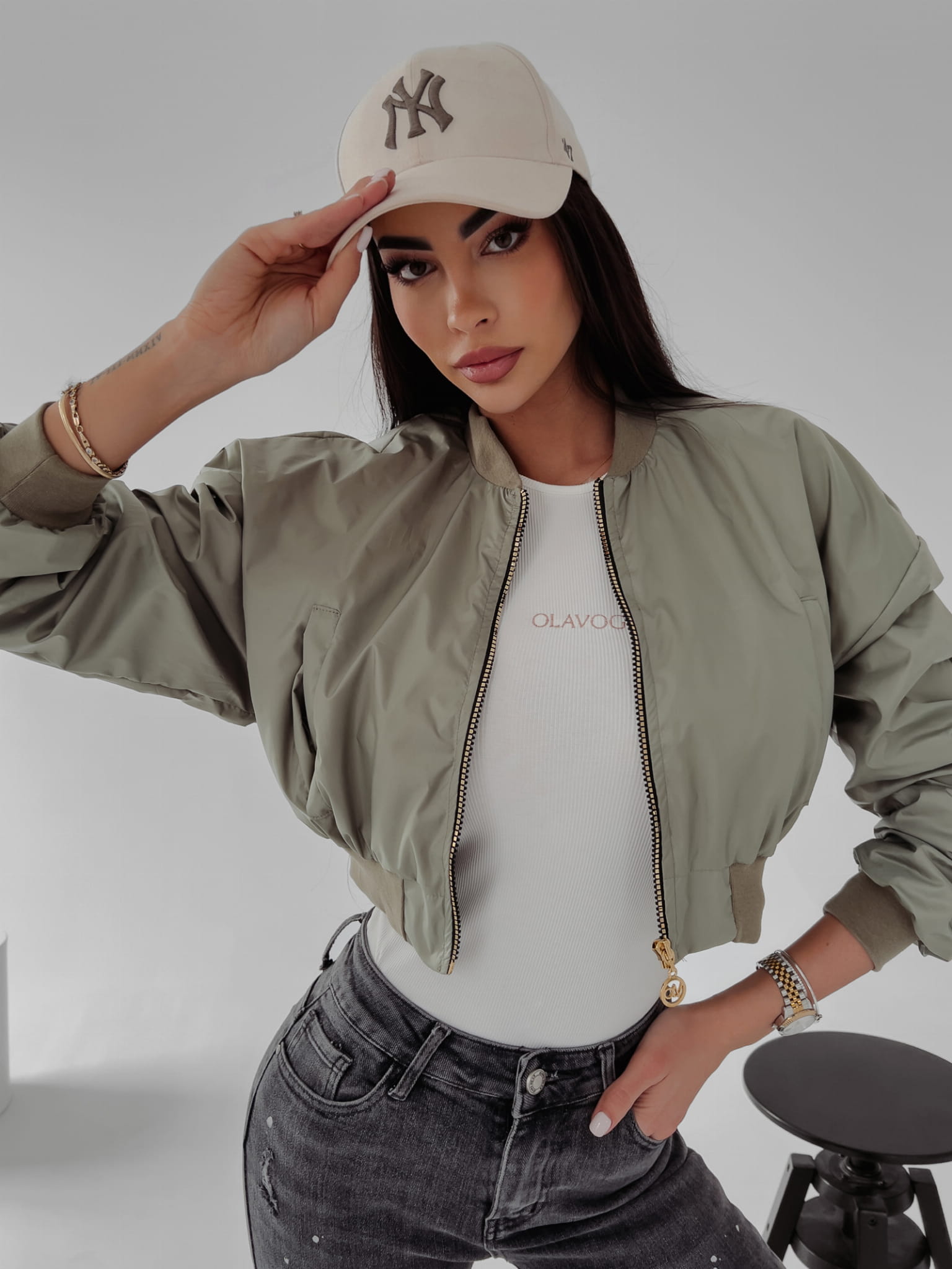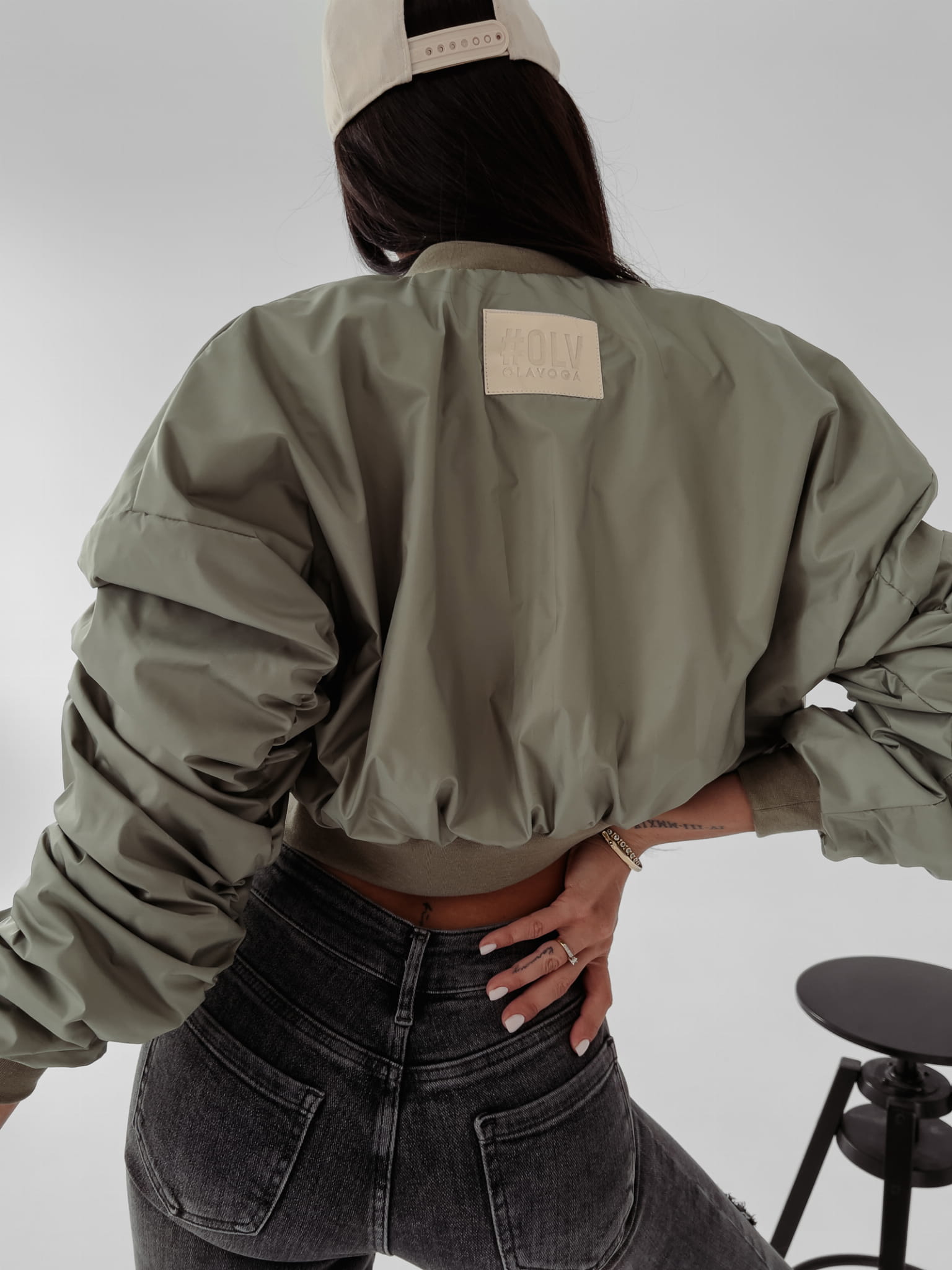Wiosenna, krótka kurtka z marszczonym rękawem, na delikatnej stójce, zapinana na złoty suwak. Z tyłu złota naszywka z logo OLV. Kołnierz, dół i mankiety wykończone prążkowanym ściągaczem. Bomberka sprawdzi się zarówno do sportowych jak i casualowych stylizacji.