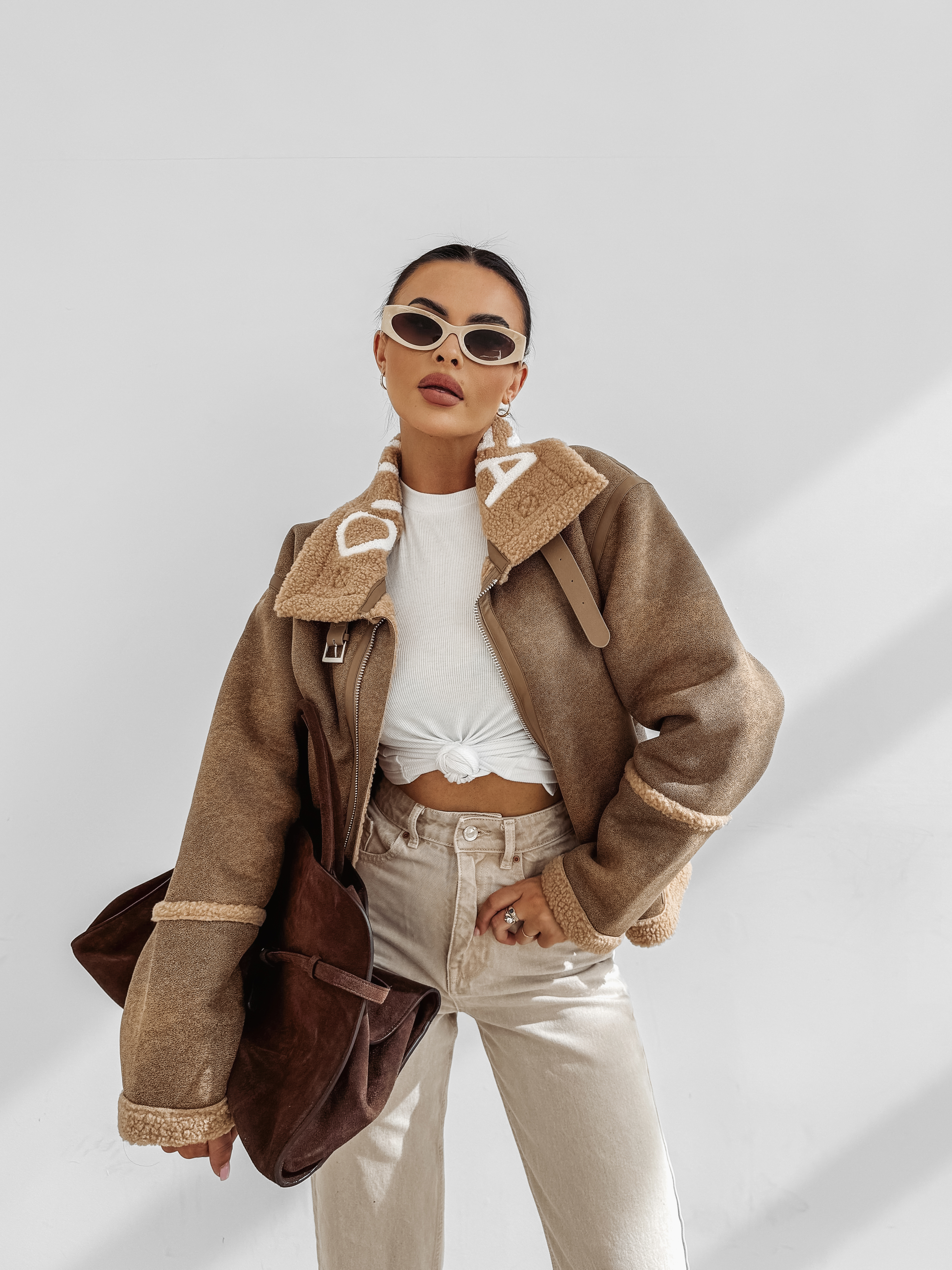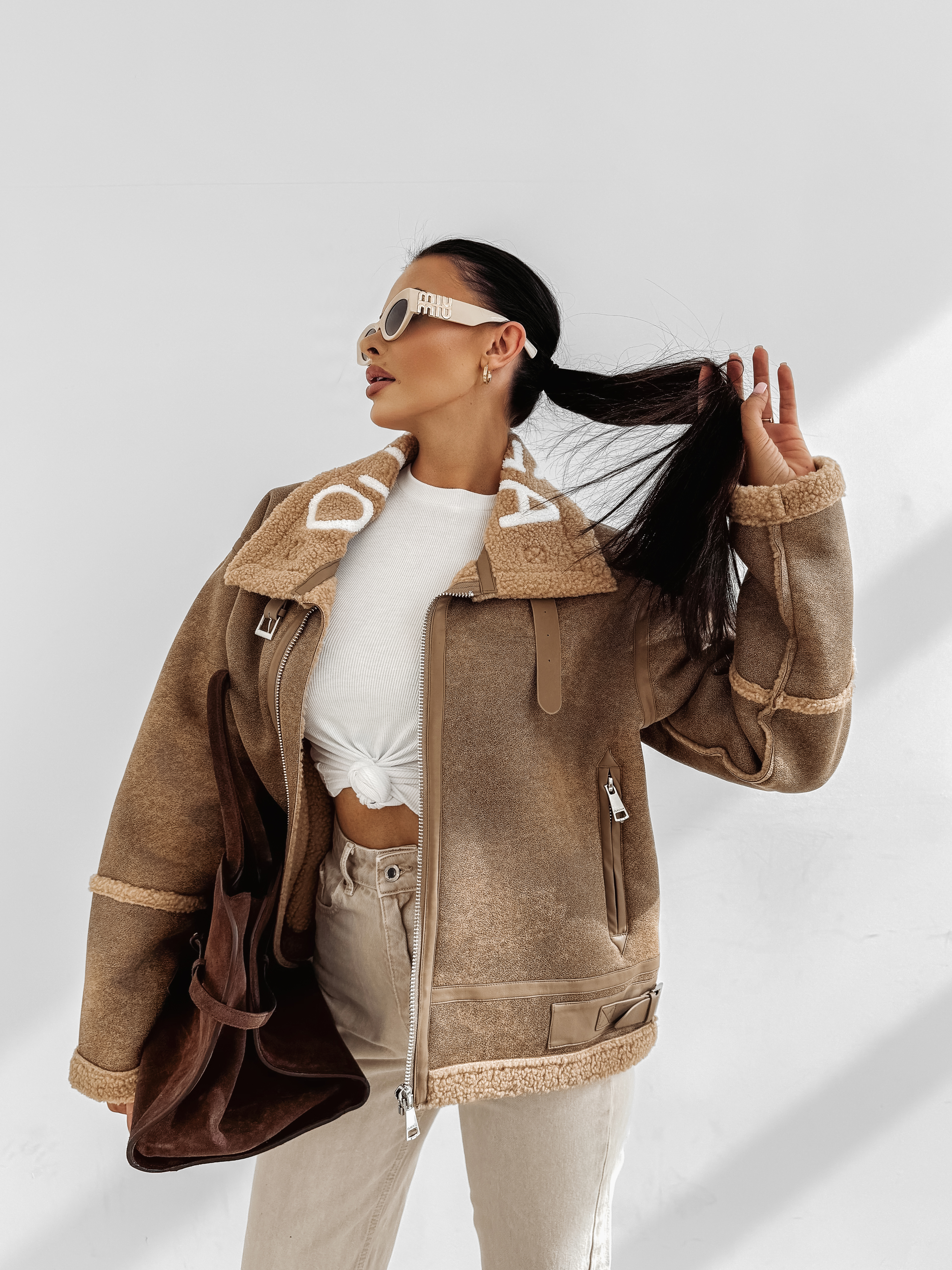 Kurtka damska, utrzymana w klasycznym stylu. Wykonana z materiału imitującego skórę, z ocieplanym wnętrzem wykończonym miękkim kożuszkiem. Posiada prosty, lekko oversize’owy krój. Charakterystyczny, logowany kołnierz z klamrą, regulowane paski po bokach oraz wywijane mankiety. Zapinana na solidny suwak, z wyraźnymi przeszyciami i detalami. Produkt idealny dla niej i dla niego.