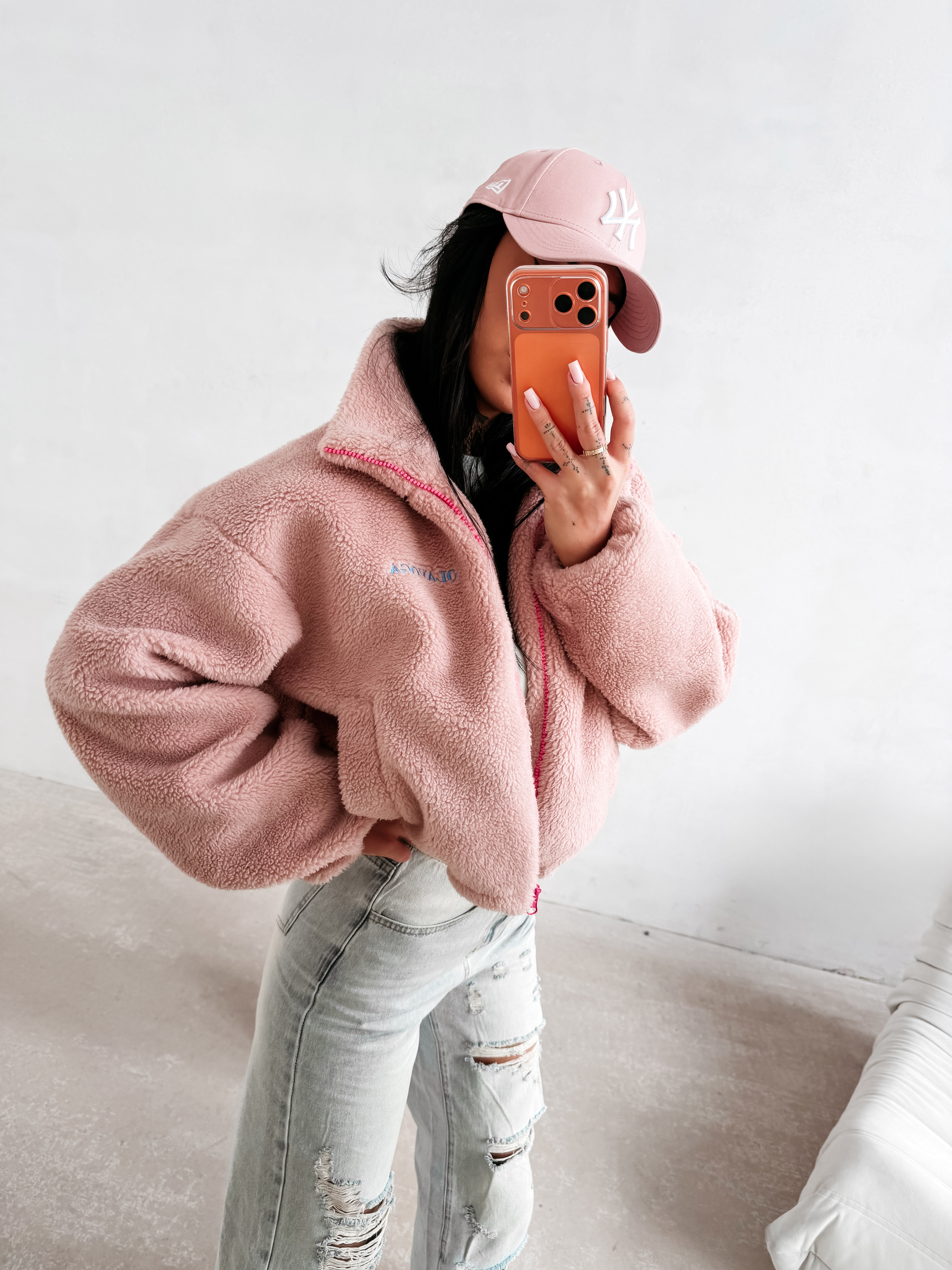 Casualowa kurtka, typu teddy z wysoką stójką, zapinana na zamek. Wykonana z miękkiego, przyjemnego w dotyku materiału o strukturze sherpa. Model o lekko krótszym kroju z obniżoną linią ramion. Po bokach praktyczne kieszenie. Na przodzie subtelny haft z logo marki OLAVOGA, natomiast na plecach efektowny, duży haft z inicjałami OLV.
