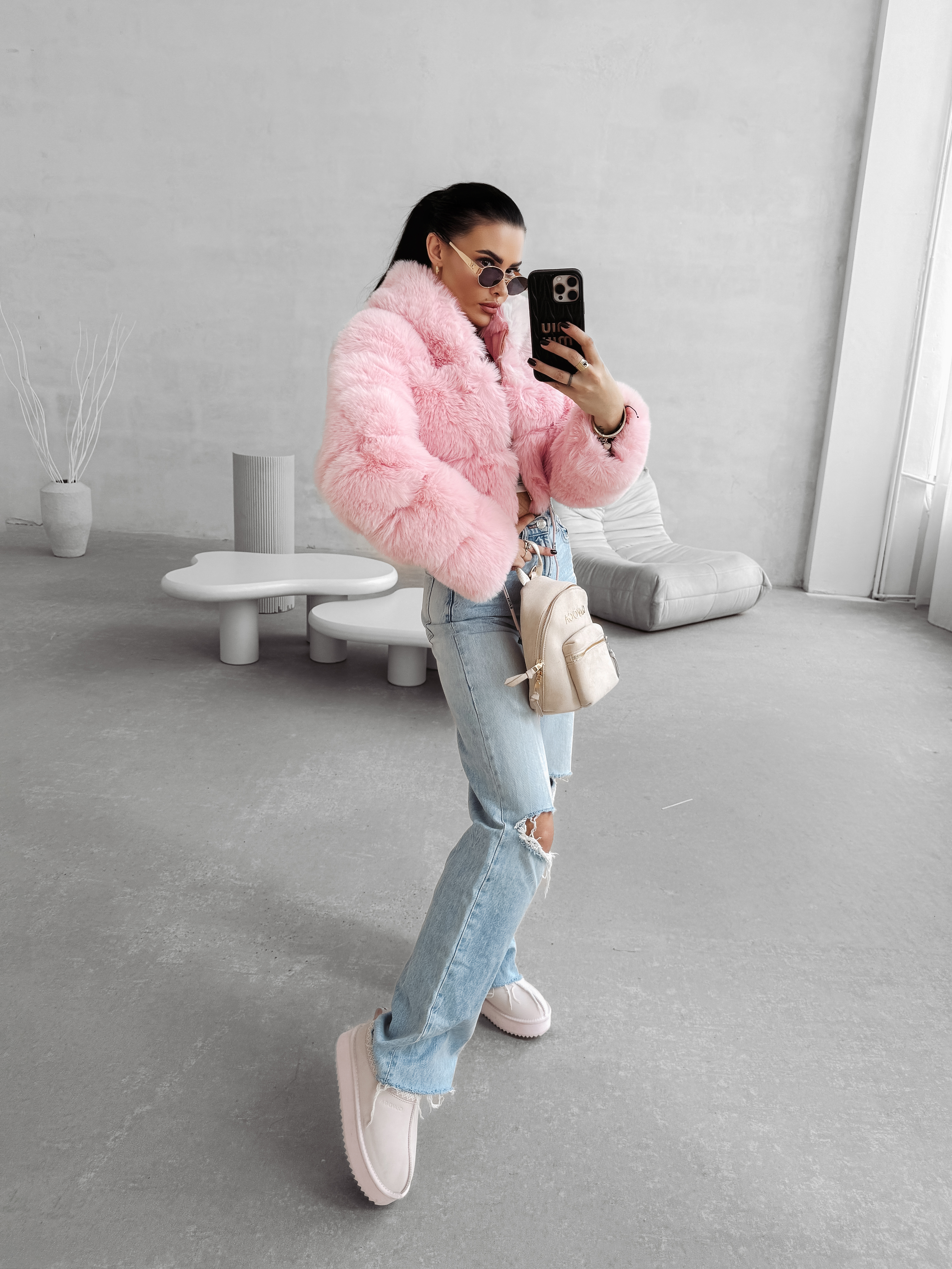 Kurtka damska, o krótszym kroju. Wykonana z wysokiej jakości miękkiego, gęstego futerka o luksusowym połysku i wyjątkowej strukturze. Złote logo marki OLAVOGA, ozdobne troczki z sygnaturą brandu i eleganckimi metalowymi zakończeniami.