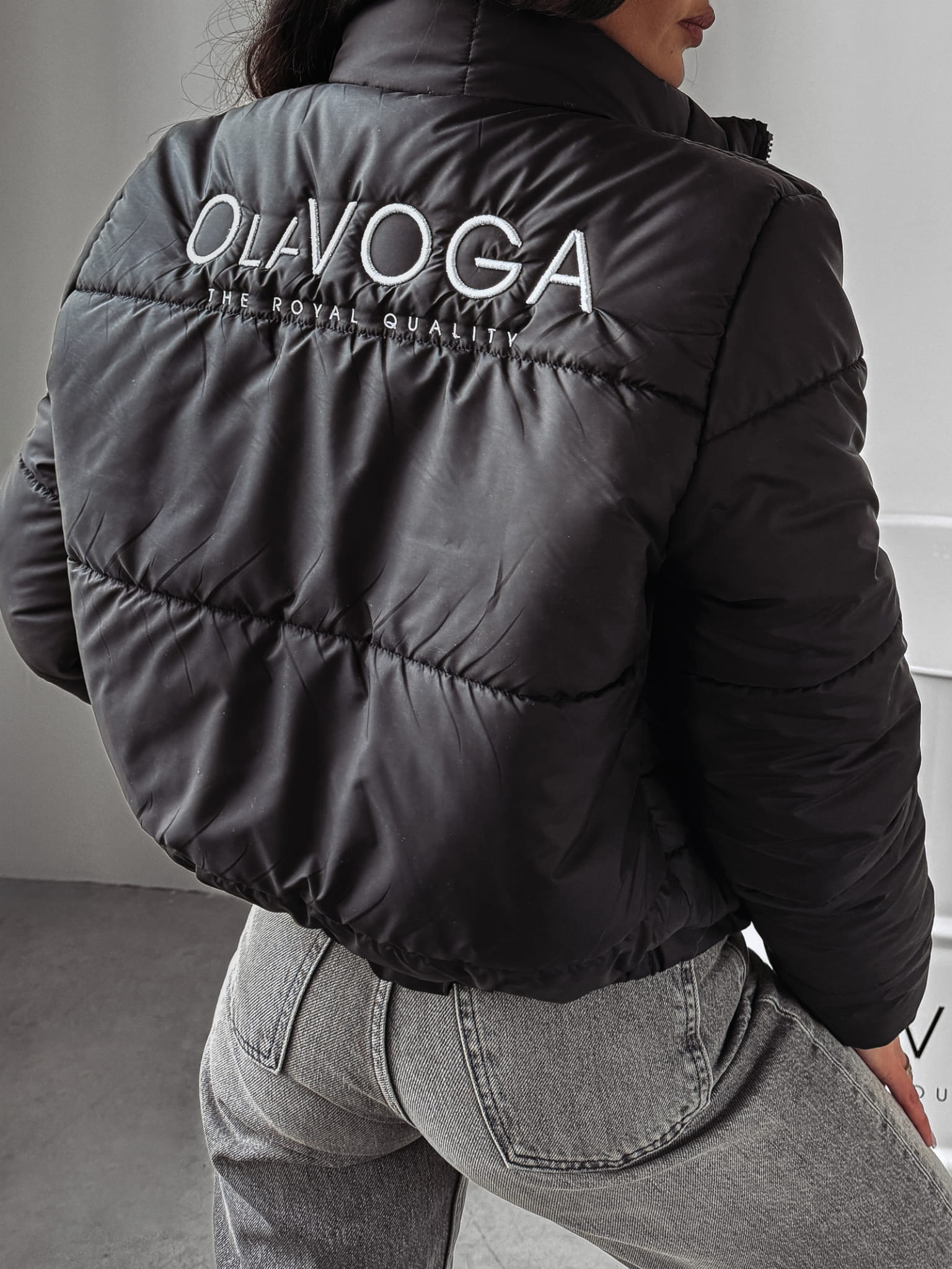 Pikowana kurtka w stylu bomber jacket. Długość sięgająca talii, na przodzie dwie kieszenie zapinane na zamek. Wysoki kołnierz. Na przodzie haftowany napis OLAVOGA. Z tyłu produktu obszerne, haftowane logo marki oraz minimalistyczne THE ROYAL QUALITY.