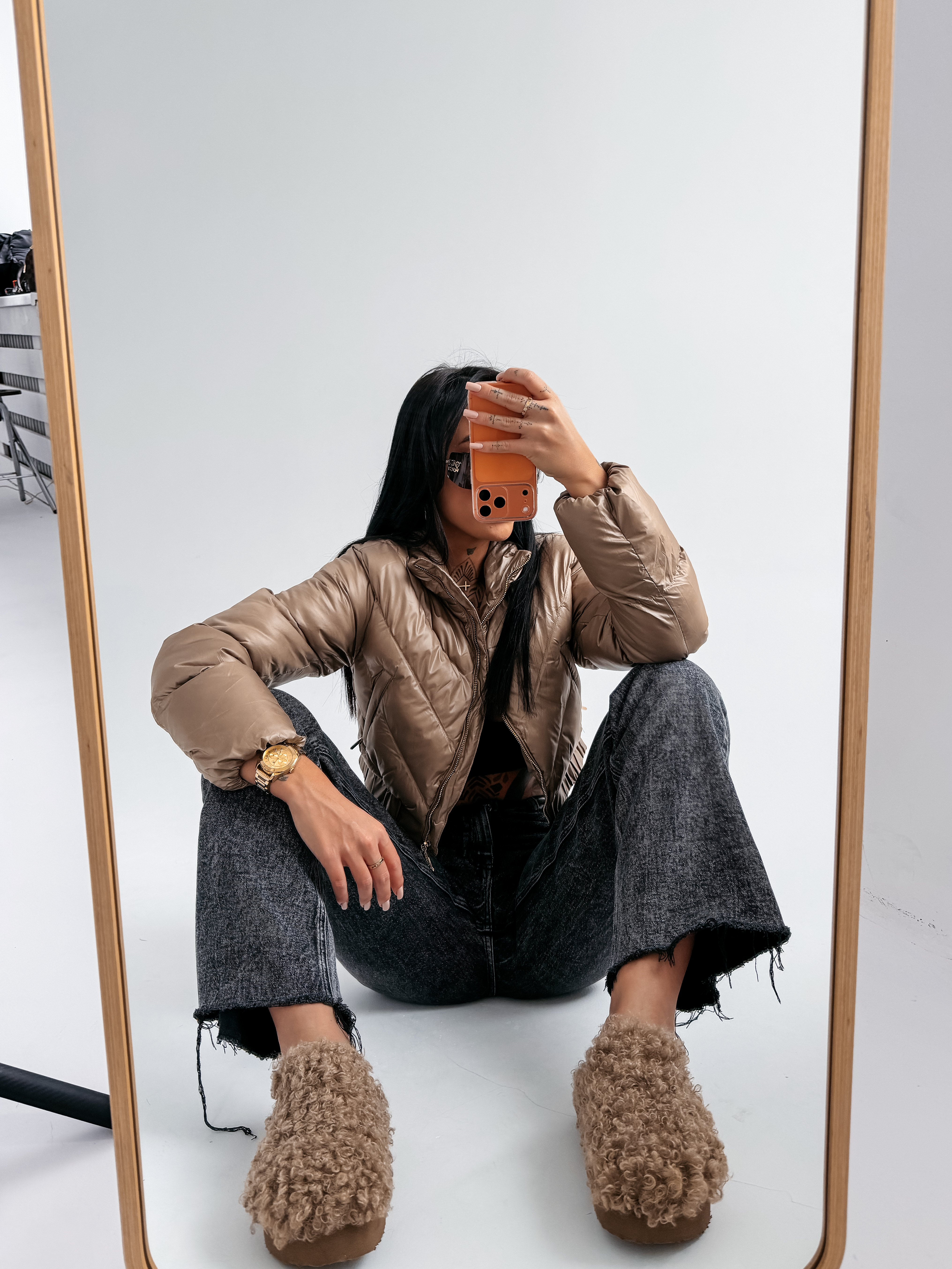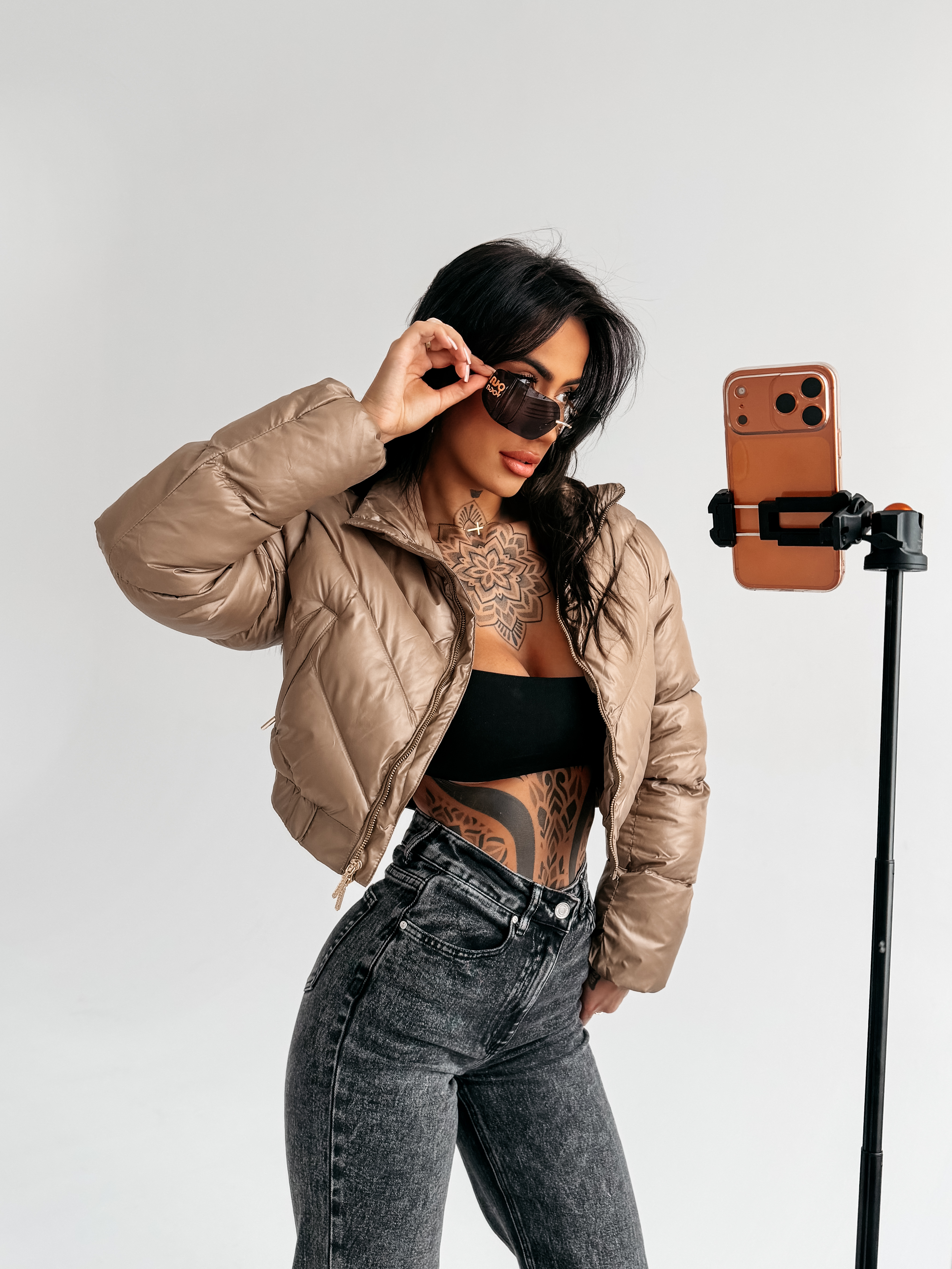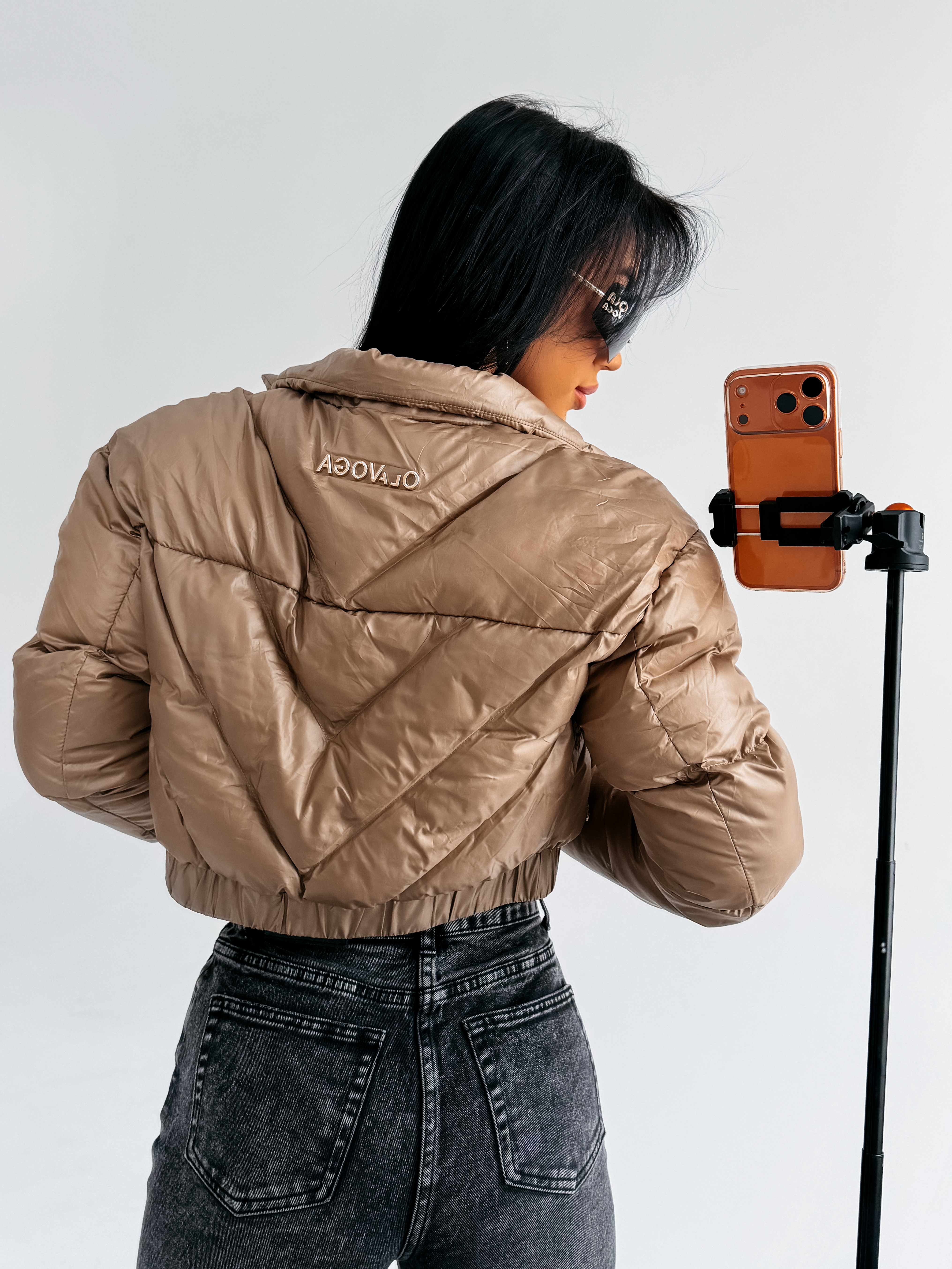 Pikowana kurtka o nowoczesnym, lekko skróconym kroju. Model wykonany z gładkiej, lekko połyskującej tkaniny. Kurtka zapinana na solidny, złoty zamek z logo marki OLAVOGA. Model z wysoką stójką. Brzegi zakończone elastycznym wykończeniem. Na tyle umieszczone subtelne, złote logo marki OLAVOGA. Kurtka posiada praktyczne kieszenie zapinane na zamek.