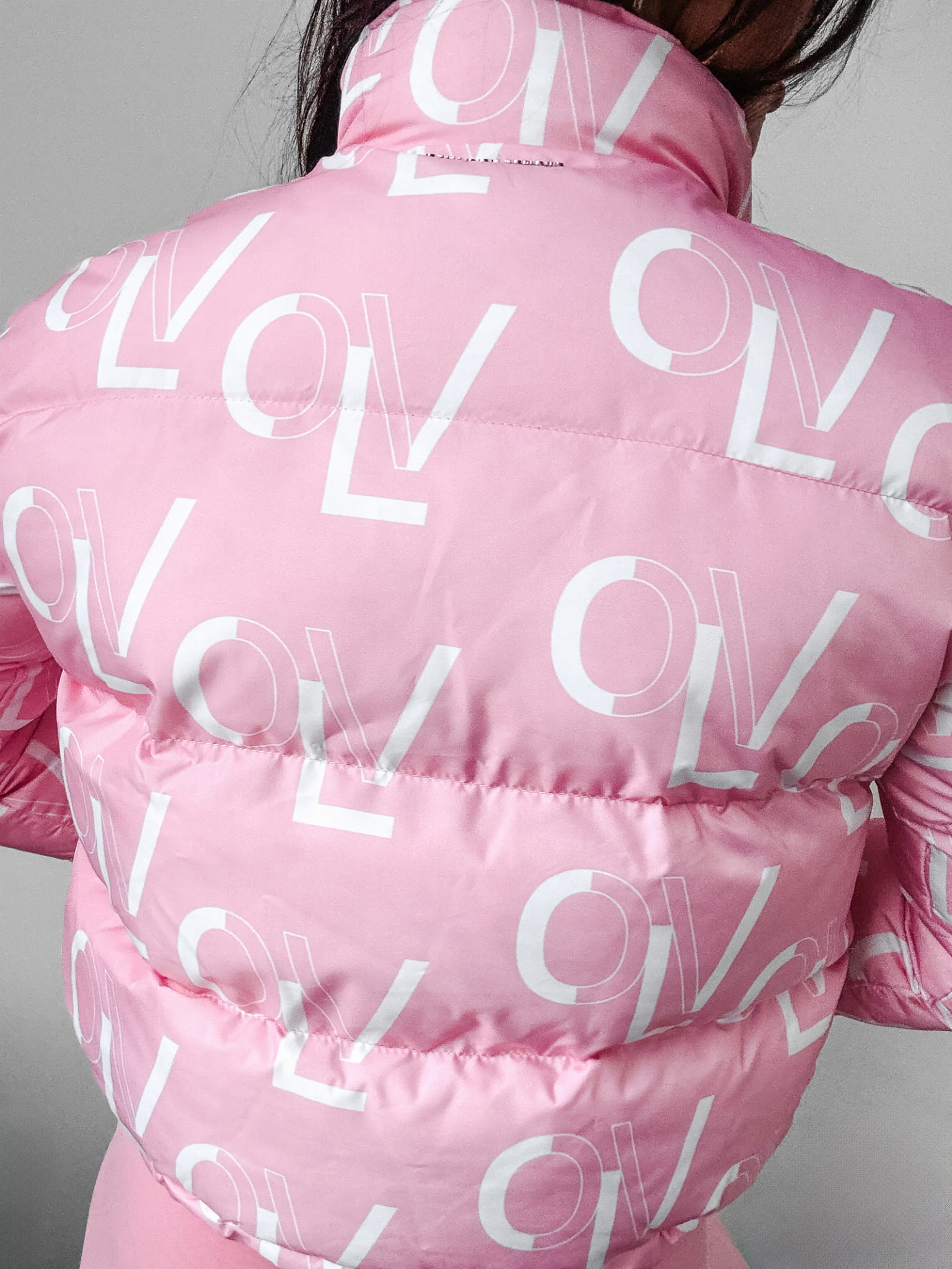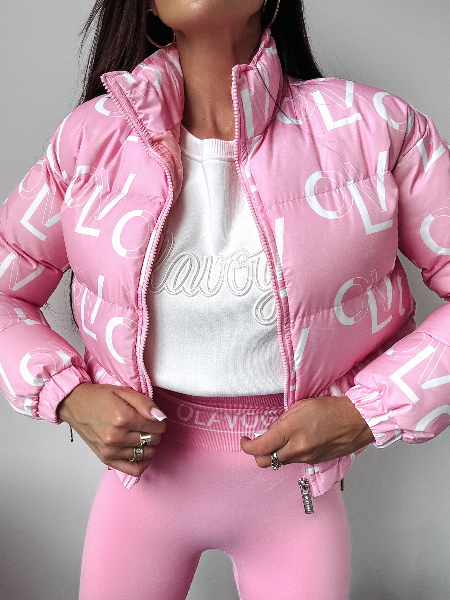 Pikowana kurtka w stylu bomber jacket. Długość sięgająca talii, którą można regulować. Wysoki kołnierz. Na przodzie haftowany napis OLAVOGA. Z tyłu produktu złoty napis OLAVOGA LUXURY. Kurtka posiada ciekawy print z logo marki.