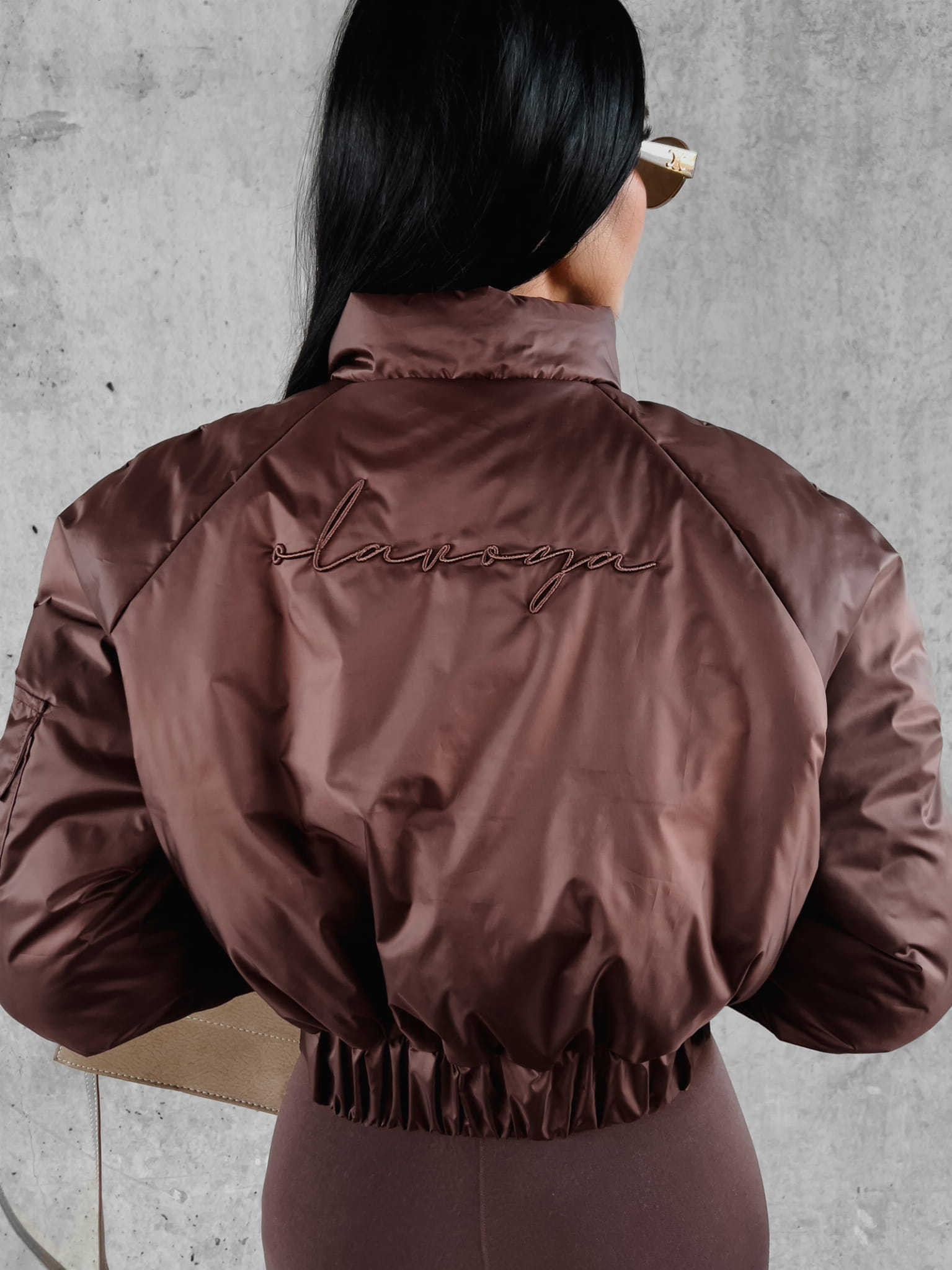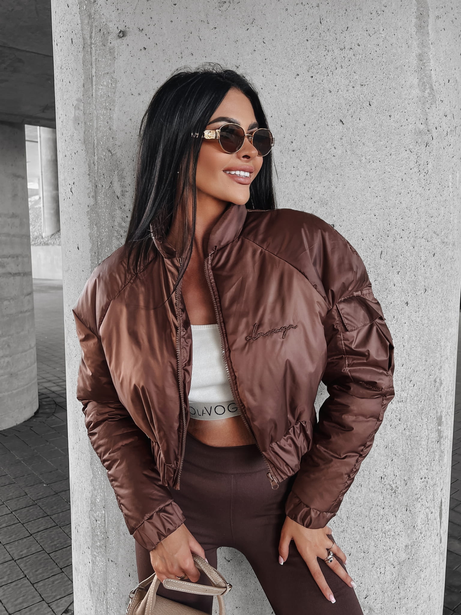Krótka, nylonowa kurtka, wygodne kieszenie, zapięcie na suwak. Fason – delikatny oversize. Na plecach i na przodzie haft z pisanym logo marki.