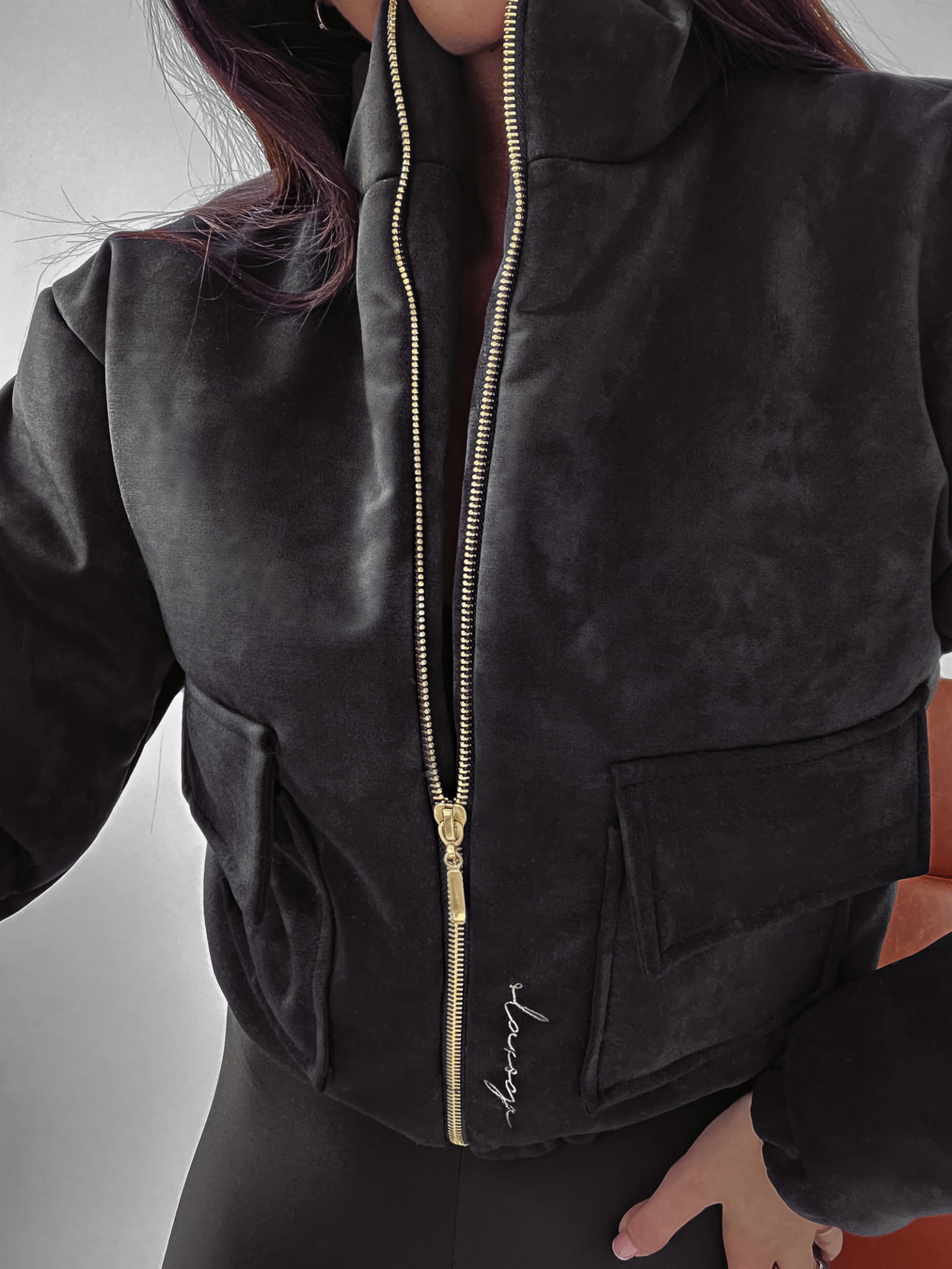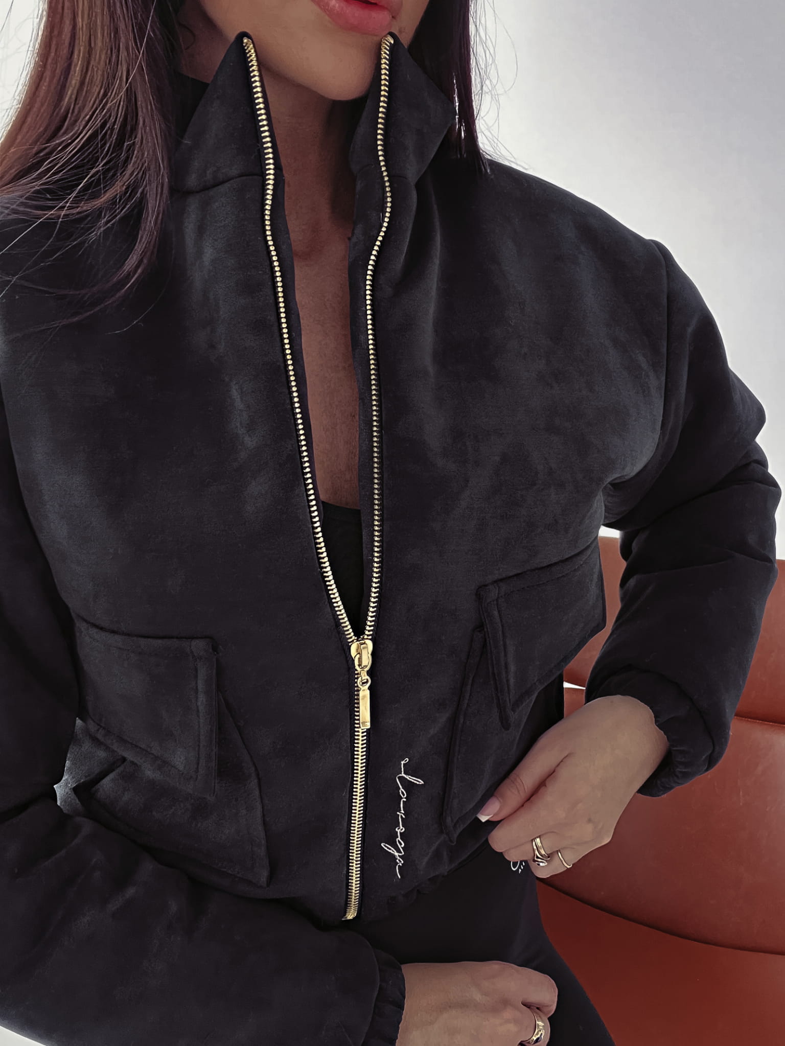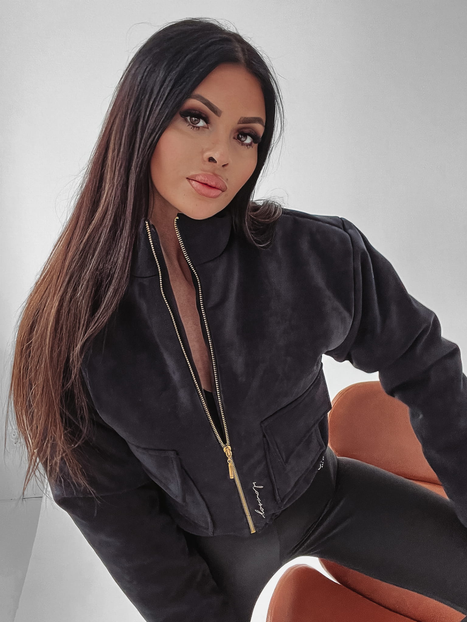 Krótka, wiosenna kurtka z wysokiej jakości zamszu, z dużymi kieszeniami na przodzie. Na karku i przy kieszeni wyhaftowane minimalistyczne, pisane logo marki OLAVOGA. Noś do jeansów, legginsów, czy ukochanych dresów.