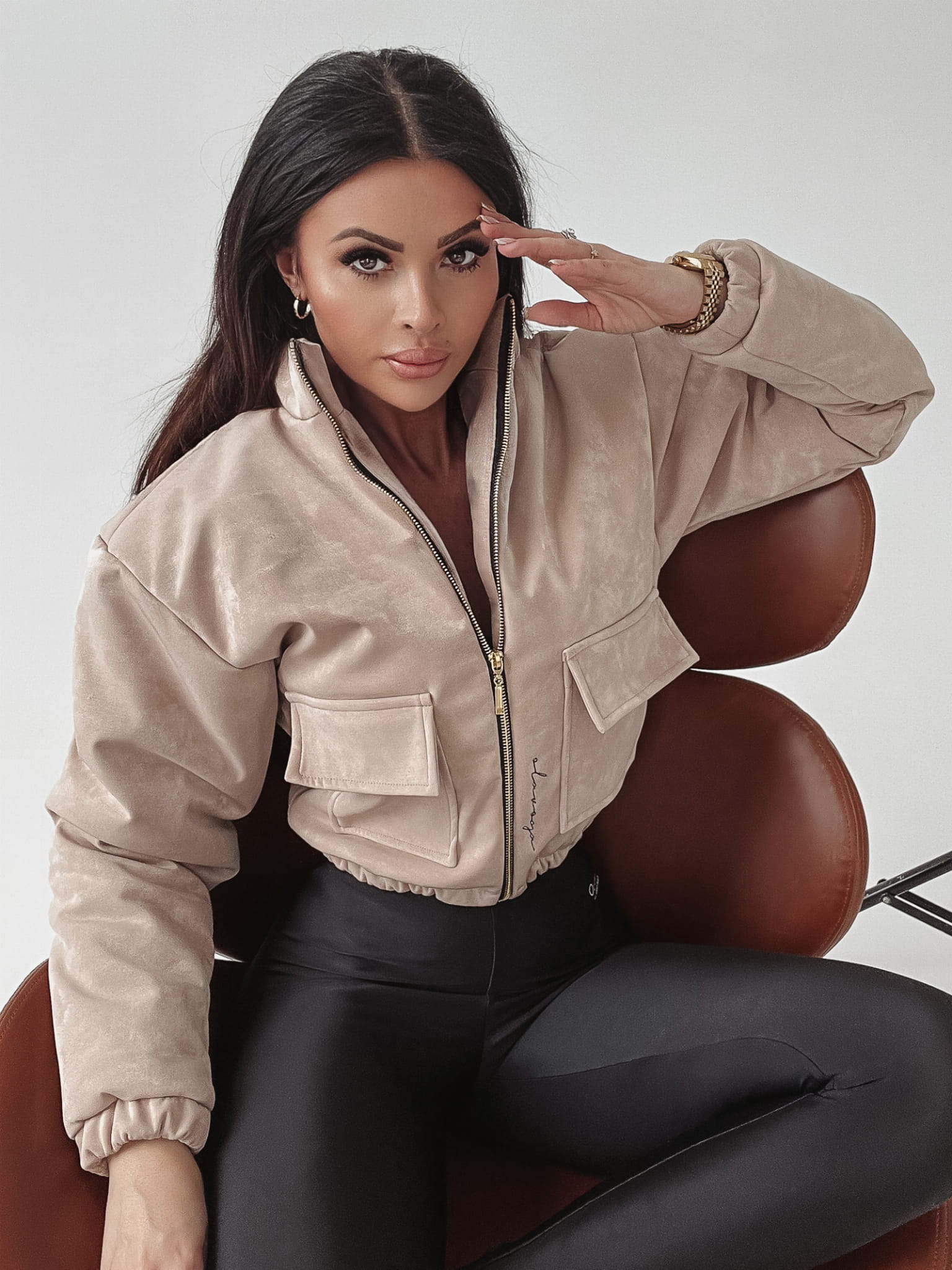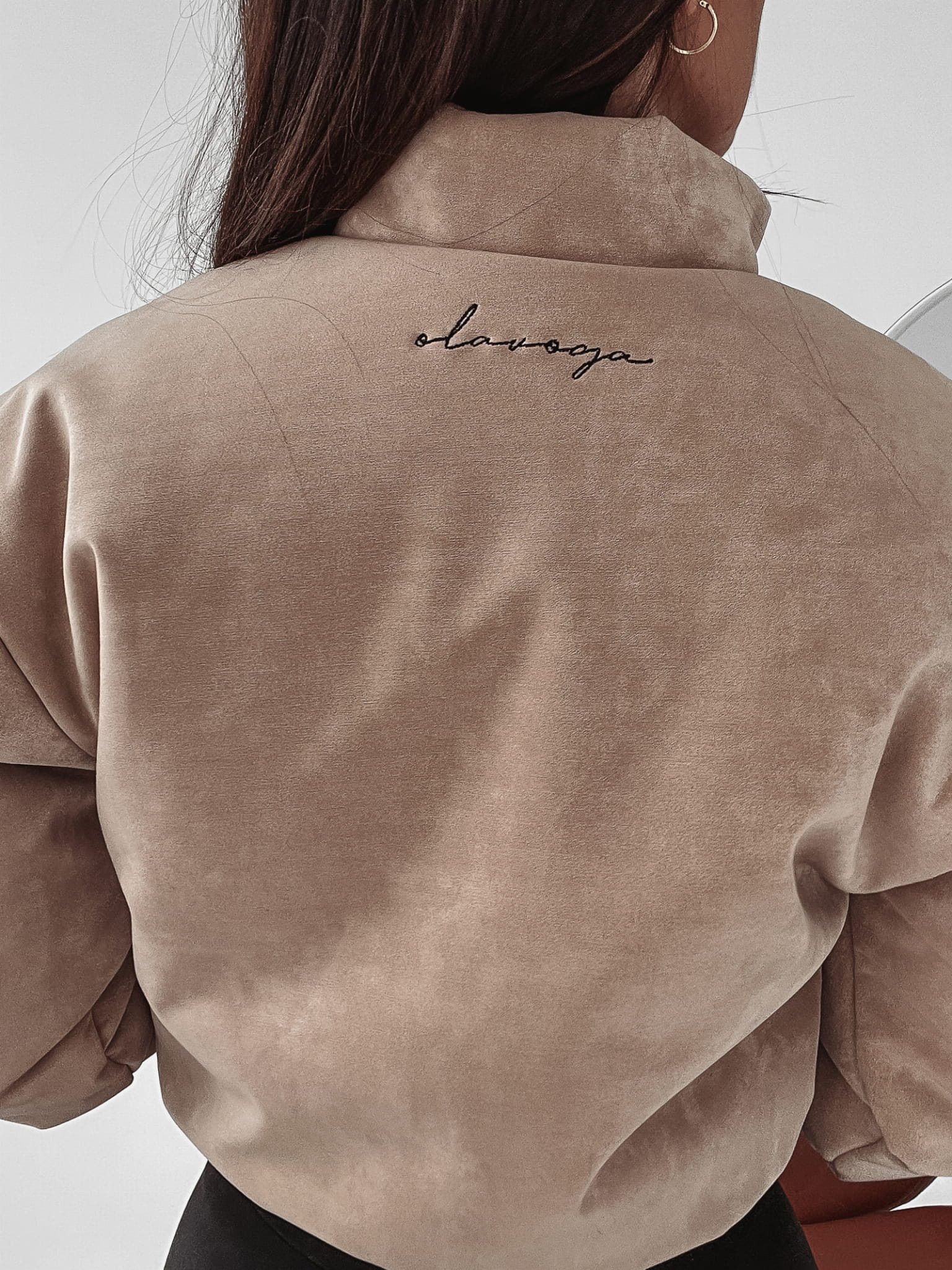 Krótka, wiosenna kurtka z wysokiej jakości zamszu, z dużymi kieszeniami na przodzie. Na karku i przy kieszeni wyhaftowane minimalistyczne, pisane logo marki OLAVOGA. Noś do jeansów, legginsów, czy ukochanych dresów.