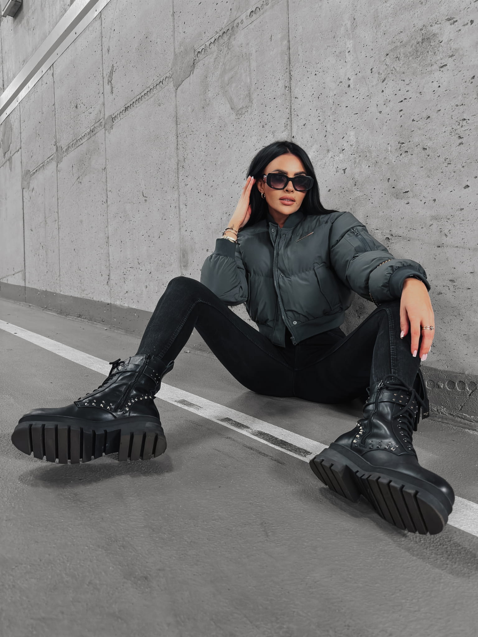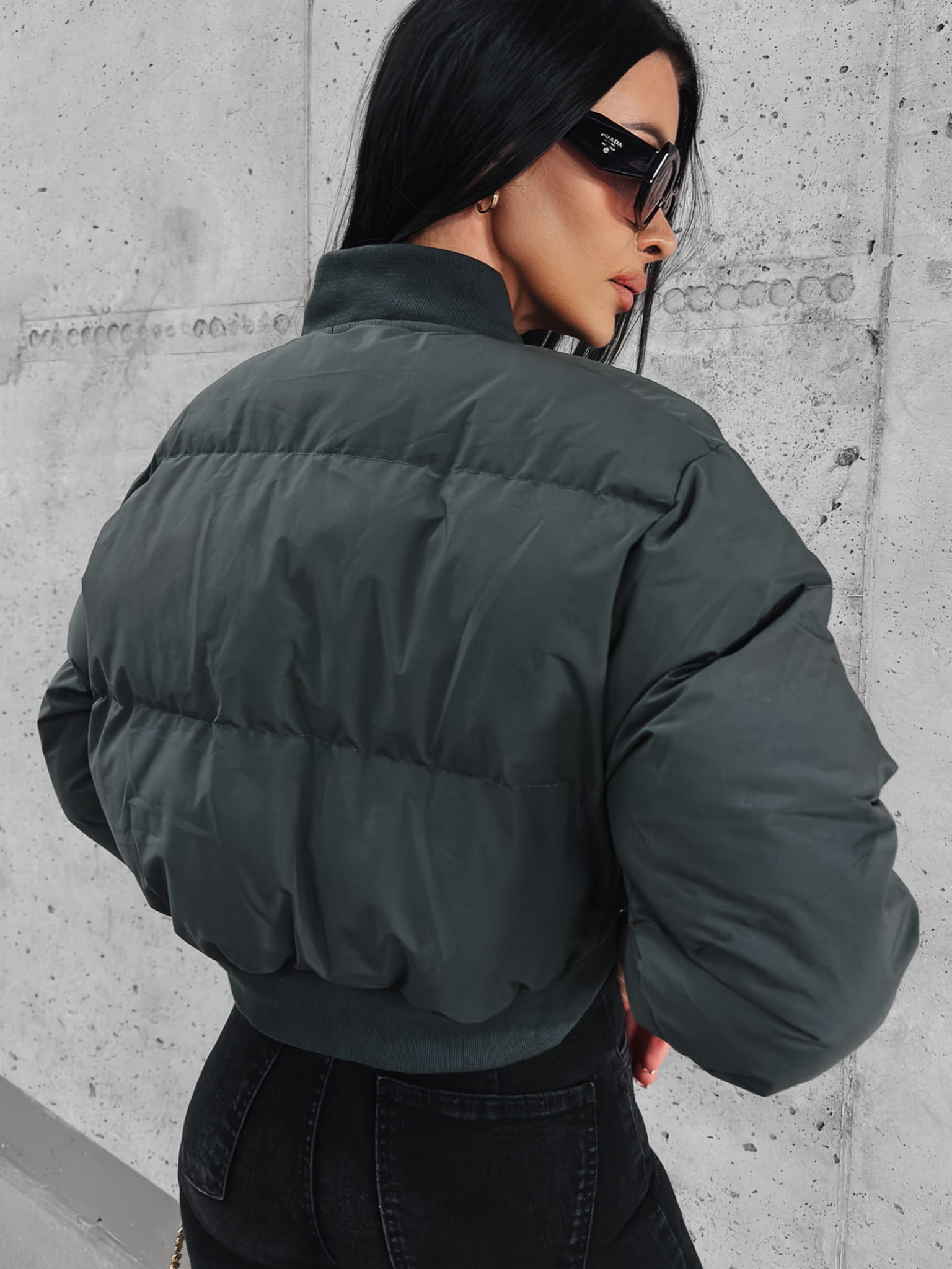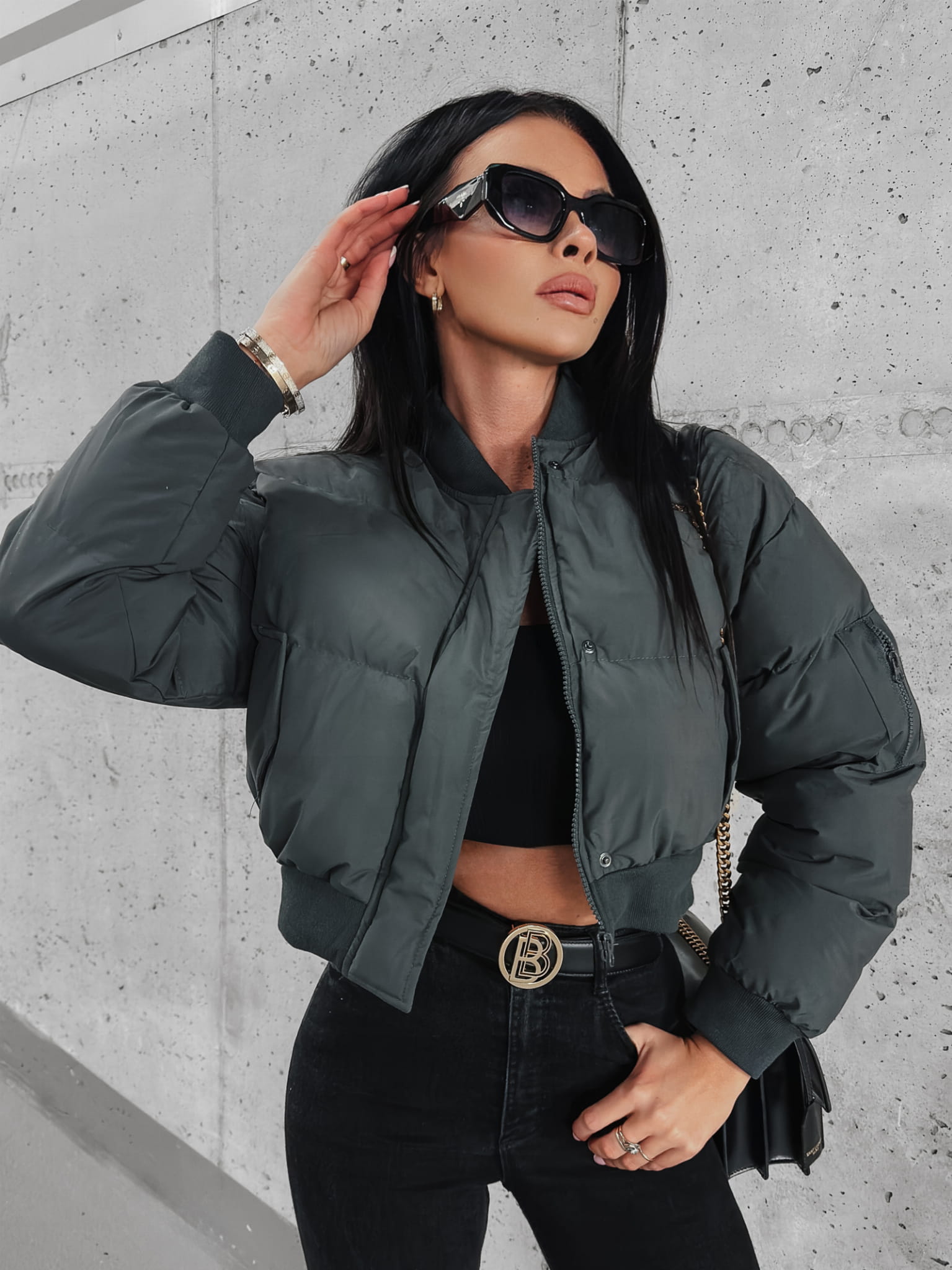 Krótka puchowa bomberka zakończona miękkim ściągaczem na rękawach i wysokości bioder. Zapinana na suwak i dodatkowo napy, po bokach dwie kieszenie.