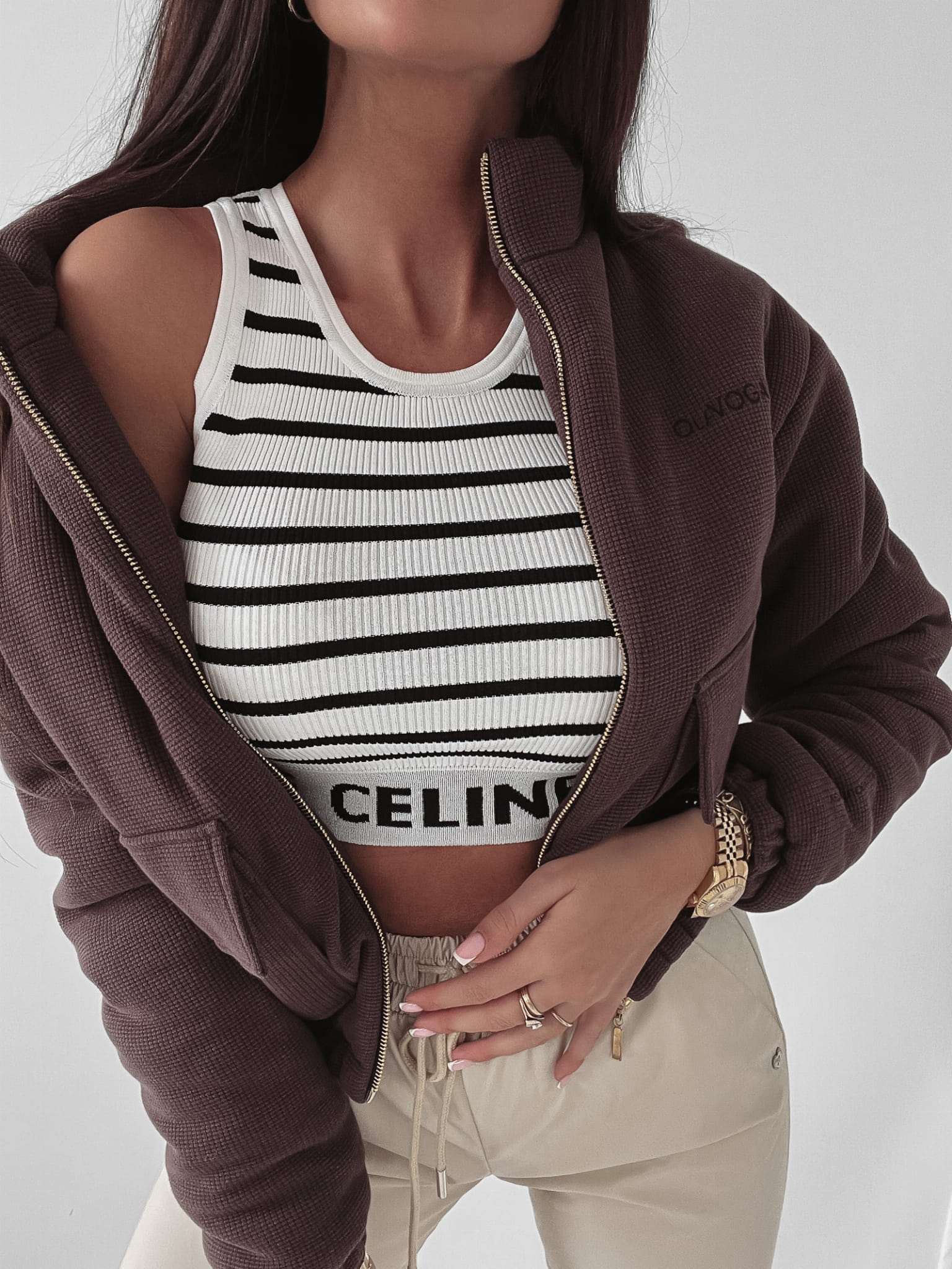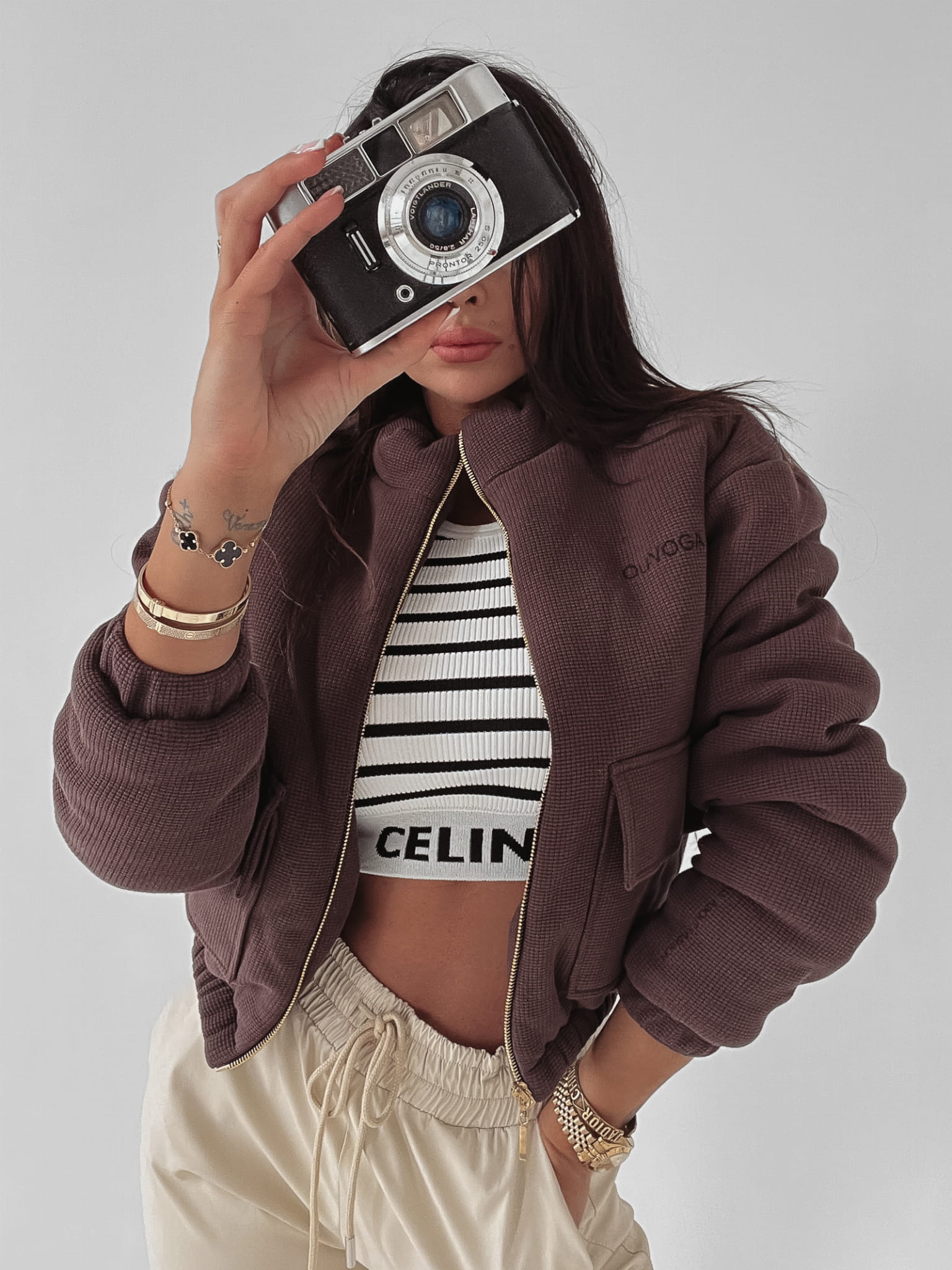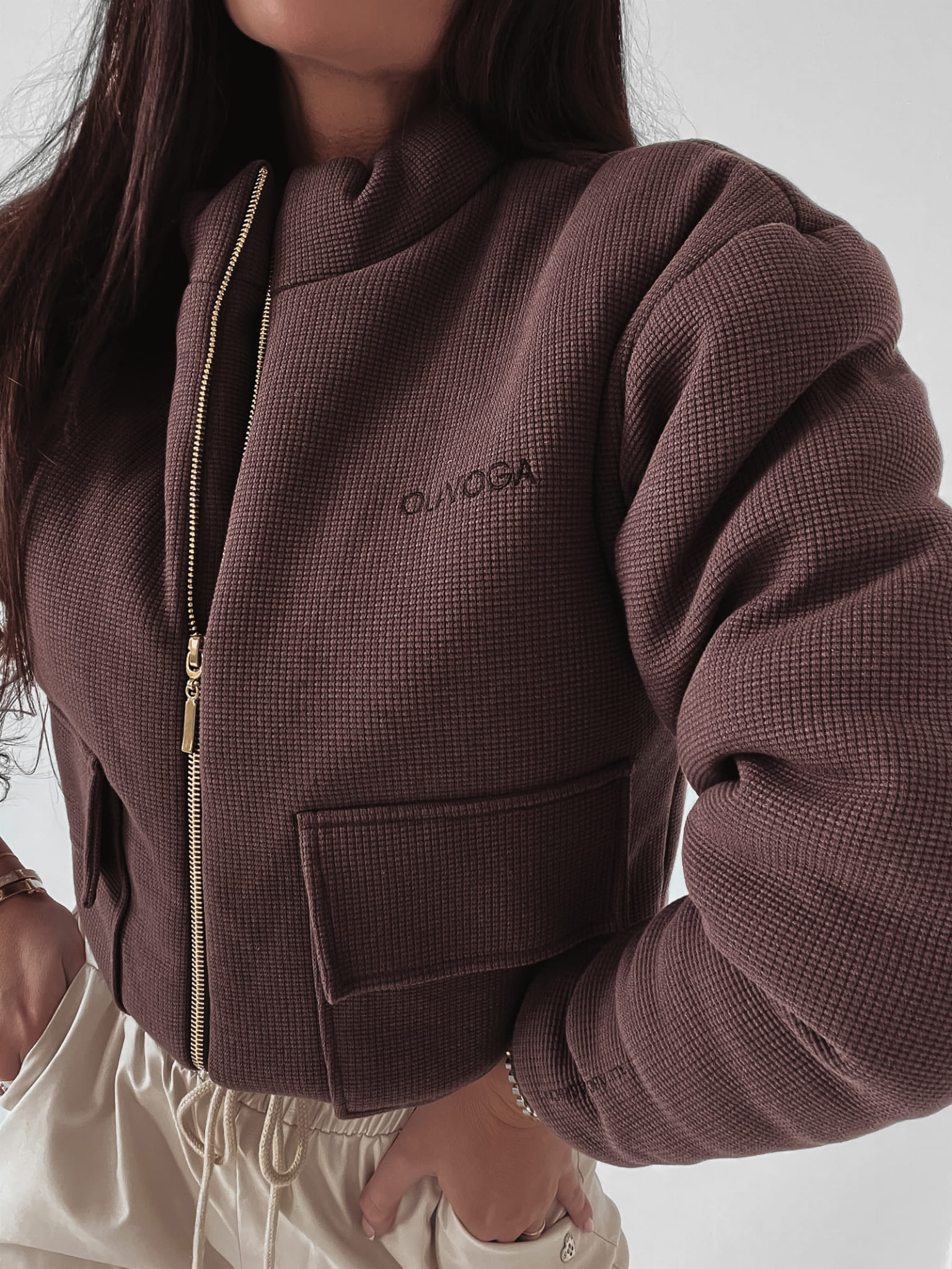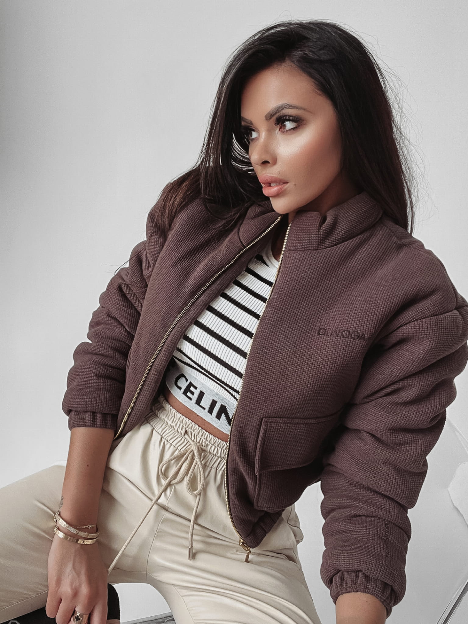 Krótka, sportowa kurtka uszyta z z ciekawej strukturalnej dzianiny typu wafelek. Na przodzie naszyte duże kieszenie z klapkami. Na rękawie i z przodu umieszczone logo marki. Kurtka pasuje świetnie do jeansów, spodni dresowych czy dopasowanych legginsów.