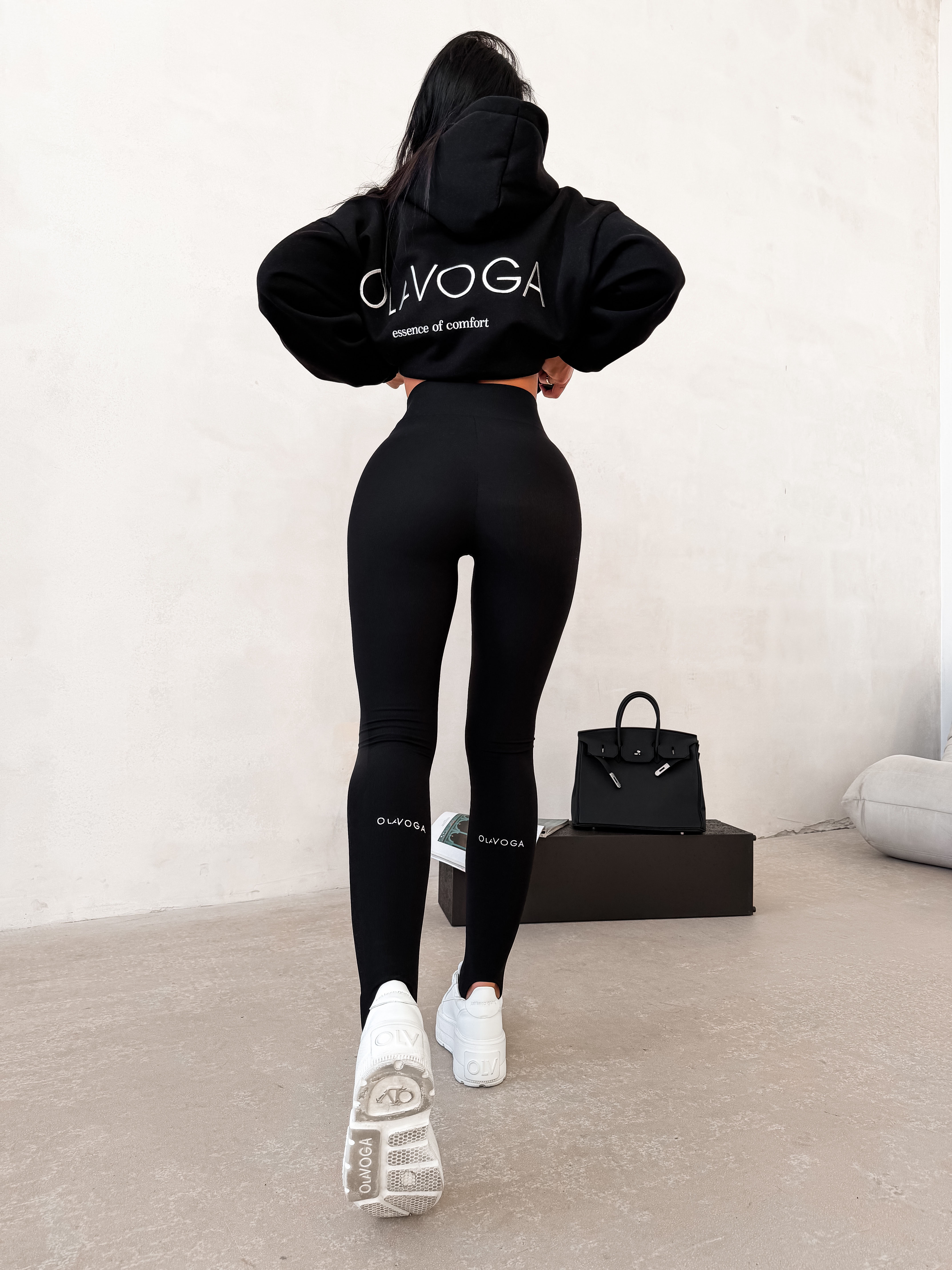 Idealnie dopasowane legginsy z wysokim stanem. Wykonane z wysokiej jakości elastycznego materiału. Z tyłu, na wysokości łydek, umieszczony haft z logo marki OLAVOGA po obu stronach nogawek. Posiada dłuższy materiał, który pozwala założyć na piętę.