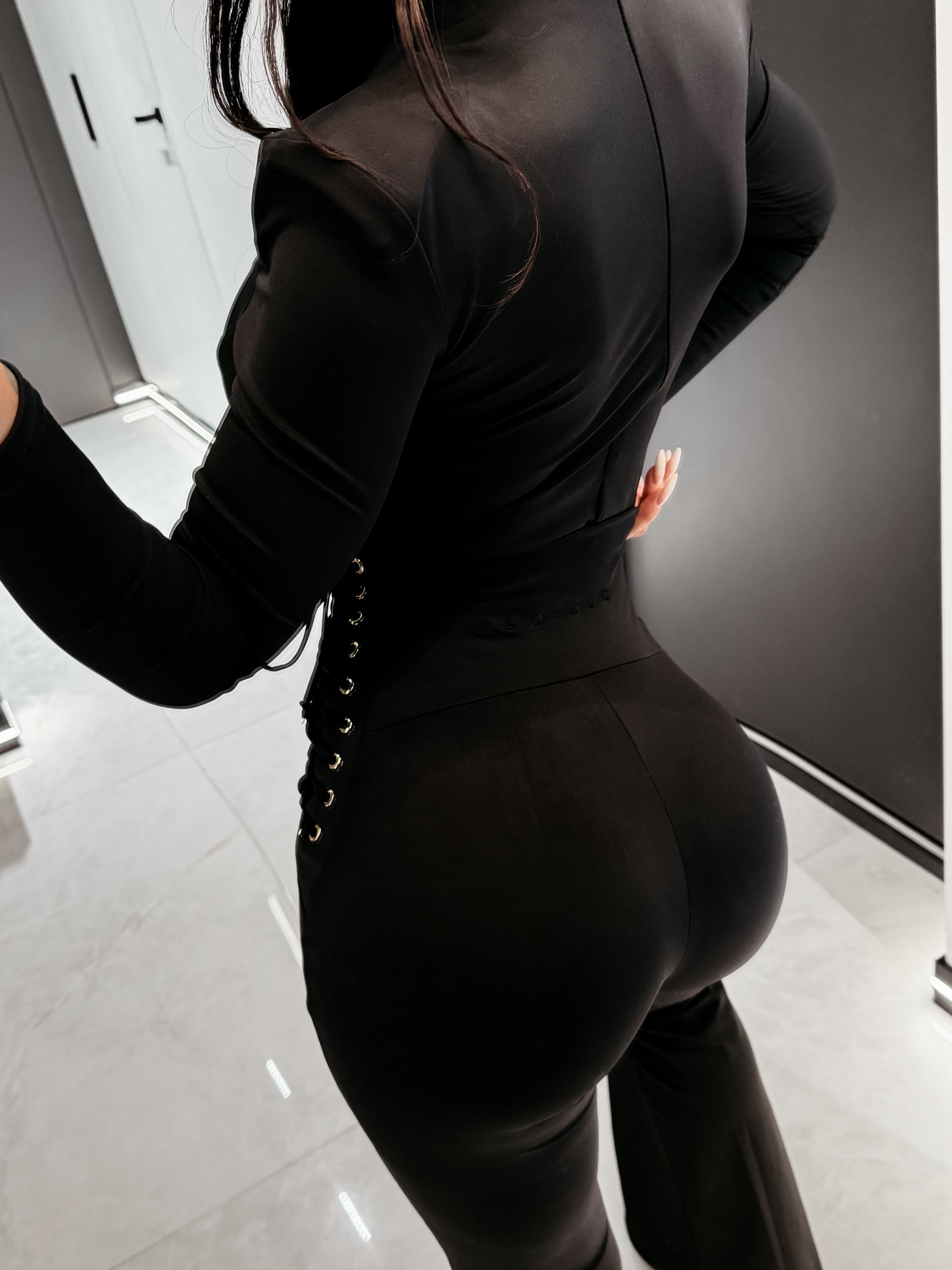 Przylegający krój - wysoki stan - nogawka typu flare - boczne wiązania ze złotymi oczkami - modelująca konstrukcja - na tyle subtelne logo w kolorze