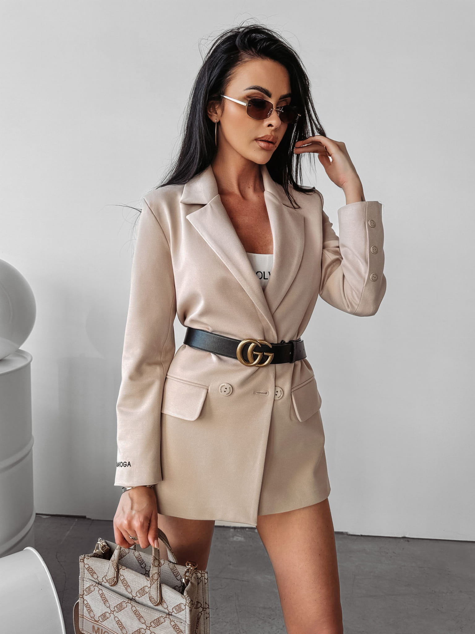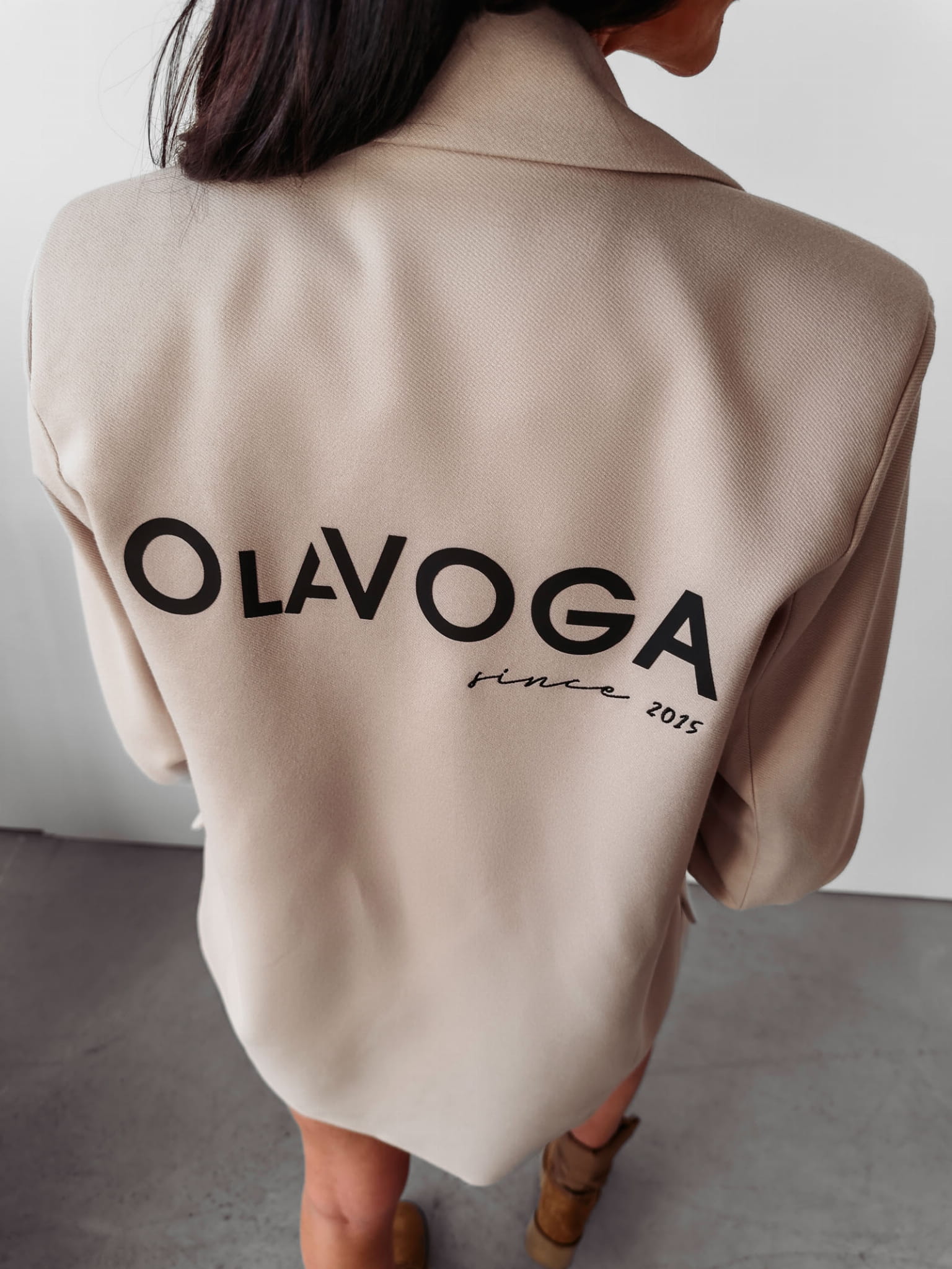 Oversizowa, obszerna marynarka z czarnym, obszernym nadrukiem loga na tyle modelu. Niewielkie logo również na rękawie. Logowane guziki. Gładki, casualowy model, uszyty na podszewce.