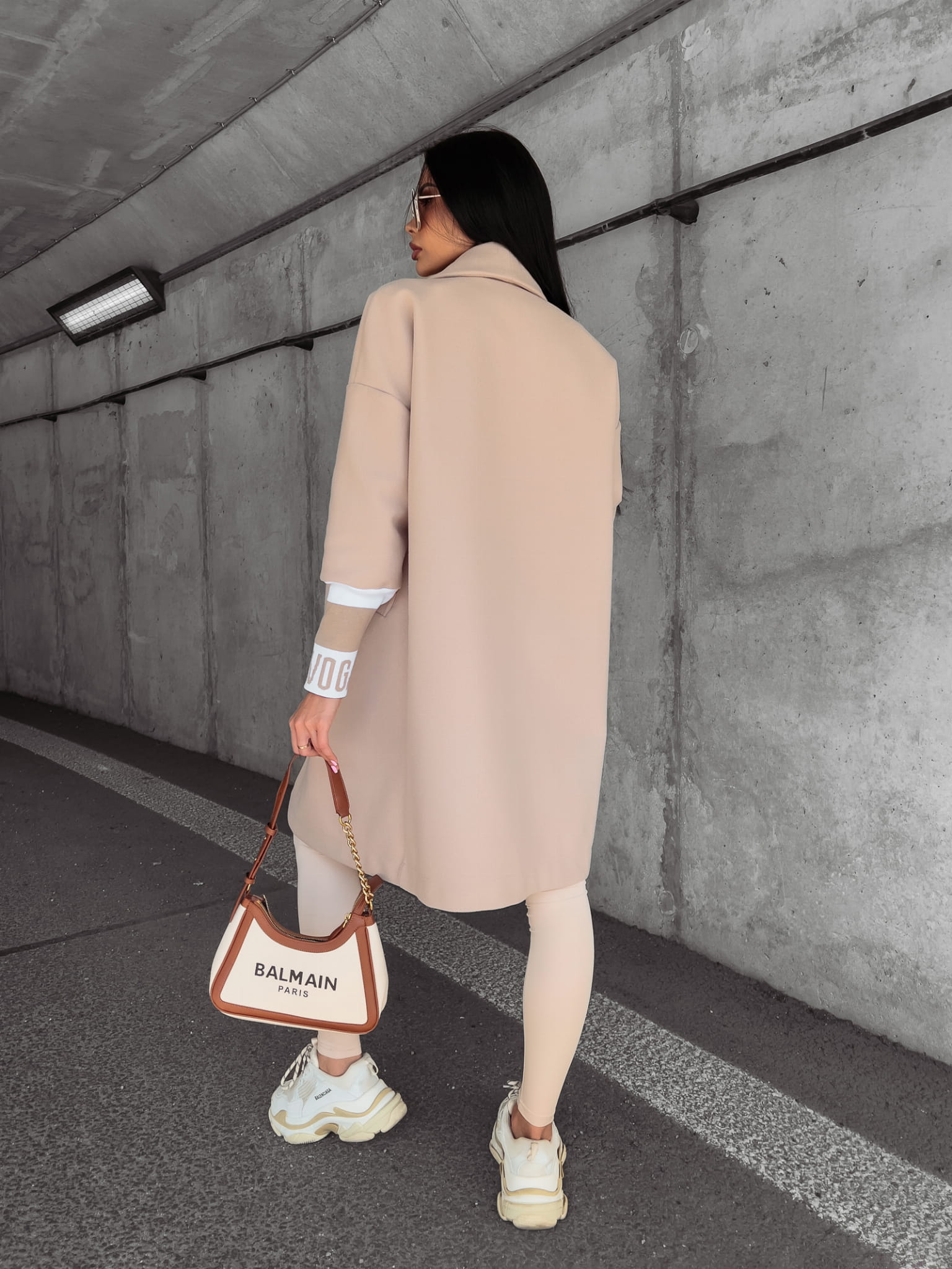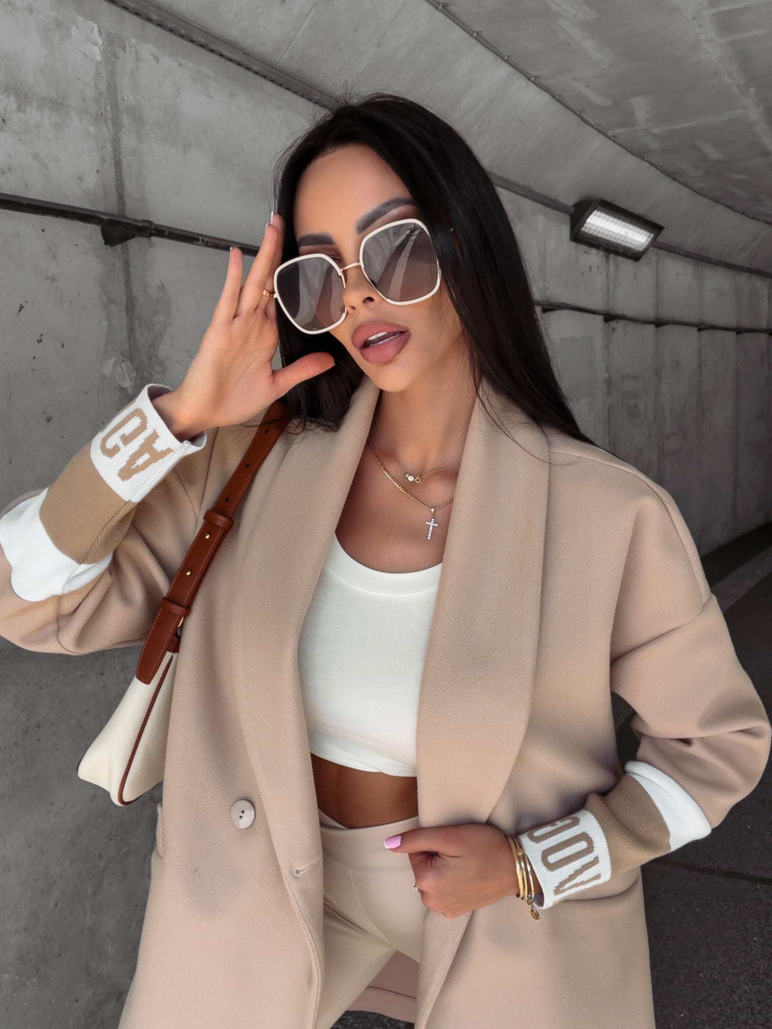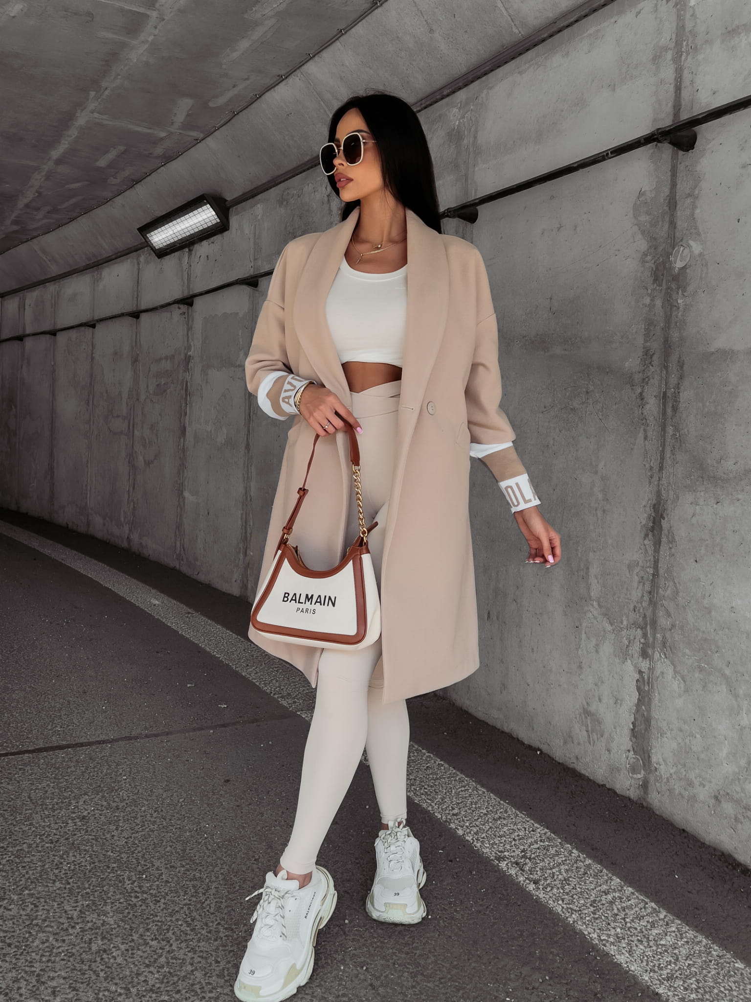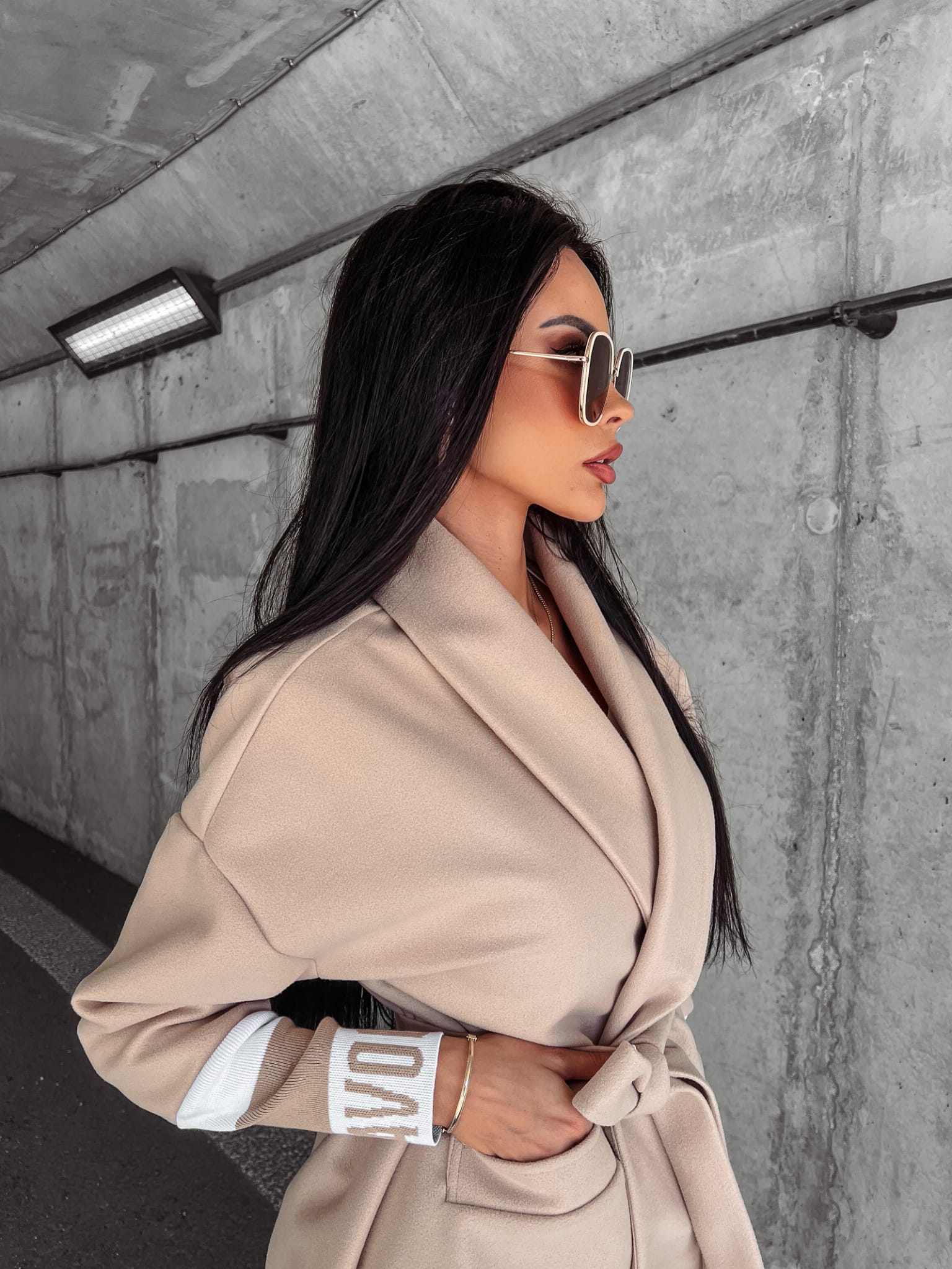 Stylowy, lekko oversiz’owy płaszcz z flauszu z domieszką wełny, przewiązywany w pasie. Na rękawach druk OLAVOGA, w kontrastowym odcieniu. Model bez podszewki.