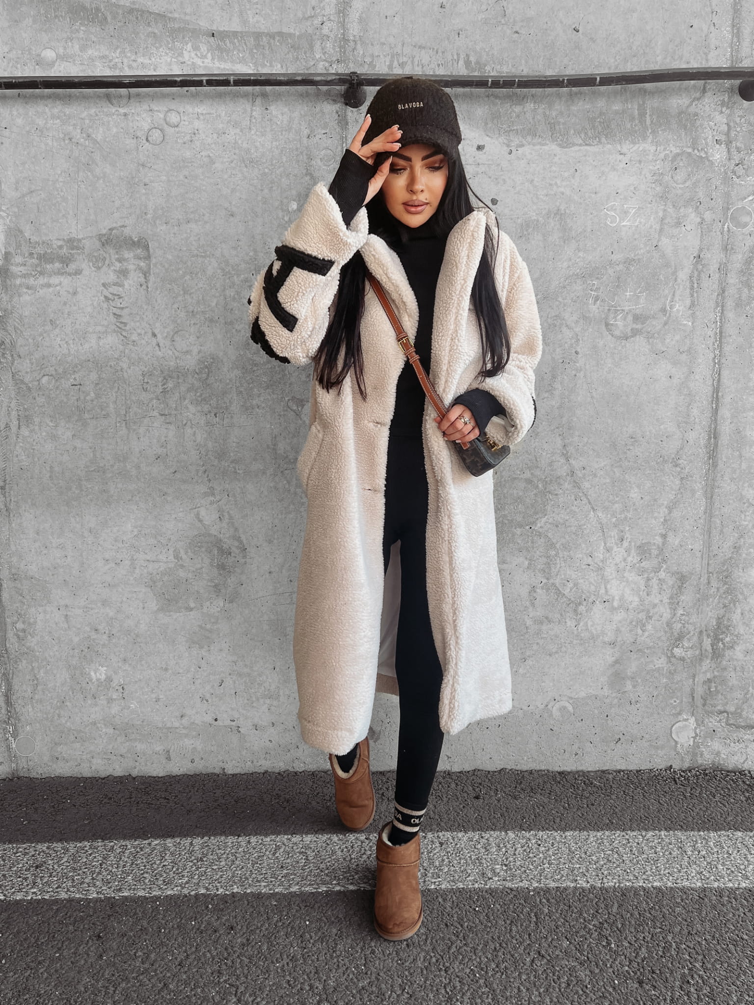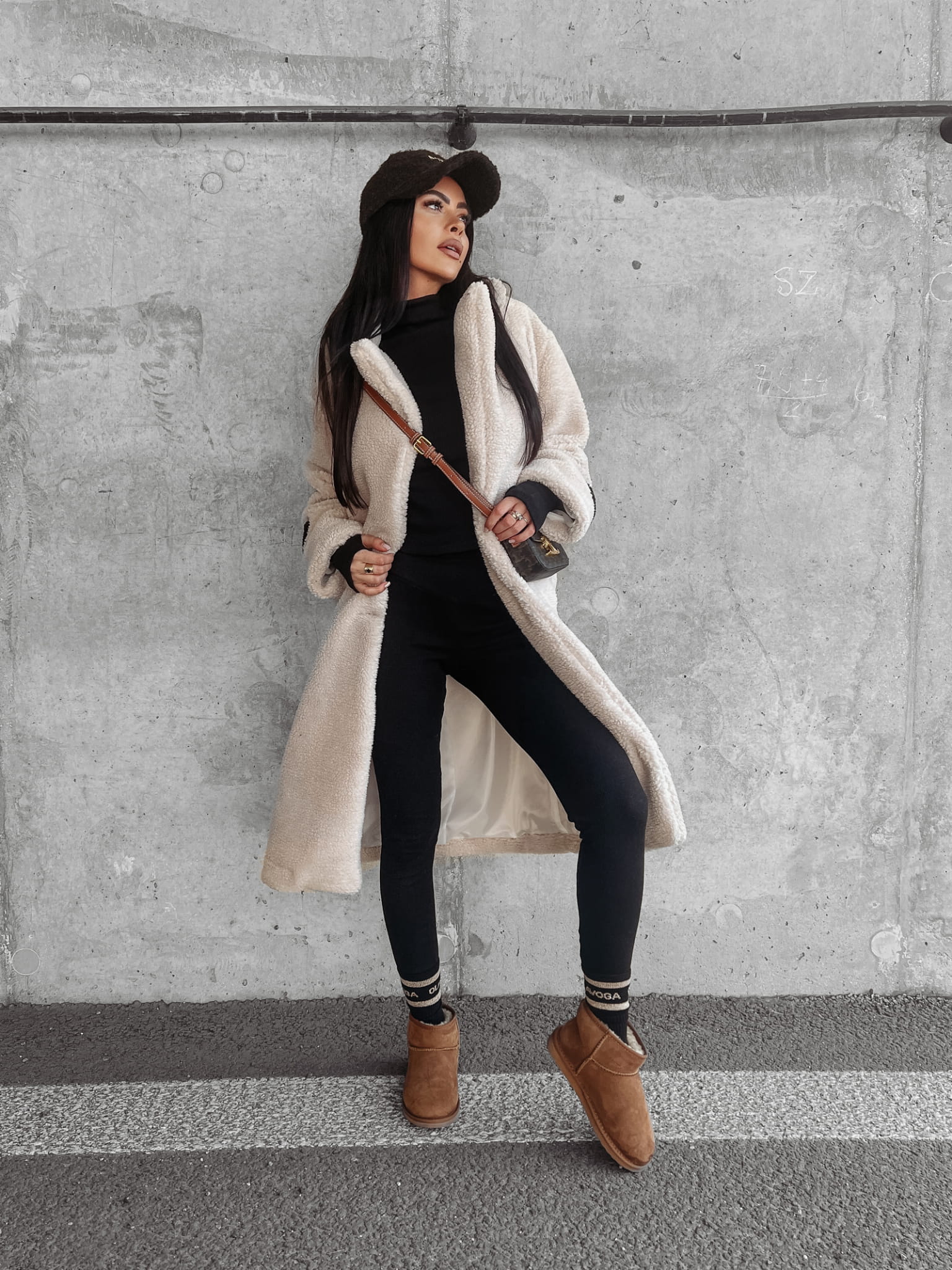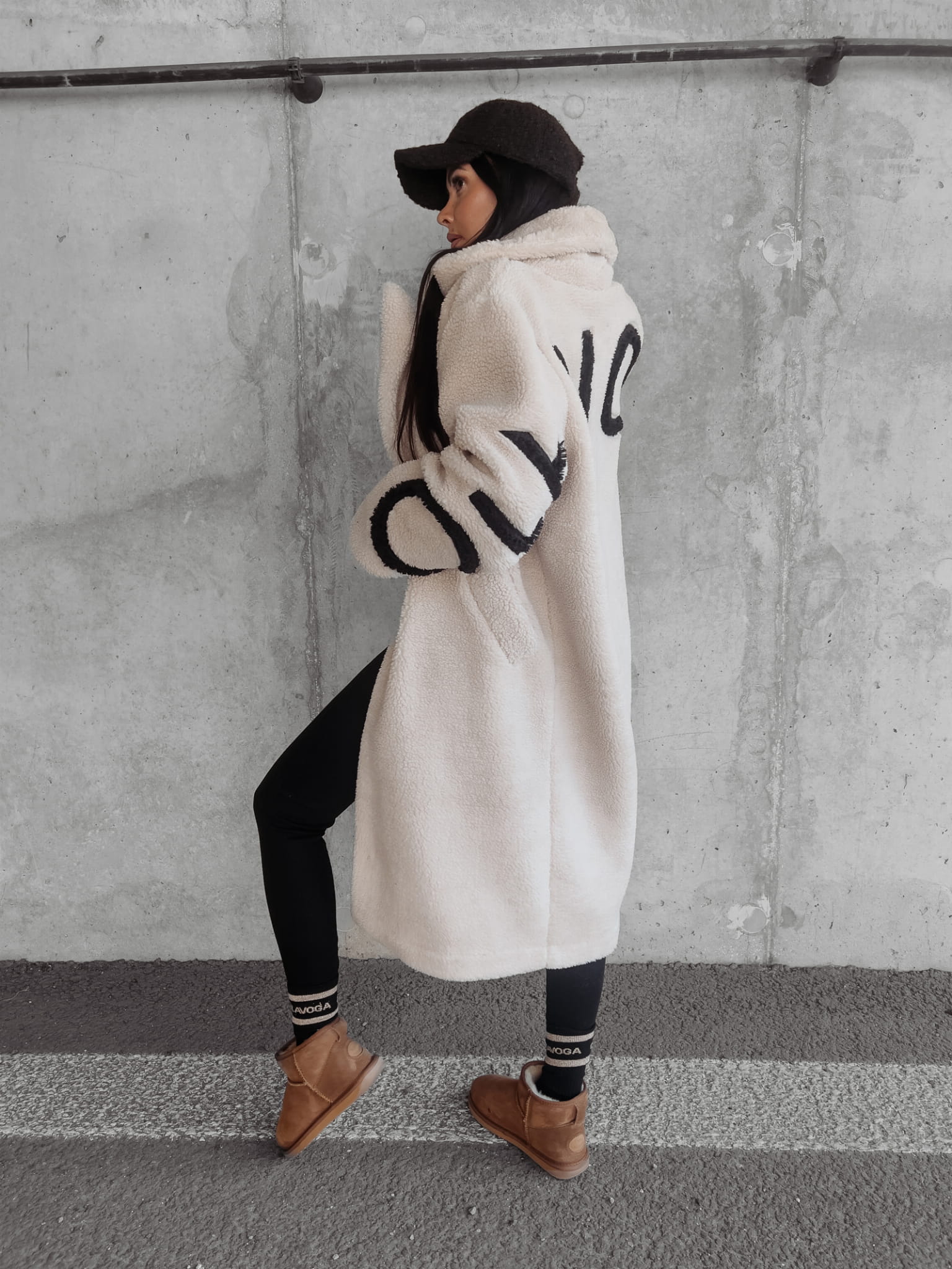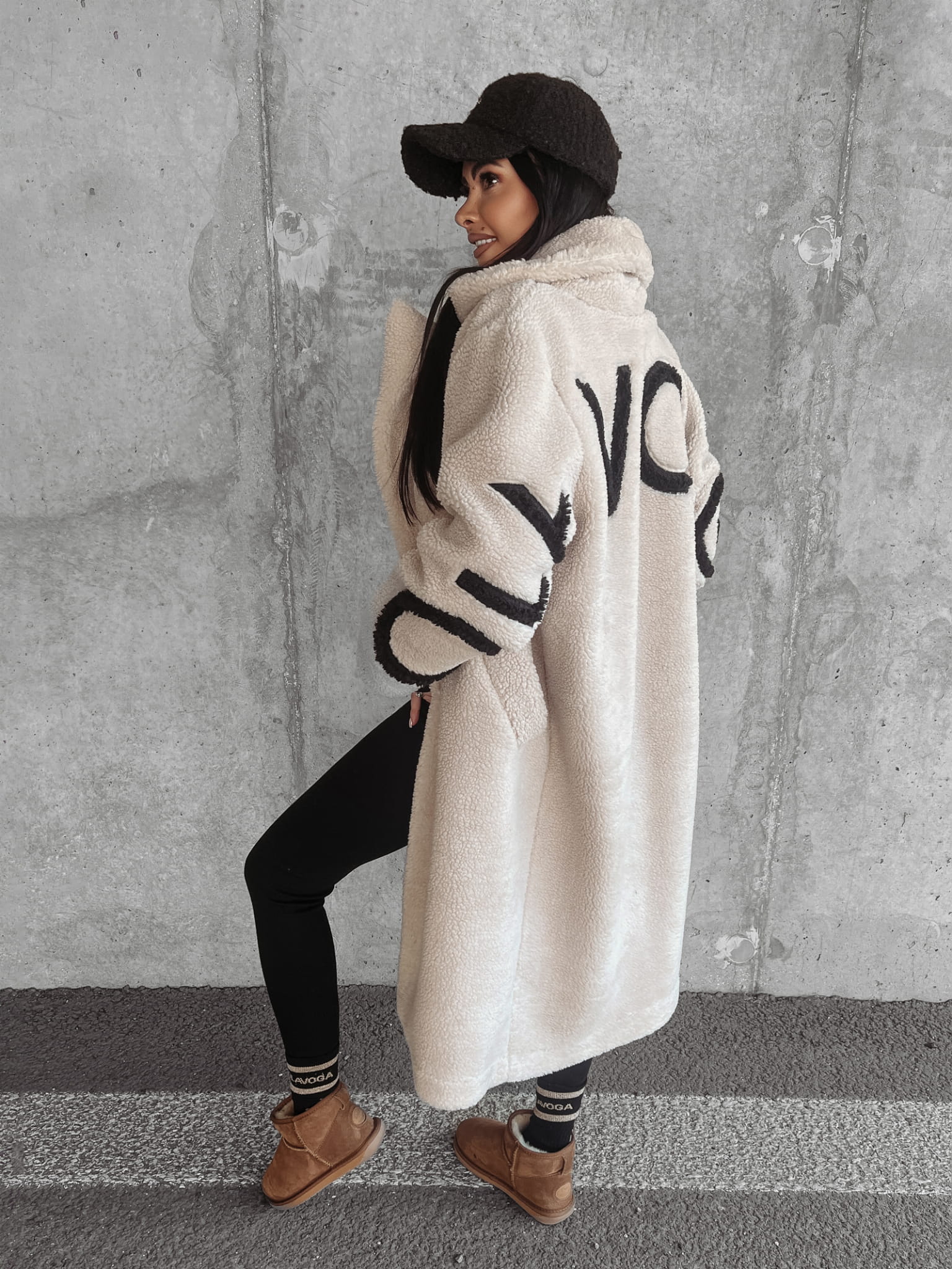 Obszerny, oversizowy płaszcz wykonany z przyjemnej w dotyku, puszystej tkaniny boucle. Z tyłu, na rękawach i na plecach naszyty duży napis OLAVOGA.