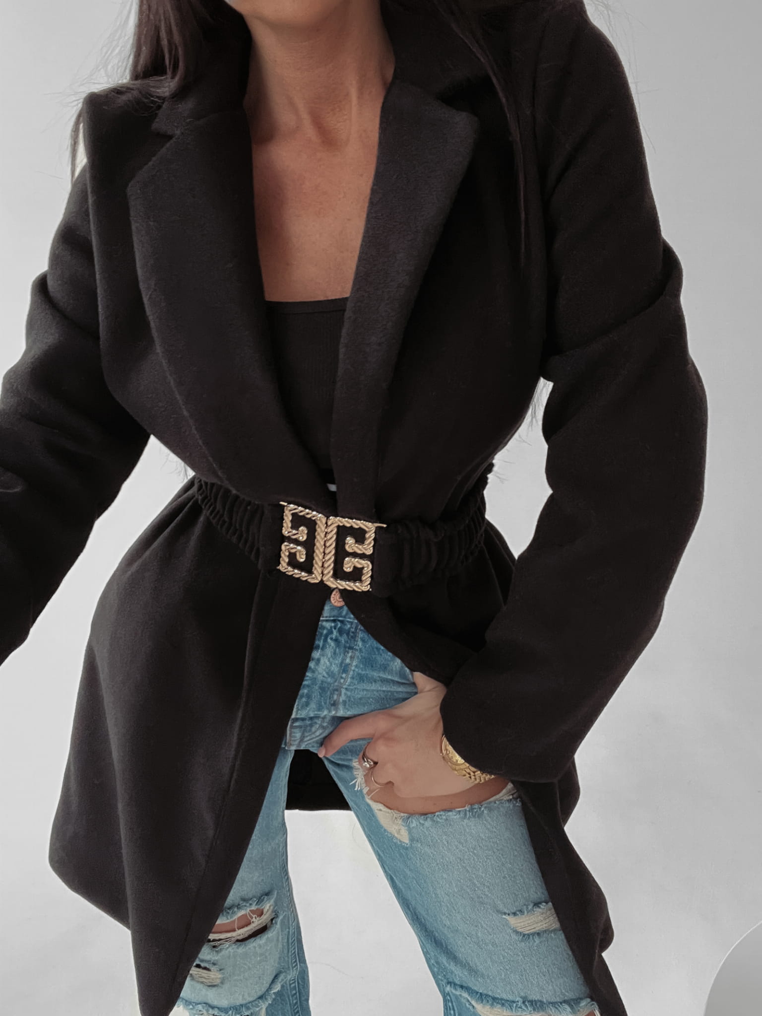 Płaszcz uszyty z flauszu z domieszką wełny, idealny na wiosnę i czas przejściowy. Kołnierz z klapami, w talii zapięcie na efektowny, złoty pasek. Sprawdzi się jako uzupełnienie zarówno codziennych jak i wieczorowych stylizacji.