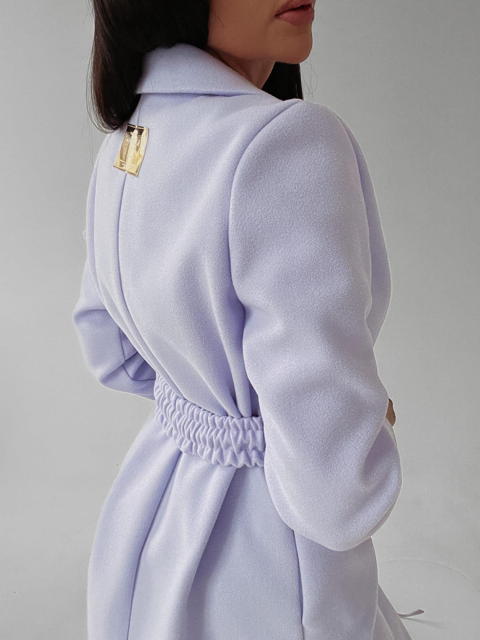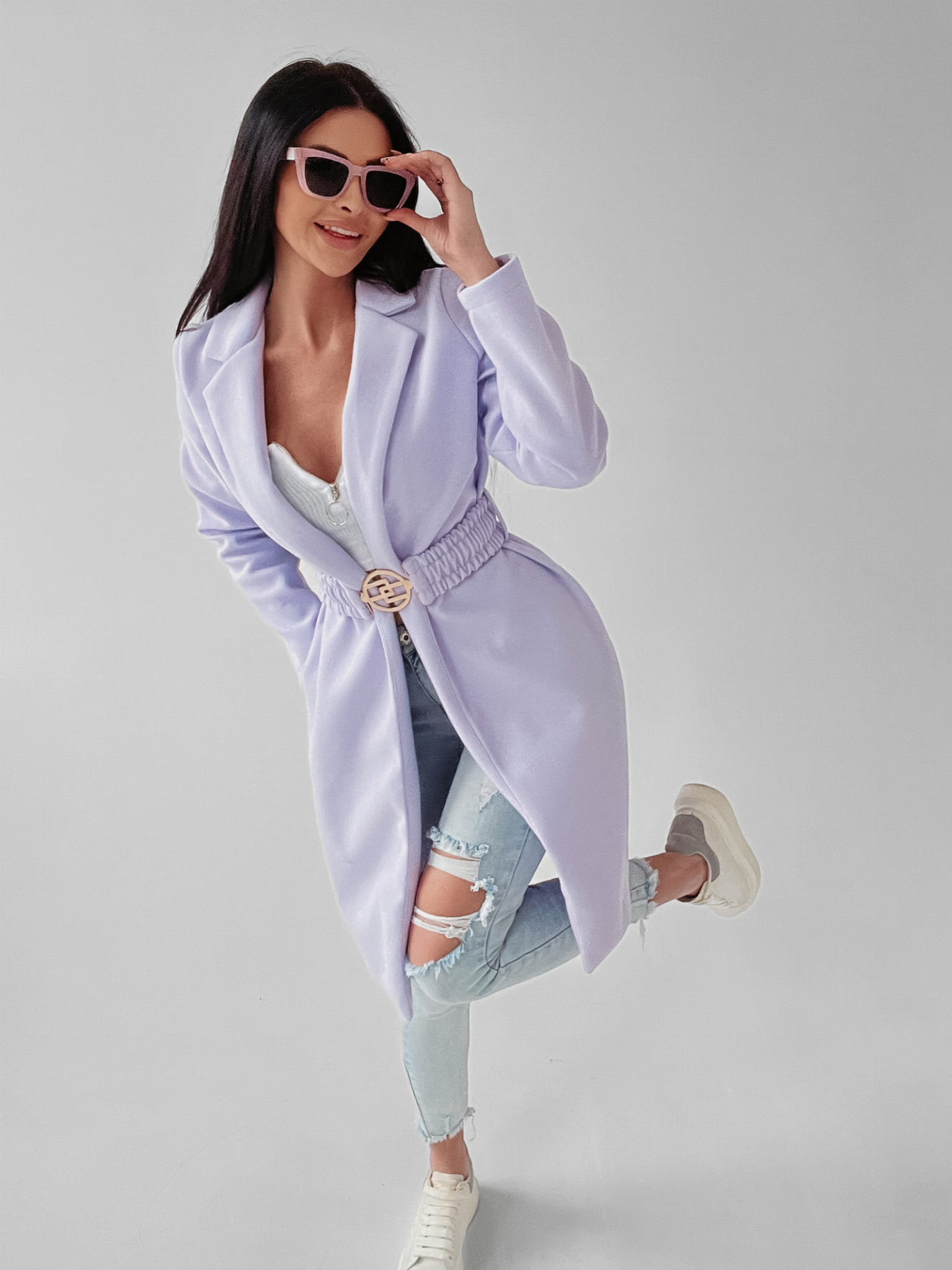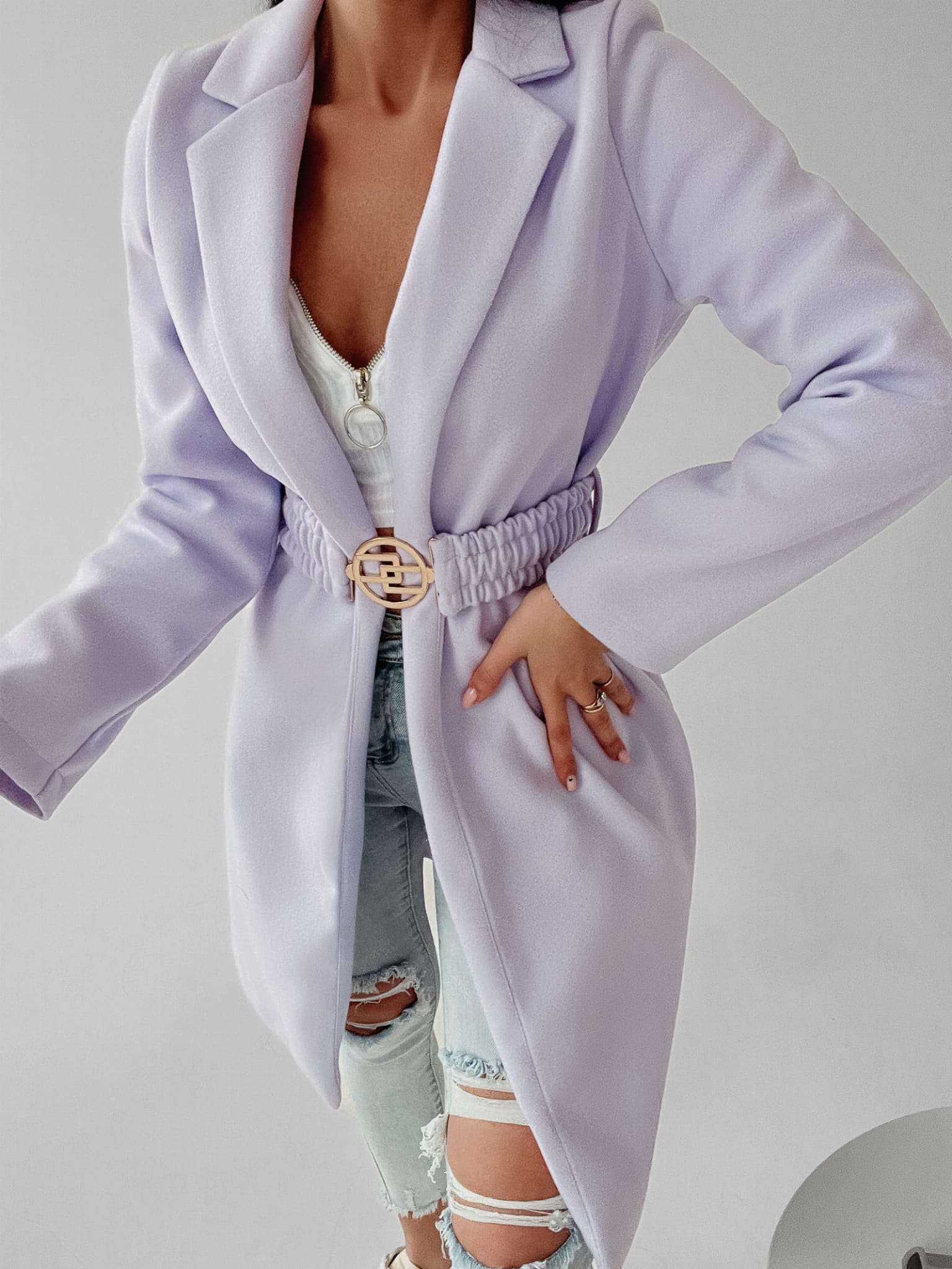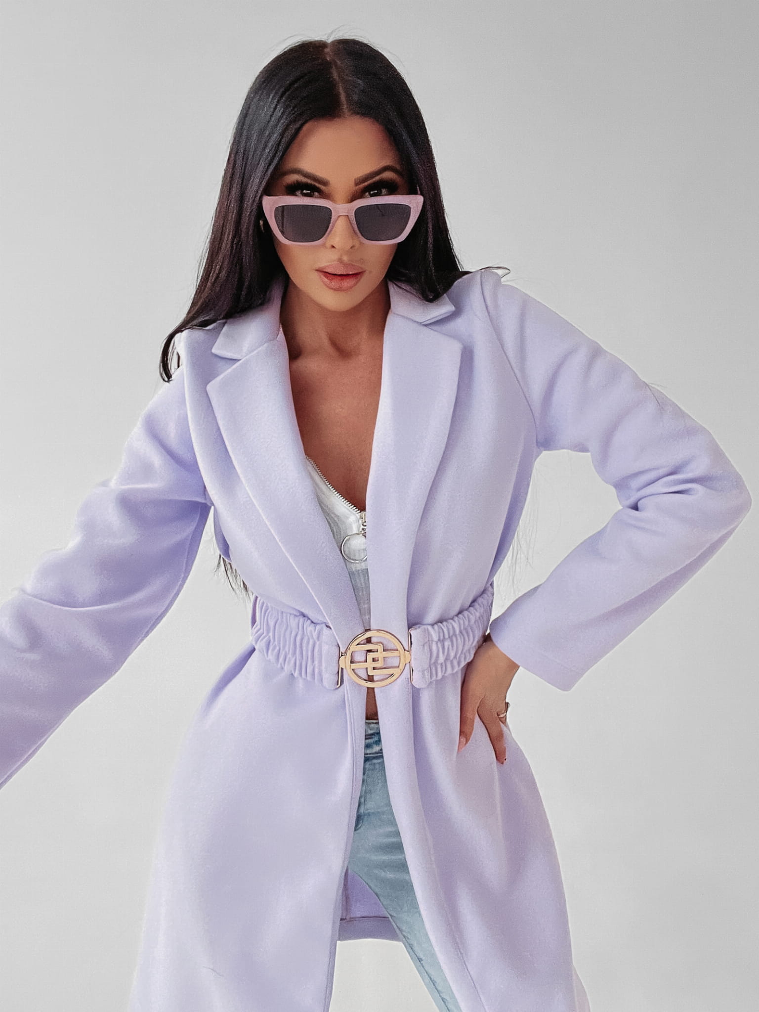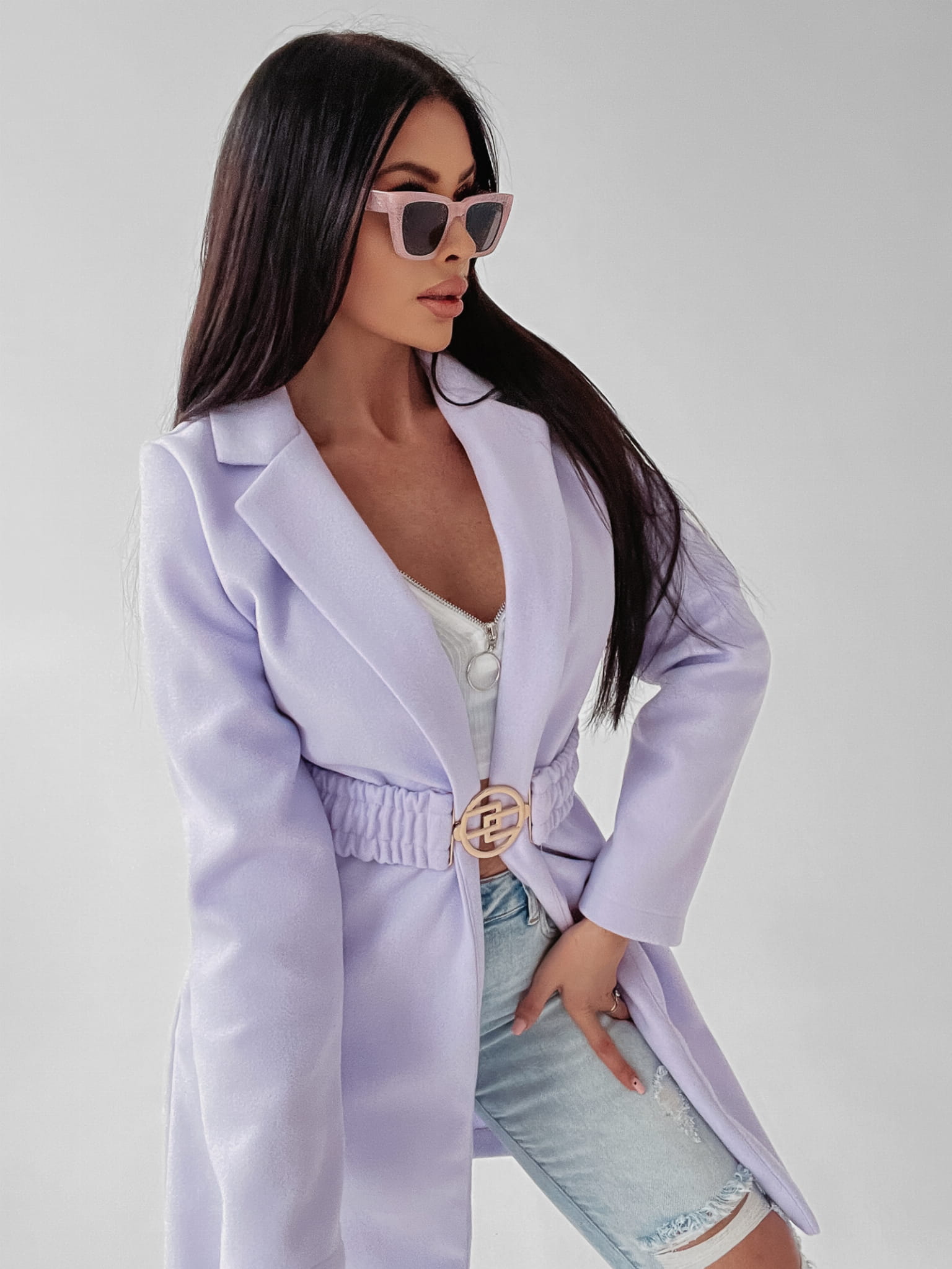 Płaszcz uszyty z flauszu z domieszką wełny, idealny na wiosnę i czas przejściowy. Kołnierz z klapami, w talii zapięcie na efektowny, złoty pasek. Sprawdzi się jako uzupełnienie zarówno codziennych jak i wieczorowych stylizacji.