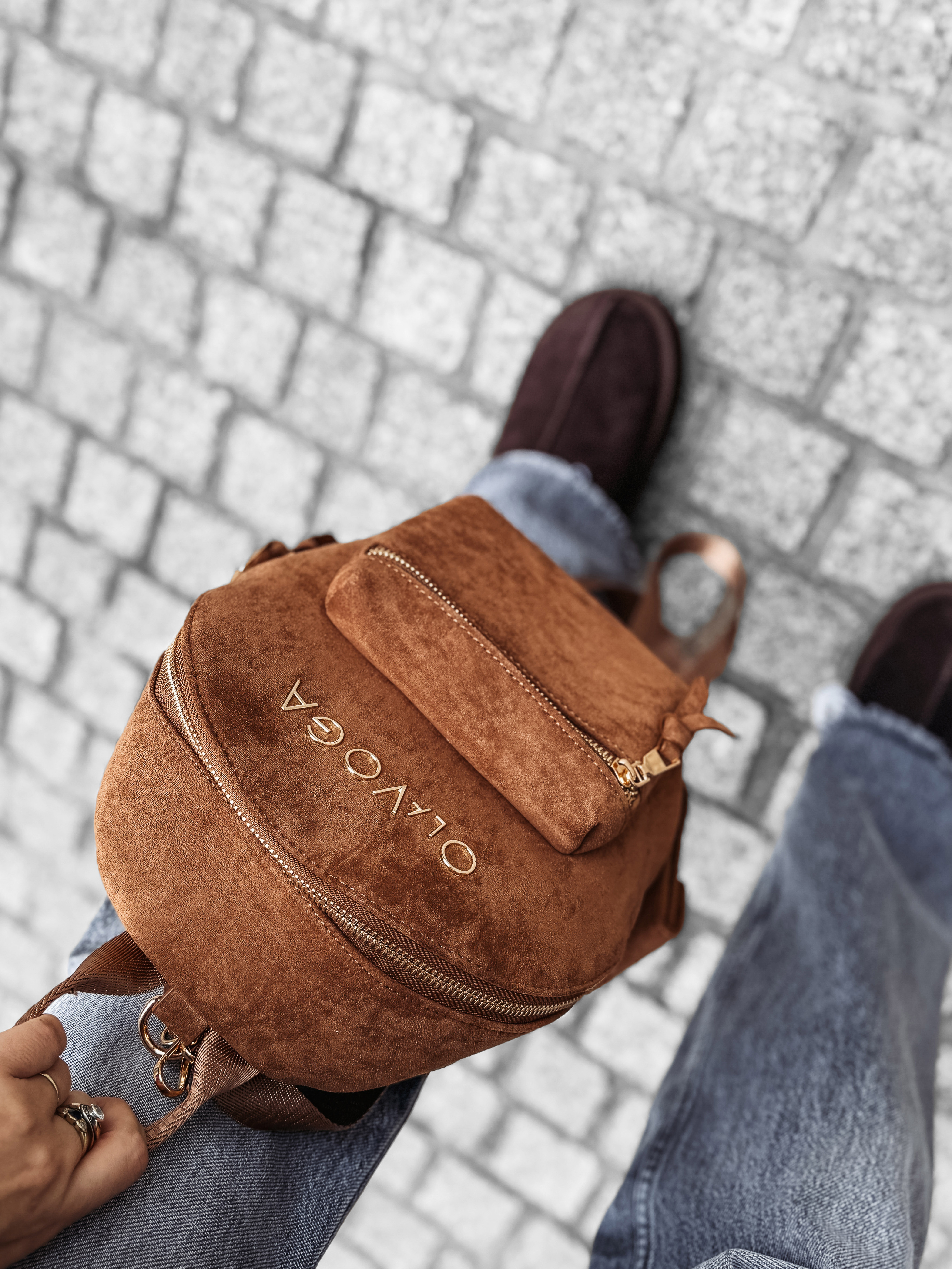 Plecak damski o nowoczesnym, minimalistycznym kroju. Wykonany z miękkiego, zamszowego materiału o subtelnej fakturze. Zdobiony metalowym logo OLAVOGA w odcieniu złota, które podkreśla jego elegancki charakter. Model wyposażony w praktyczną przednią kieszeń na suwak i regulowane szelki.