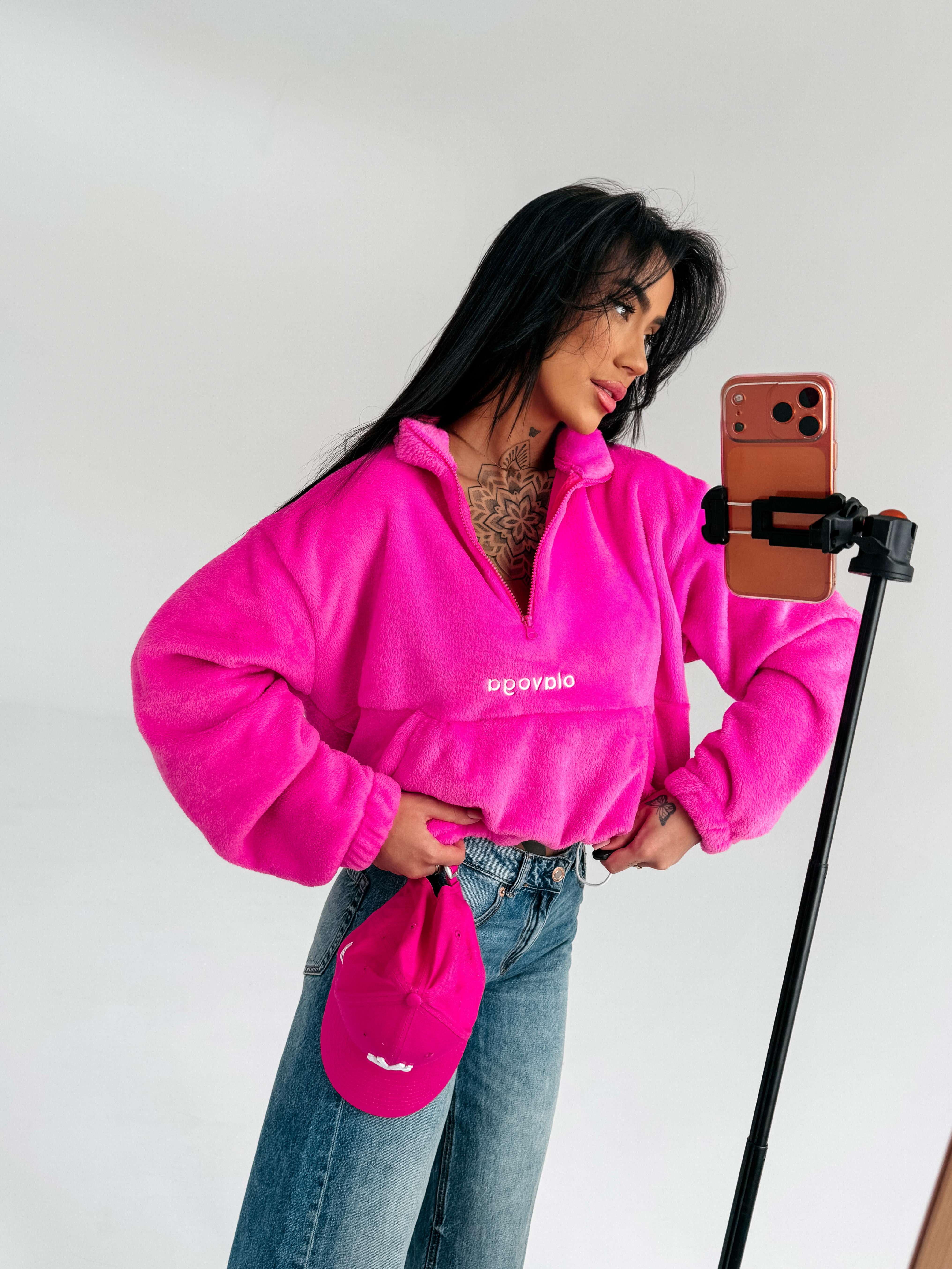 Casualowa bluza bez kaptura, typu fleece z krótkim zamkiem to. Model wykonany z wyjątkowo miękkiego, puszystego materiału typu teddy. Klasyczny, lekko skrócony krój. Stójka z krótkim zamkiem umożliwia regulację dekoltu. Na przodzie subtelne, haftowane logo marki OLAVOGA. Praktyczna kieszeń typu kangurka. Rękawy oraz dół wykończone elastycznymi ściągaczami.