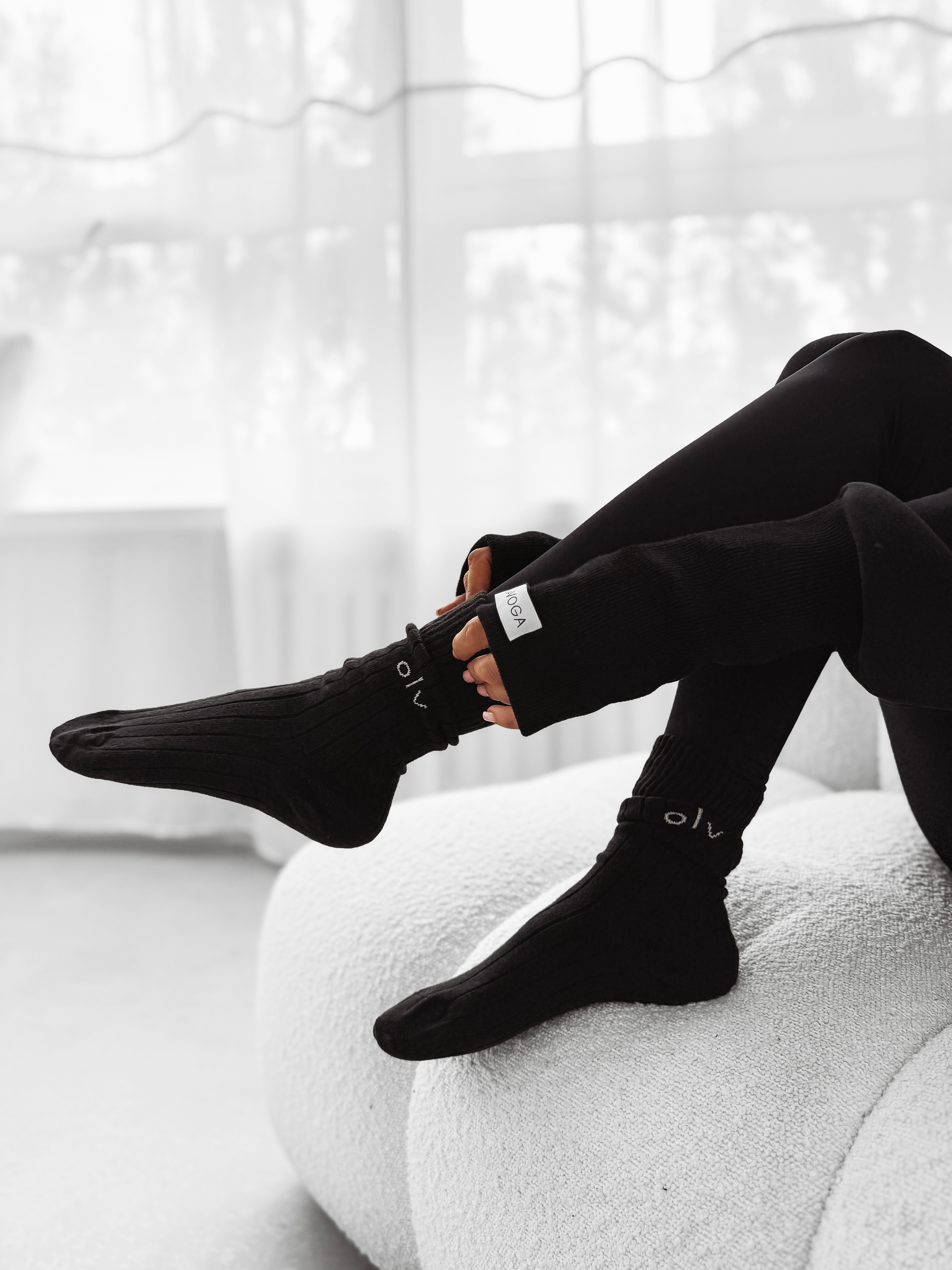 Długie skarpetki damskie. Model wykonany z wysokogatunkowej bawełny. Materiał jest nieprześwitujący. Na boku subtelny haft z logo marki OLAVOGA.