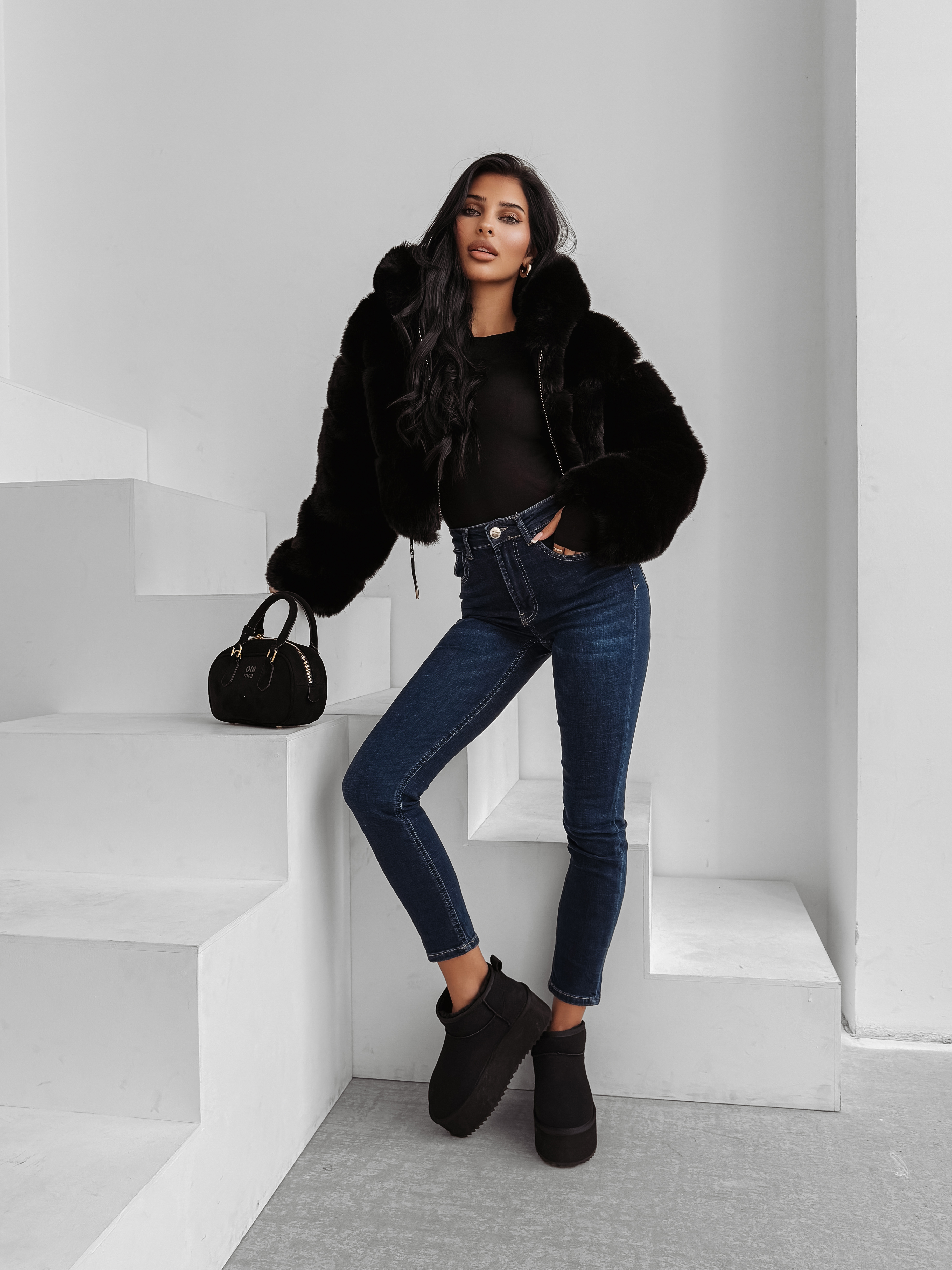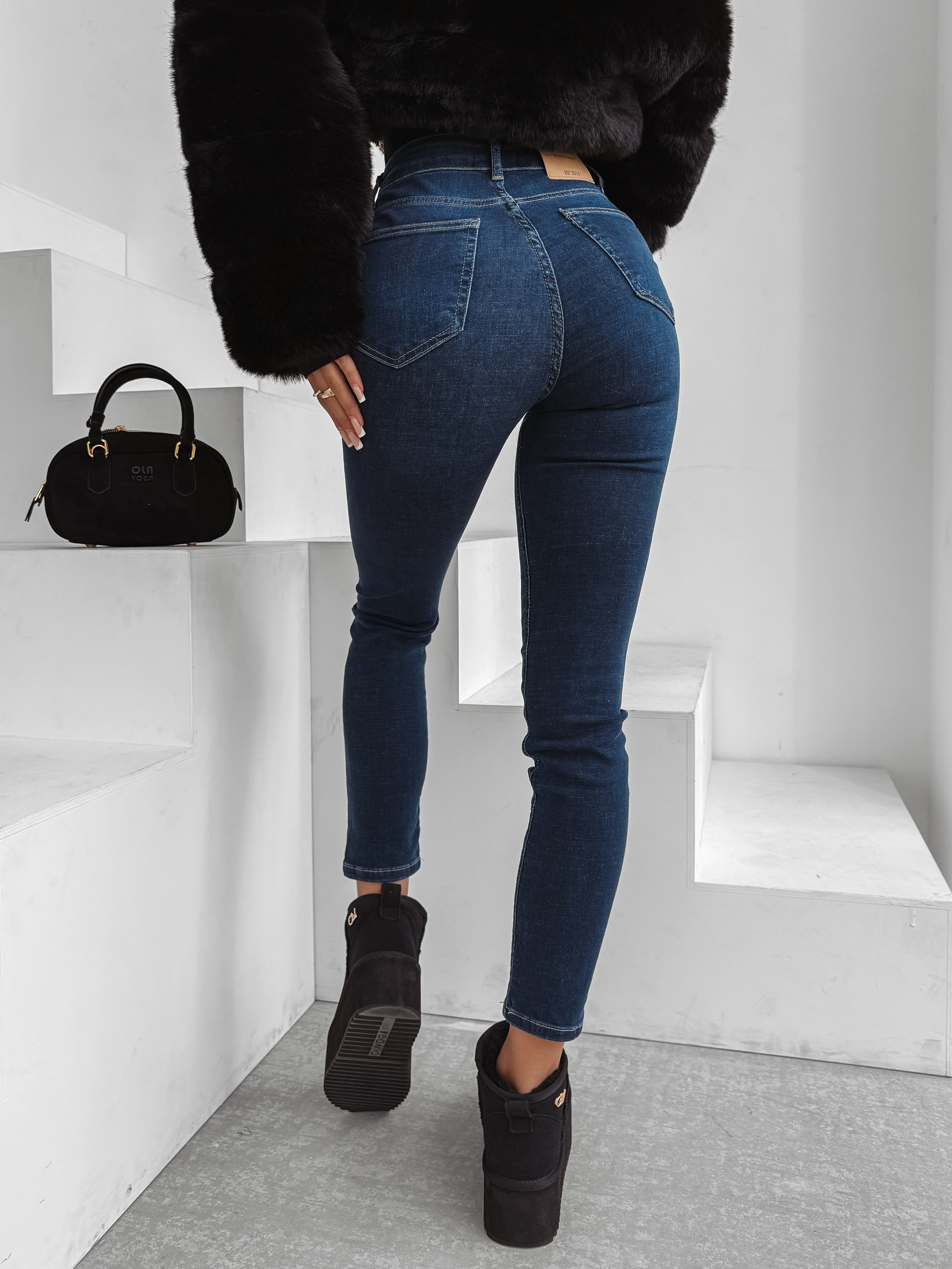 Dopasowane jeansy o klasycznym kroju z wysokim stanem. Wykonane z elastycznego denimu. Po boku subtelne logo marki OLAVOGA. Na tyle jak i przodzie praktycznie kieszenie. Logowane guziki. Na tyle skórzana naszywka z logo marki OLAVOGA.