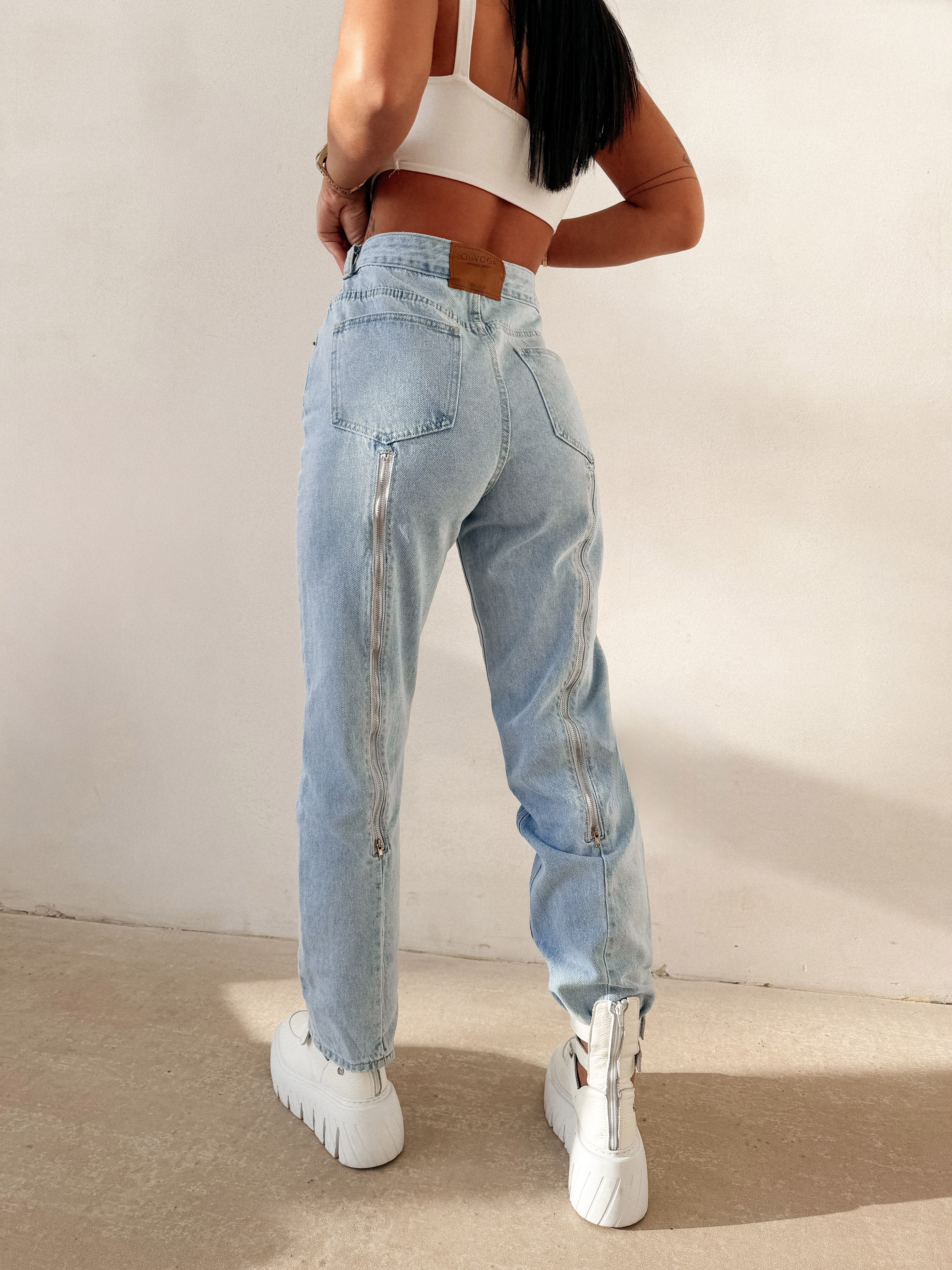 Casualowe jeansy z wysokim stanem. Wykonane z solidnego, wysokogatunkowego denimu. Pionowe suwaki z tyłu nogawek. Logowanie OLAVOGA przy kieszeni oraz skórzana naszywka z tyłu produktu. Całość uzupełniają dopracowane przeszycia i logowany guzik.