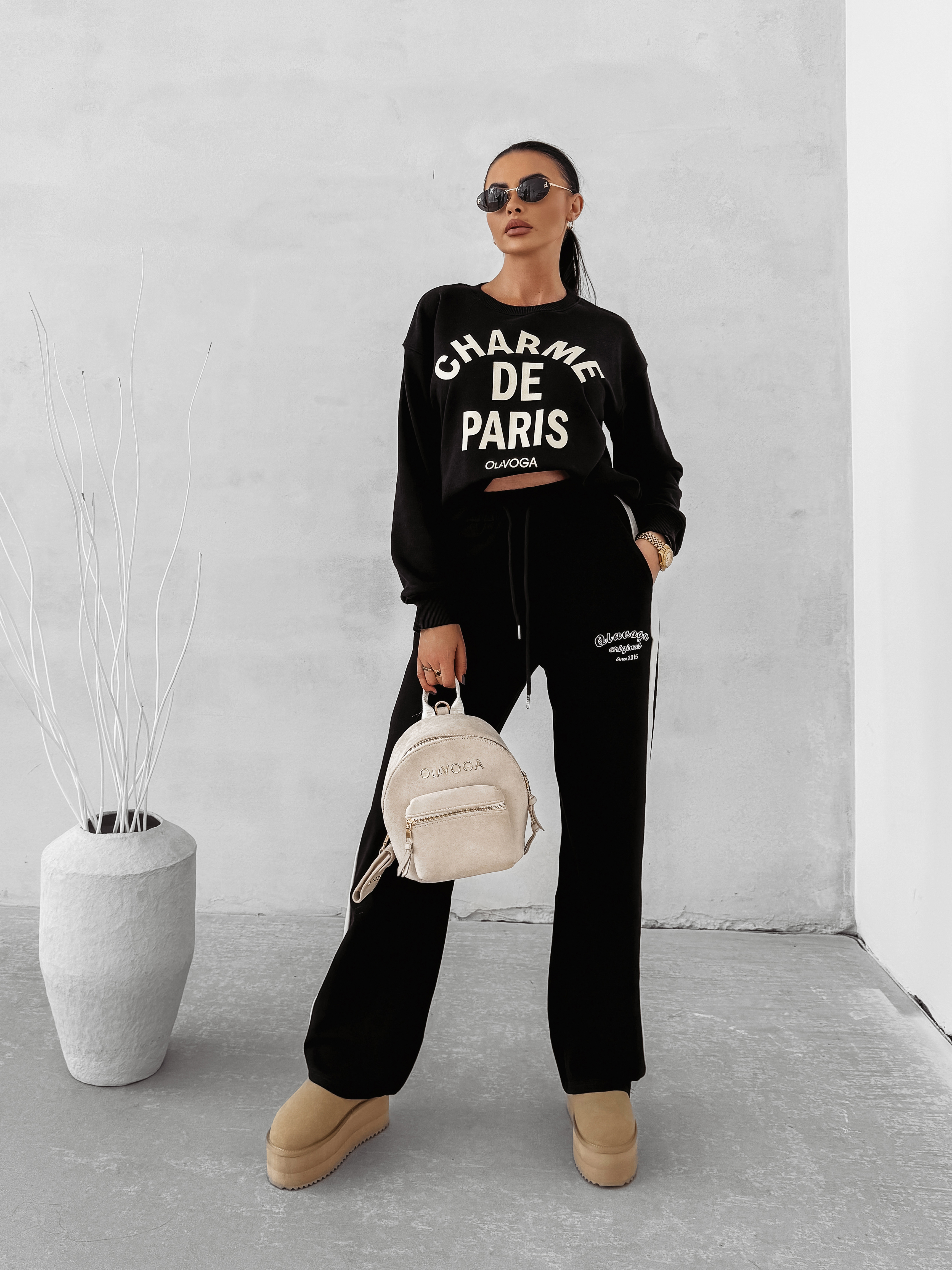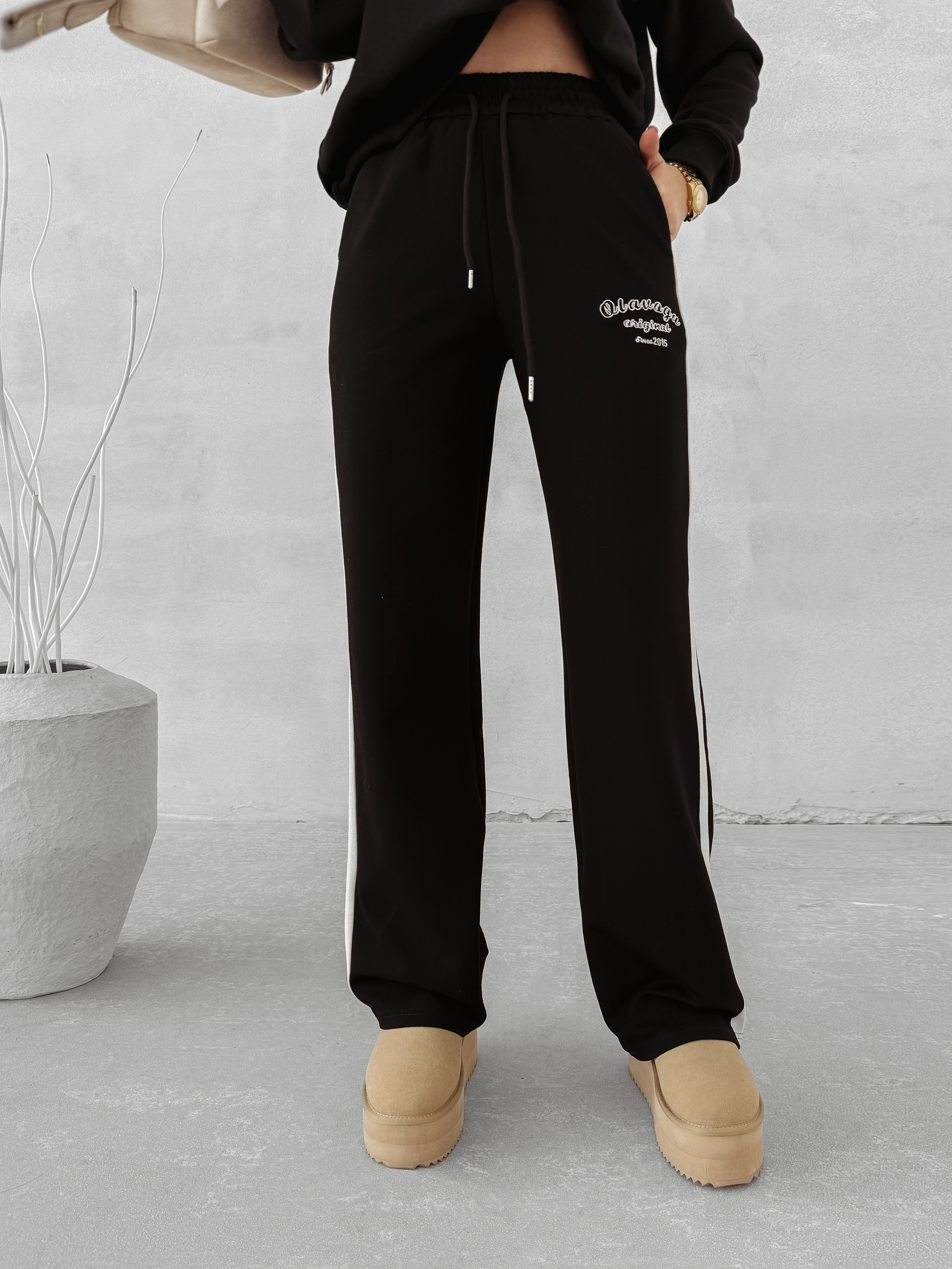 Sportowe spodnie o luźnym kroju z wysokim stanem. Wykonana z wysokiej jakości elastycznego materiału. Nogawka rozszerzana ku dołowi. Regulacja w talii poprzez sznurek. Na tyle nogawki haftowane logo marki OLAVOGA original since 2015. Po bokach kontrastowe lampasy. Na przodzie logowanie. Tworzą idealny komplet z bluzą CHARME.