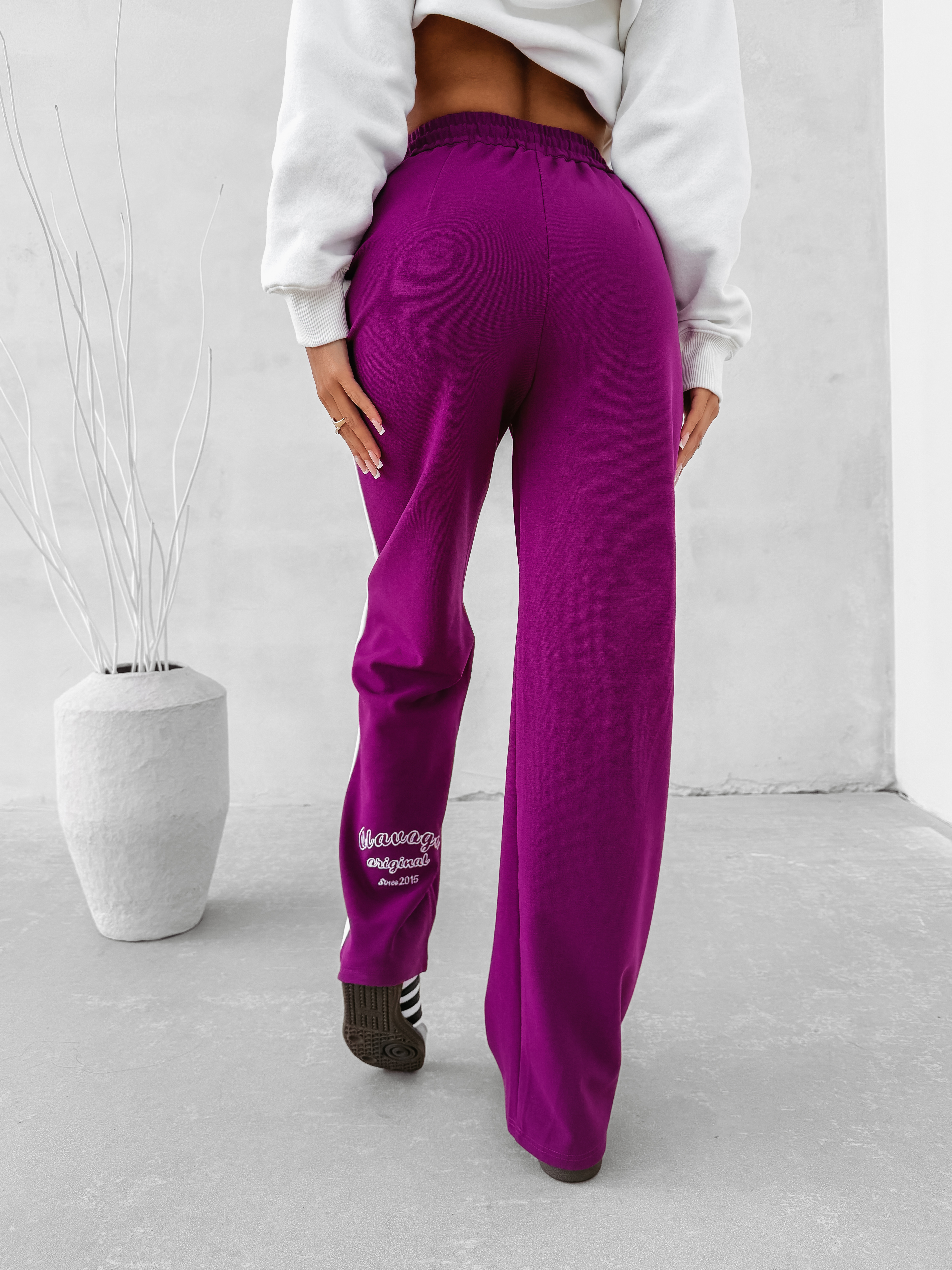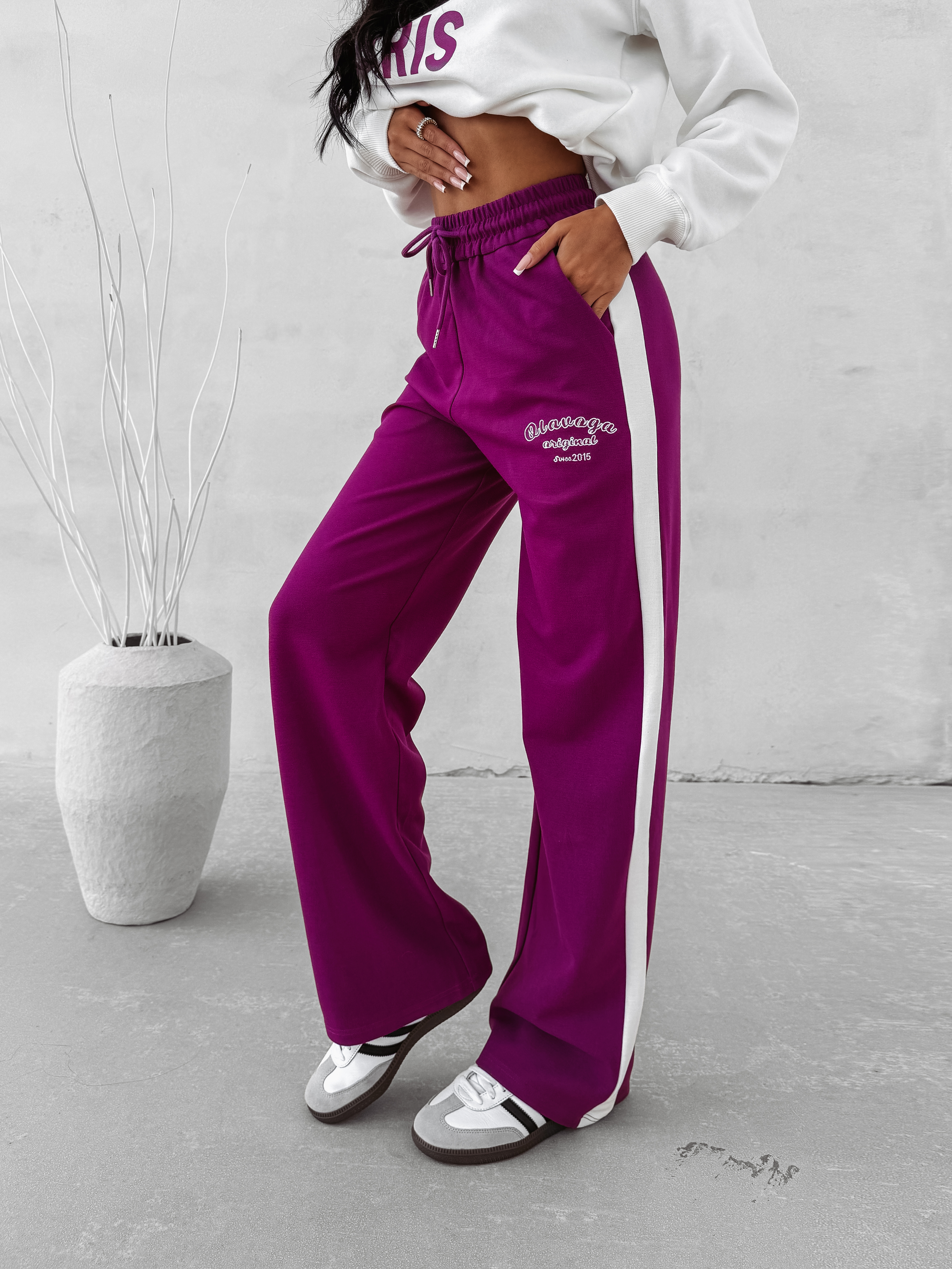 Sportowe spodnie o luźnym kroju z wysokim stanem. Wykonana z wysokiej jakości elastycznego materiału. Nogawka rozszerzana ku dołowi. Regulacja w talii poprzez sznurek. Na tyle nogawki haftowane logo marki OLAVOGA original since 2015. Po bokach kontrastowe lampasy. Na przodzie logowanie. Tworzą idealny komplet z bluzą CHARME.