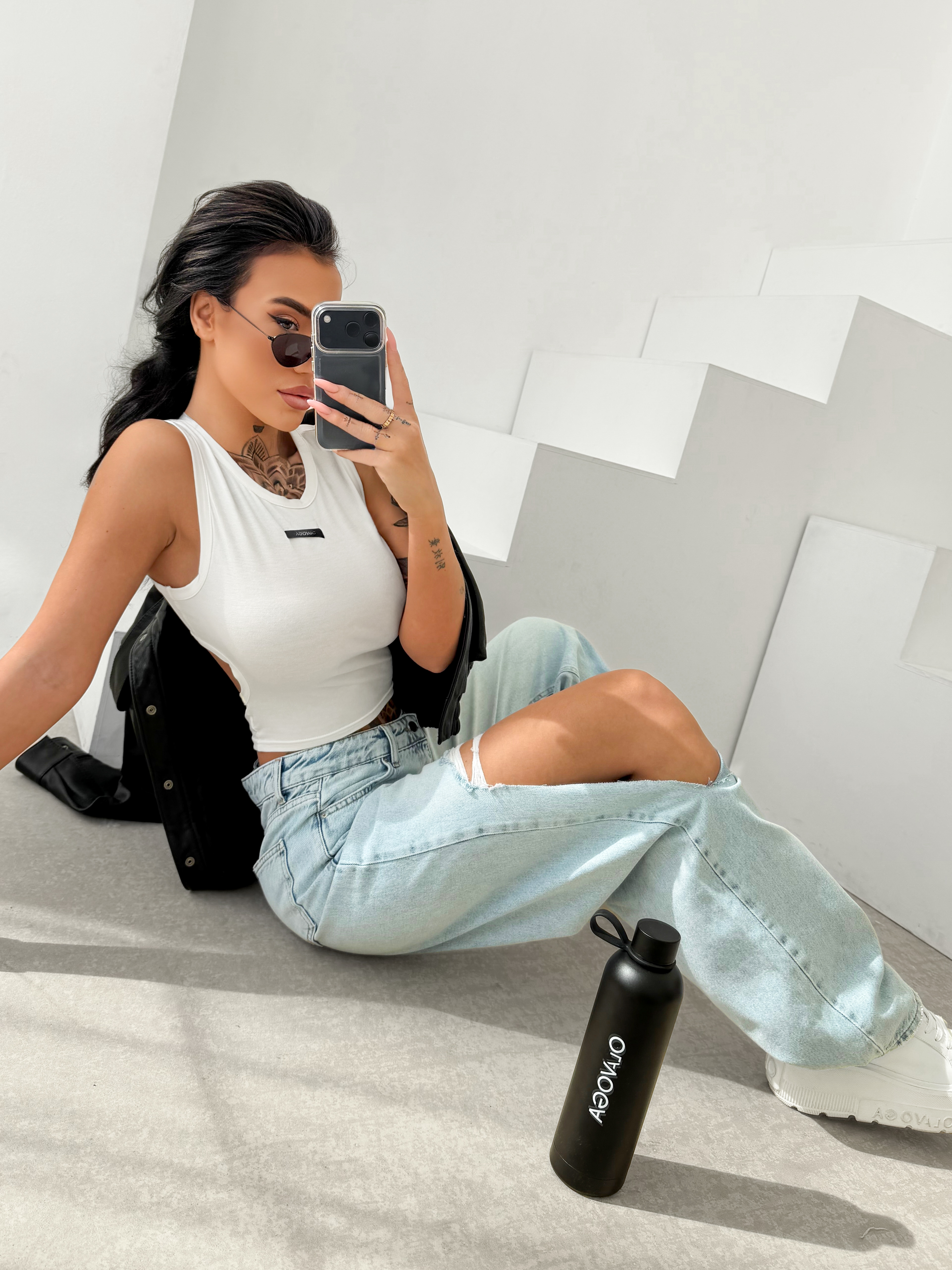 Denim krój relaxed fit z prostą nogawką - washed effect - model z klasycznymi kieszeniami - zapięcie na logowany guzik i zamek - dekoracyjne rozdarcie i przetarcia na nogawce - naszywka logowana w kolorze różu - różowy kontrastowy haft na nogawkach na tyle