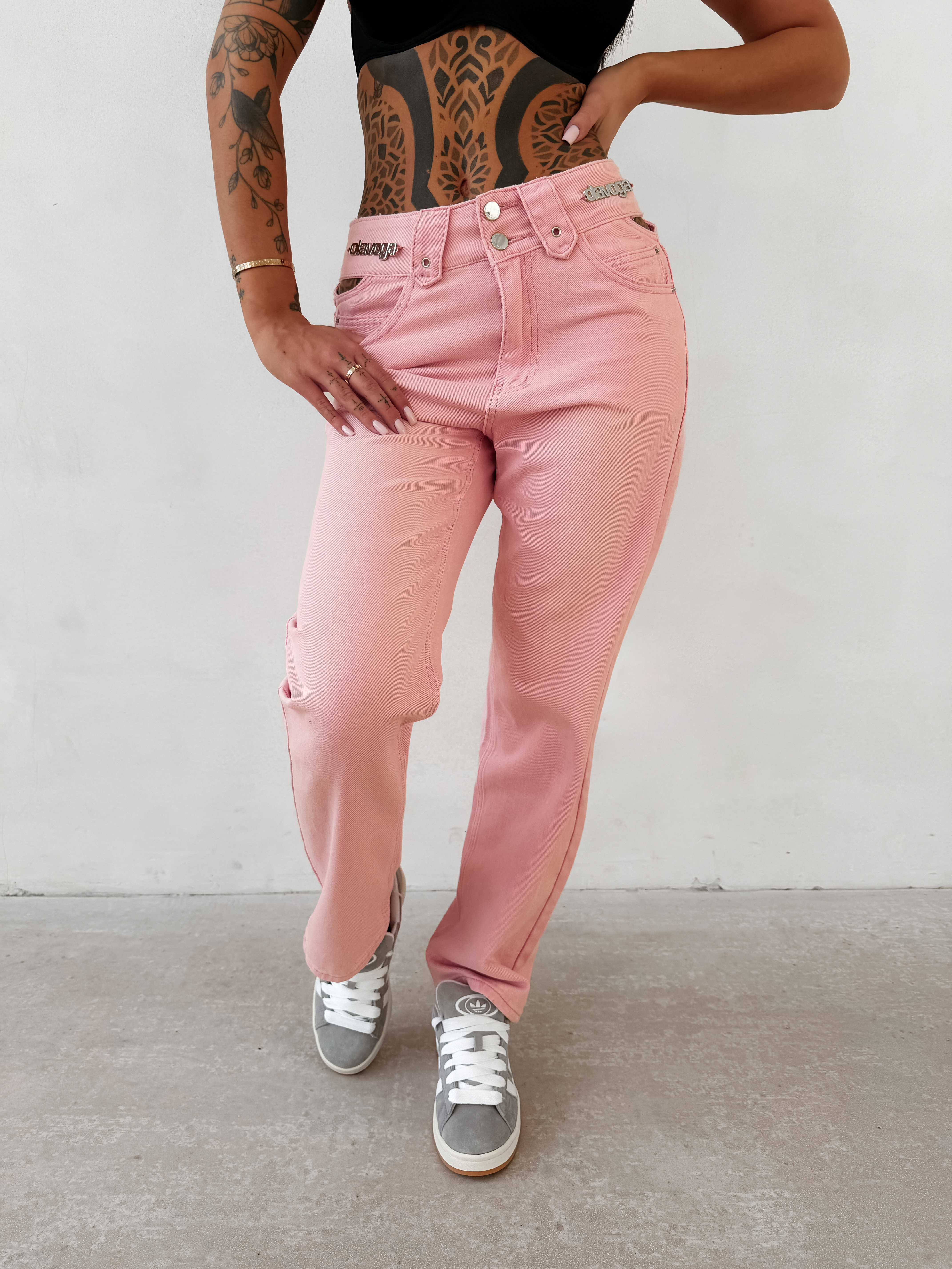 Casualowe spodnie jeansowe o prostym, lekko luźnym kroju. Wykonane z wysokiej jakości elastycznego denimu. Model z podwyższonym stanem. Klasyczne kieszenie z przodu i z tyłu. Staranne przeszycia oraz delikatny efekt sprania. W pasie umieszczono subtelne detale z logo marki OLAVOGA.