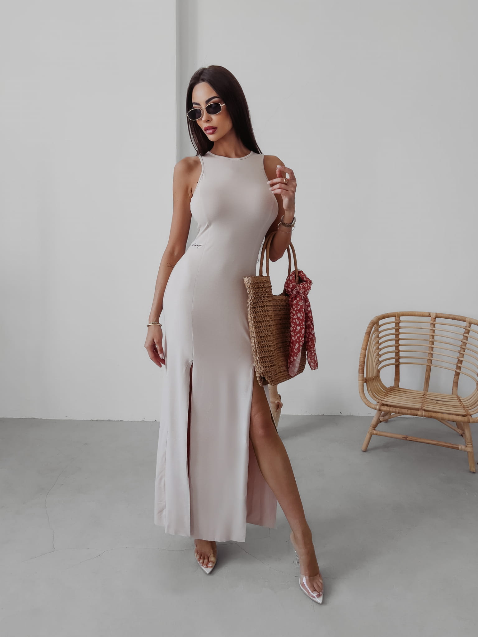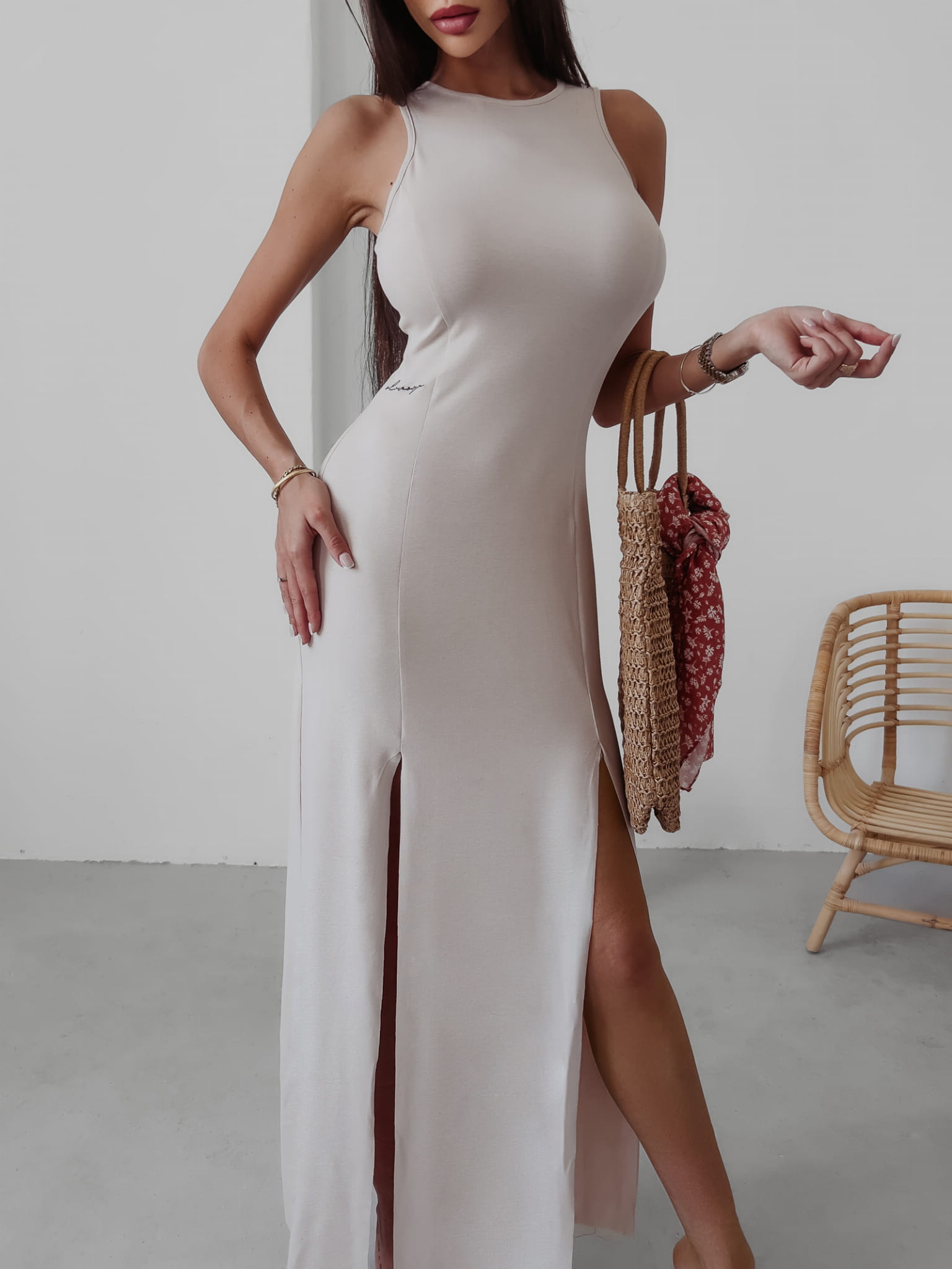 Dopasowana sukienka maxi, bez rękawów, z głębokim, podwójnym rozcięciem po bokach. Prosty model, wykonany z gładkiej, elastycznej dzianiny. Atuty sylwetki podkreśla zabudowany, okrągły dekolt. Idealna na letni spacer, plażę czy grill z przyjaciółmi.