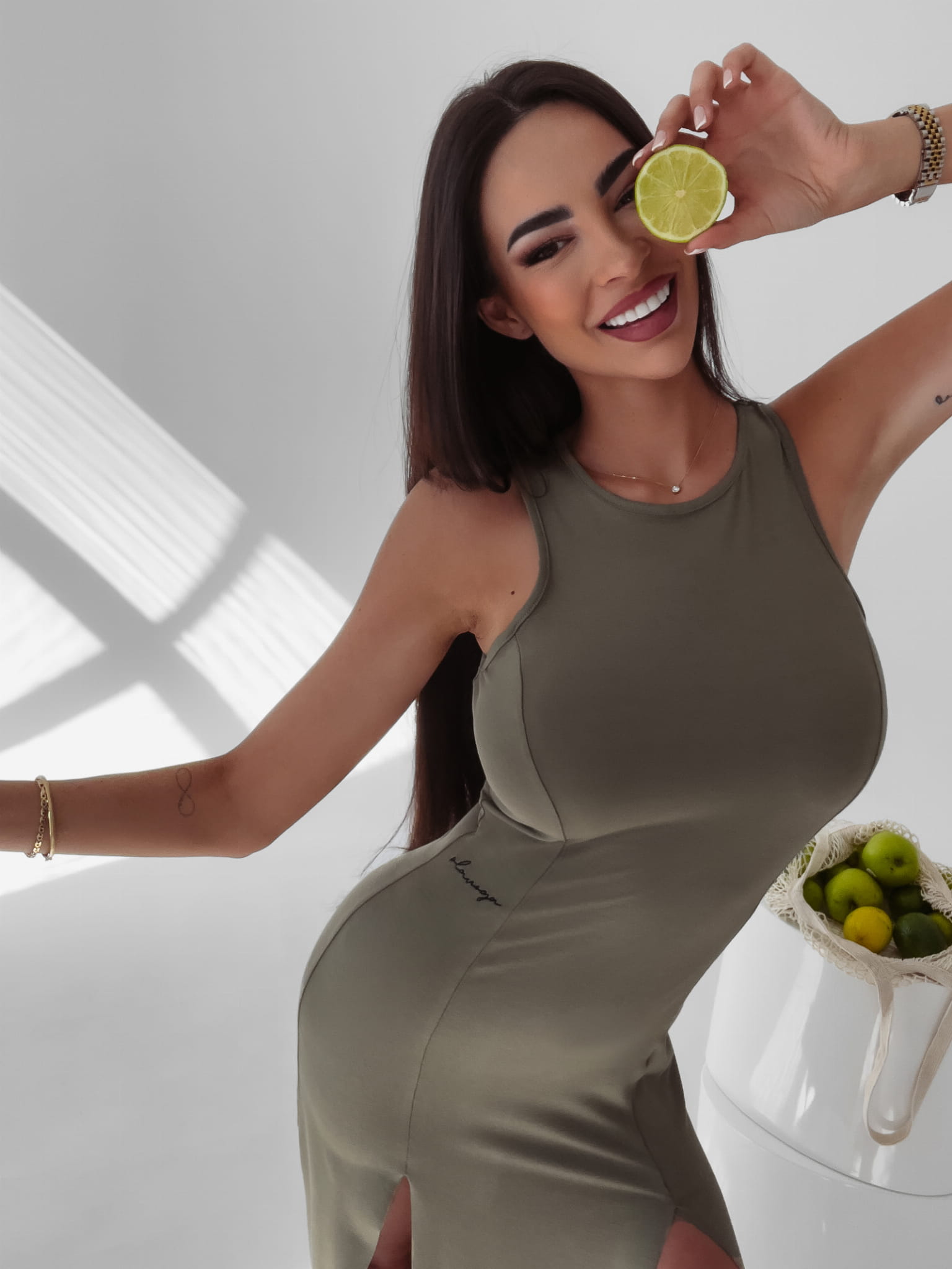 Dopasowana sukienka maxi, bez rękawów, z głębokim, podwójnym rozcięciem po bokach. Prosty model, wykonany z gładkiej, elastycznej dzianiny. Atuty sylwetki podkreśla zabudowany, okrągły dekolt. Idealna na letni spacer, plażę czy grill z przyjaciółmi.