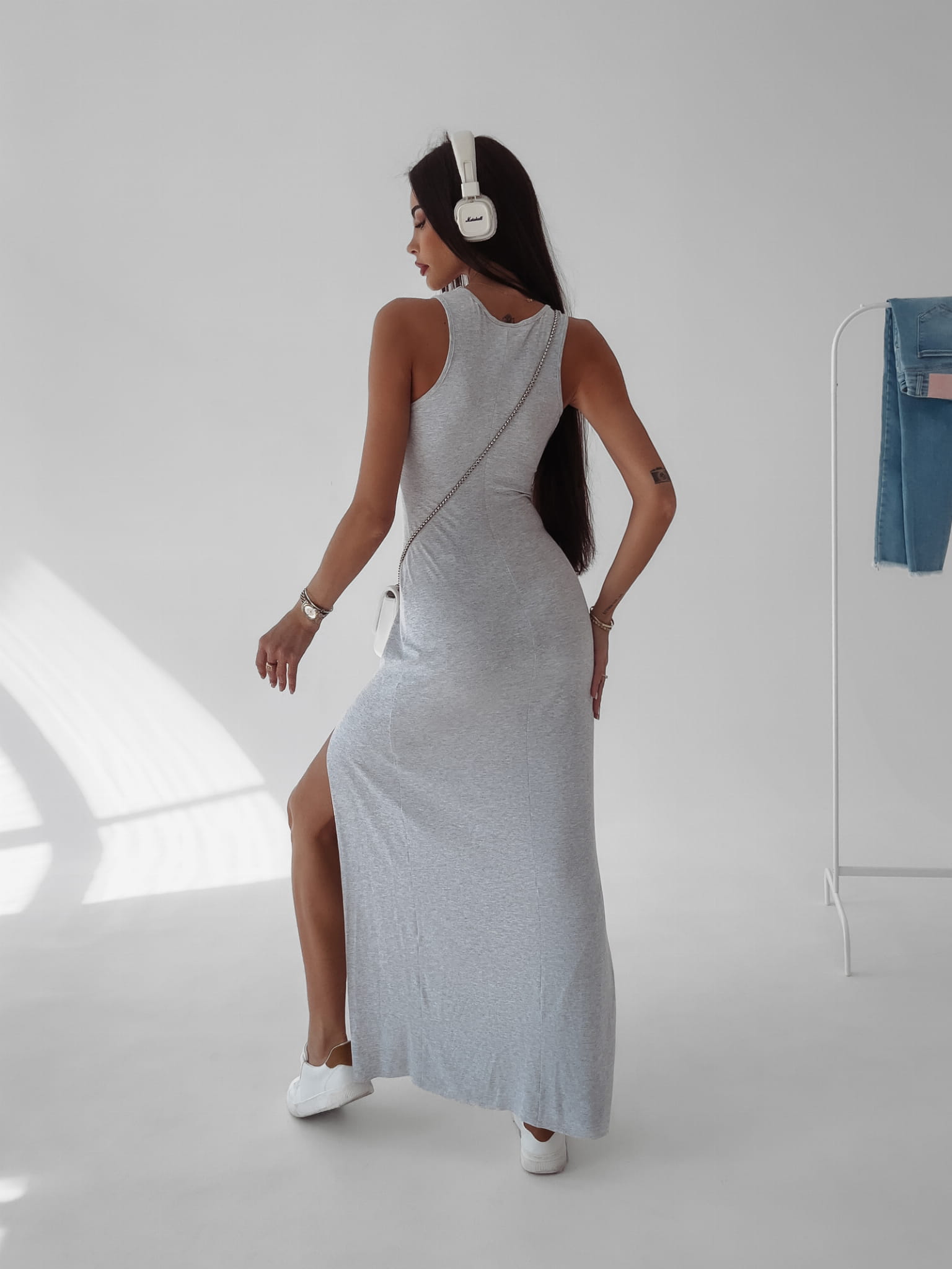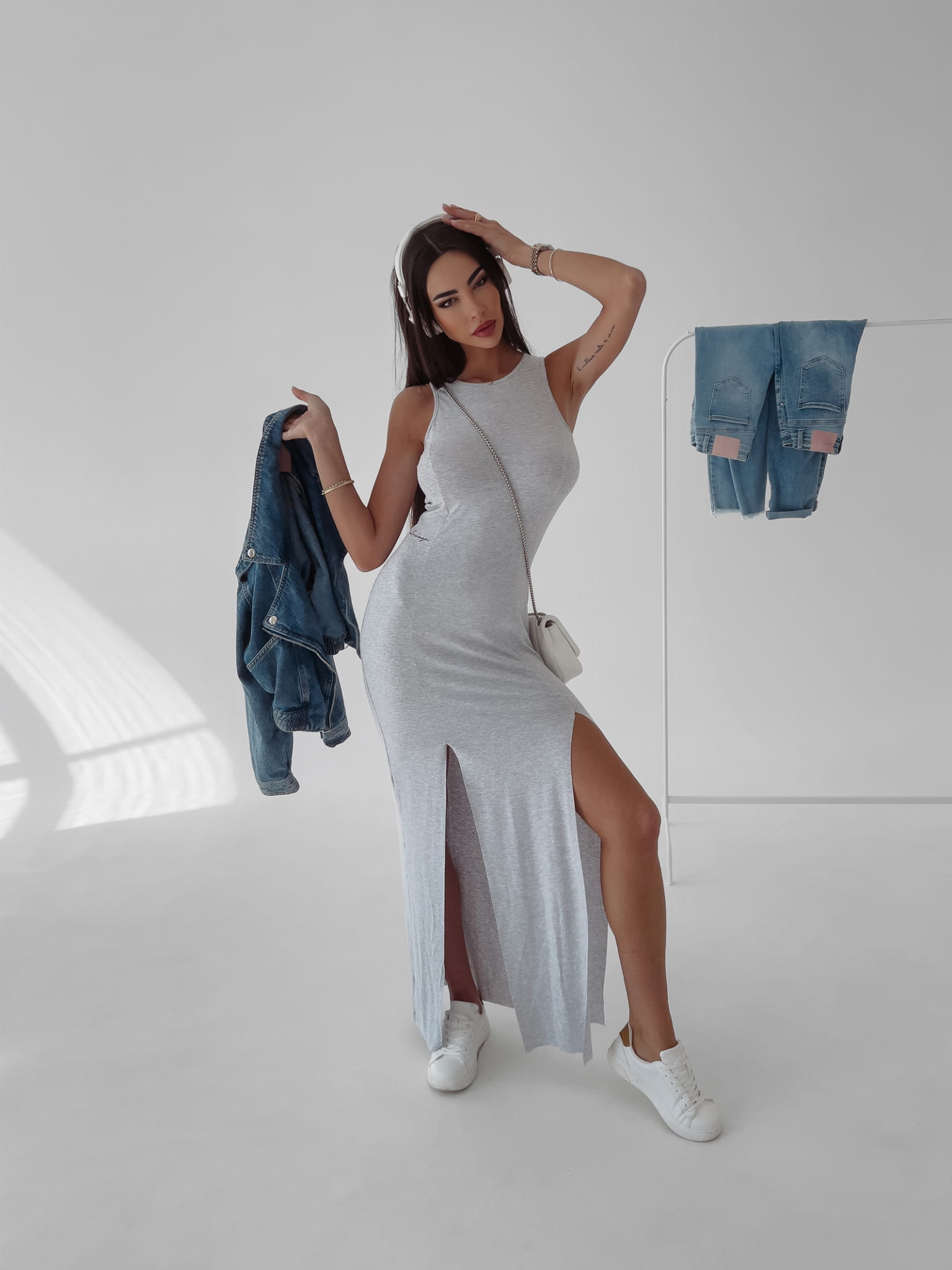 Dopasowana sukienka maxi, bez rękawów, z głębokim, podwójnym rozcięciem po bokach. Prosty model, wykonany z gładkiej, elastycznej dzianiny. Atuty sylwetki podkreśla zabudowany, okrągły dekolt. Idealna na letni spacer, plażę czy grill z przyjaciółmi.