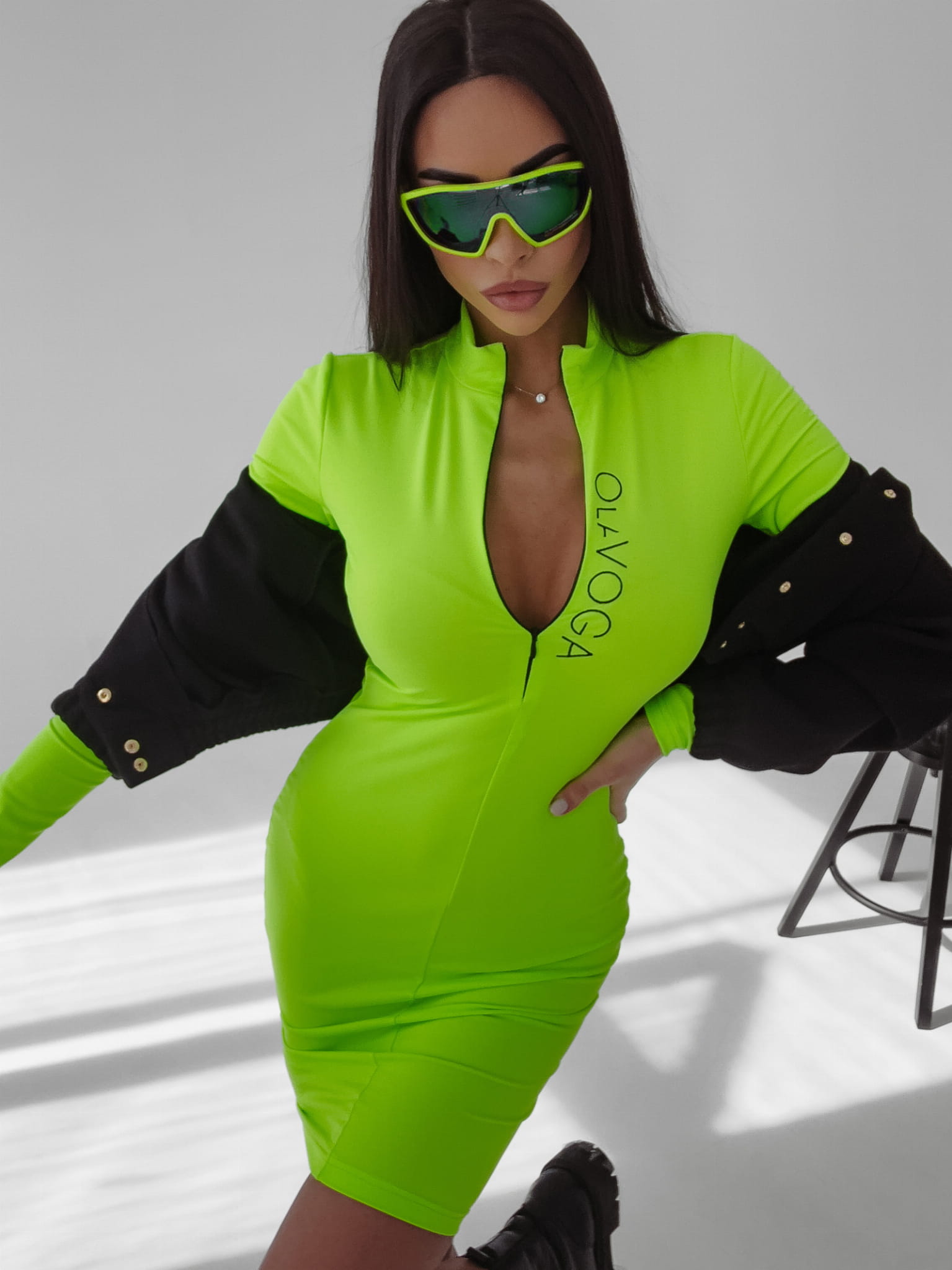 Dopasowana, sportowa sukienka uszyta z lekko połyskującego materiału. Na przodzie nadruk logo OLAVOGA. Sukienka z wysokim kołnierzem, zapinana na suwak. Rada stylistki – noś w zestawie z bomberką i ciężkimi workerami.