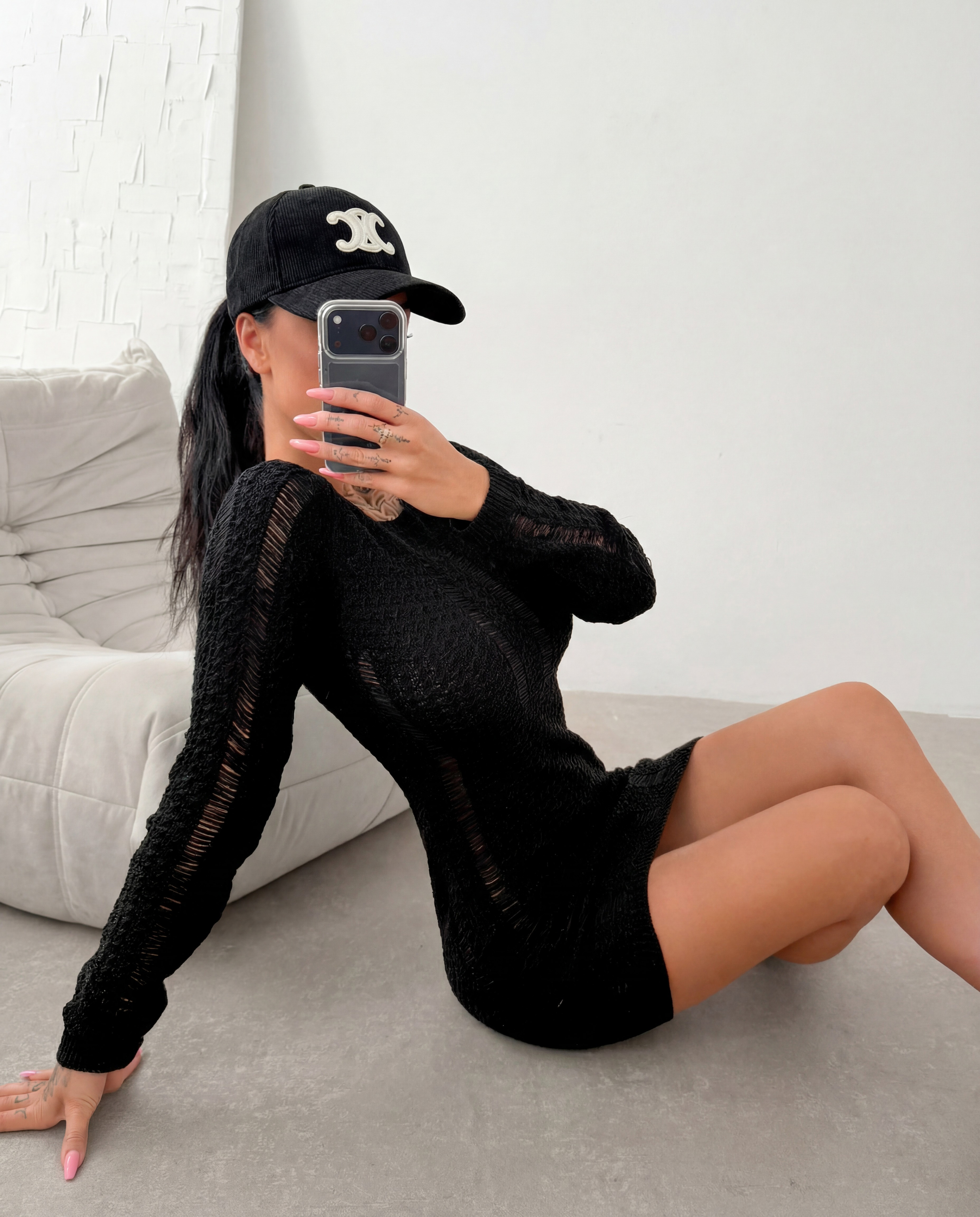 Dopasowany fason - długi rękaw - klasyczny zabudowany dekolt - ażurowa strukturalna faktura dzianiny - kontrolowany distressed look na całej sukience