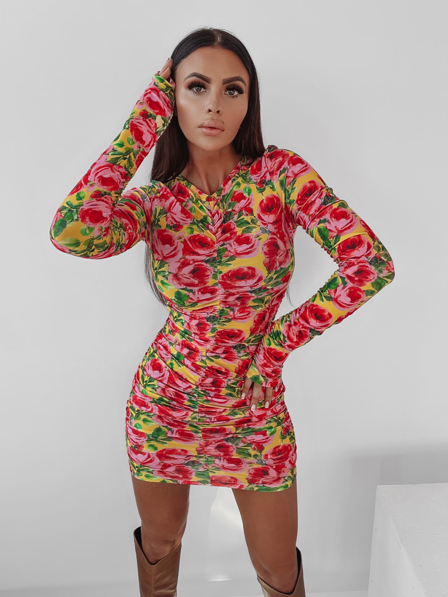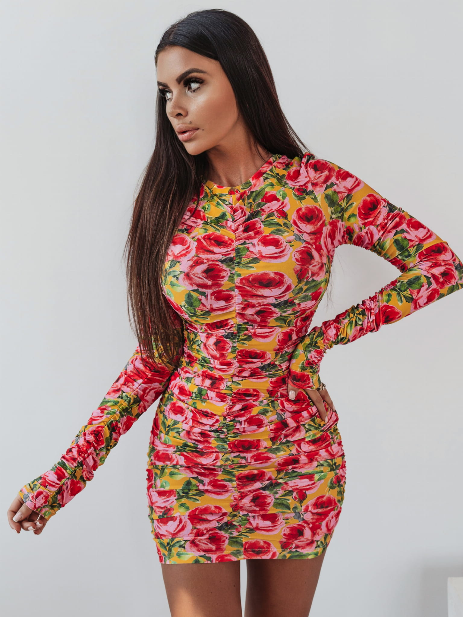 Sukienka FLORAL FANTASY dopasowana, marszczona sukienka mini w obłędny kwiatowy print. Sukienka pięknie dopasowuje się do kształtów i podkreśla atuty Twojej figury. Propozycja dla fashionistek, podążających za najnowszymi modowymi trendami.