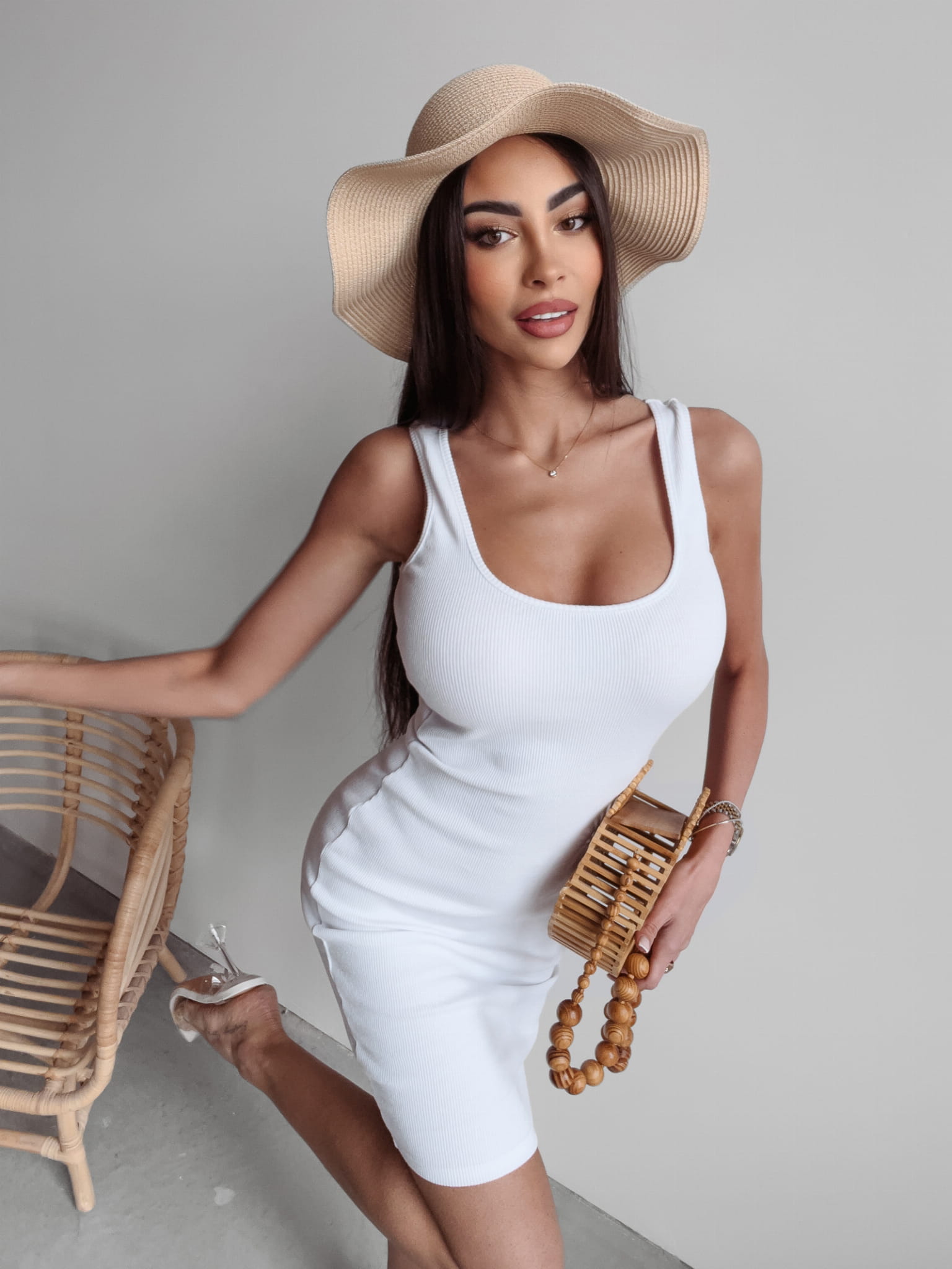 Przylegająca, krótka sukienka wykonana z bawełnianej dzianiny prążkowanej. Doskonale dopasowuje się do figury. Duży dekolt i szerokie ramiączka optycznie wysmuklają ramiona. Postaw na wygodę i minimalistyczny styl.