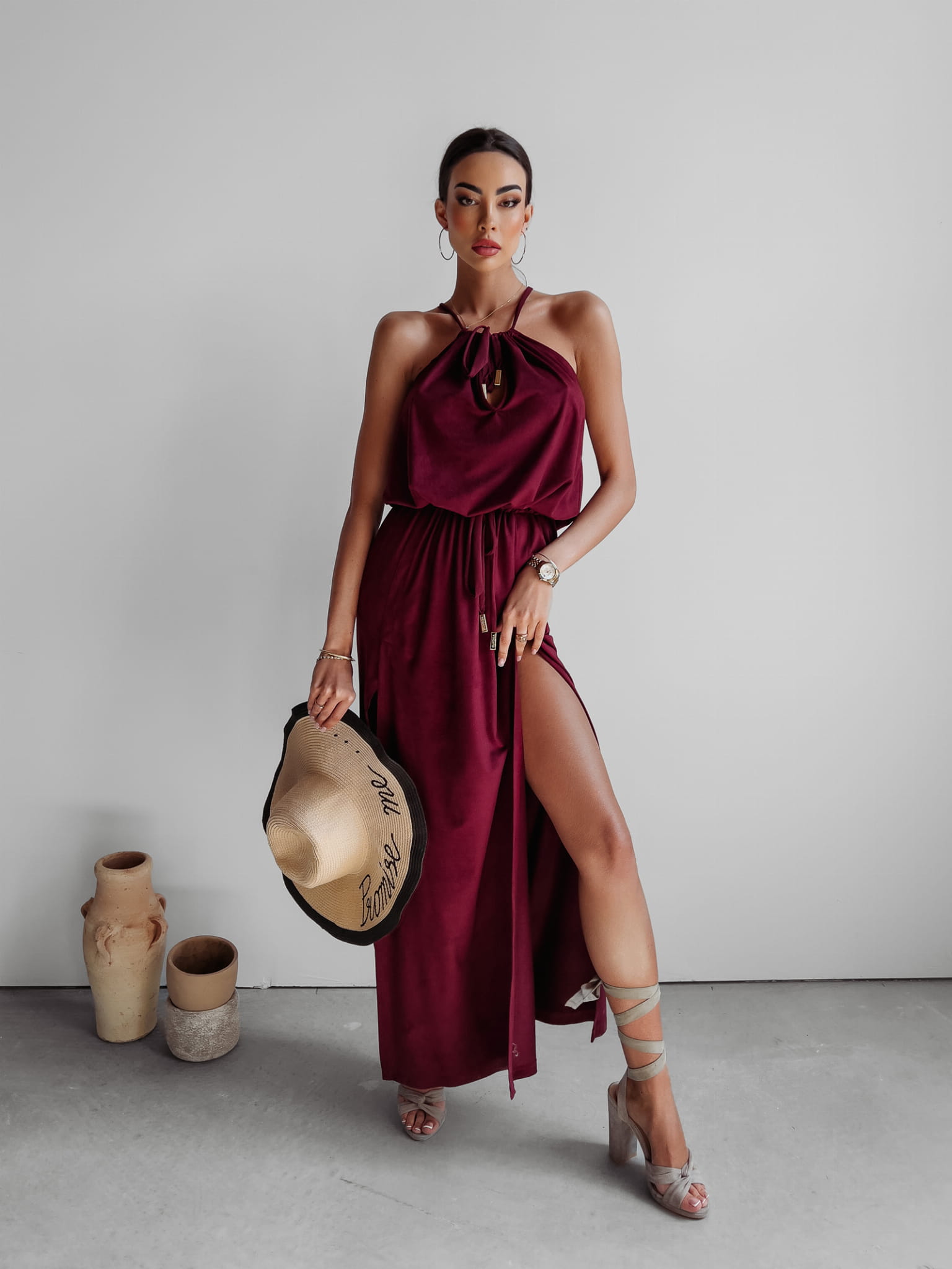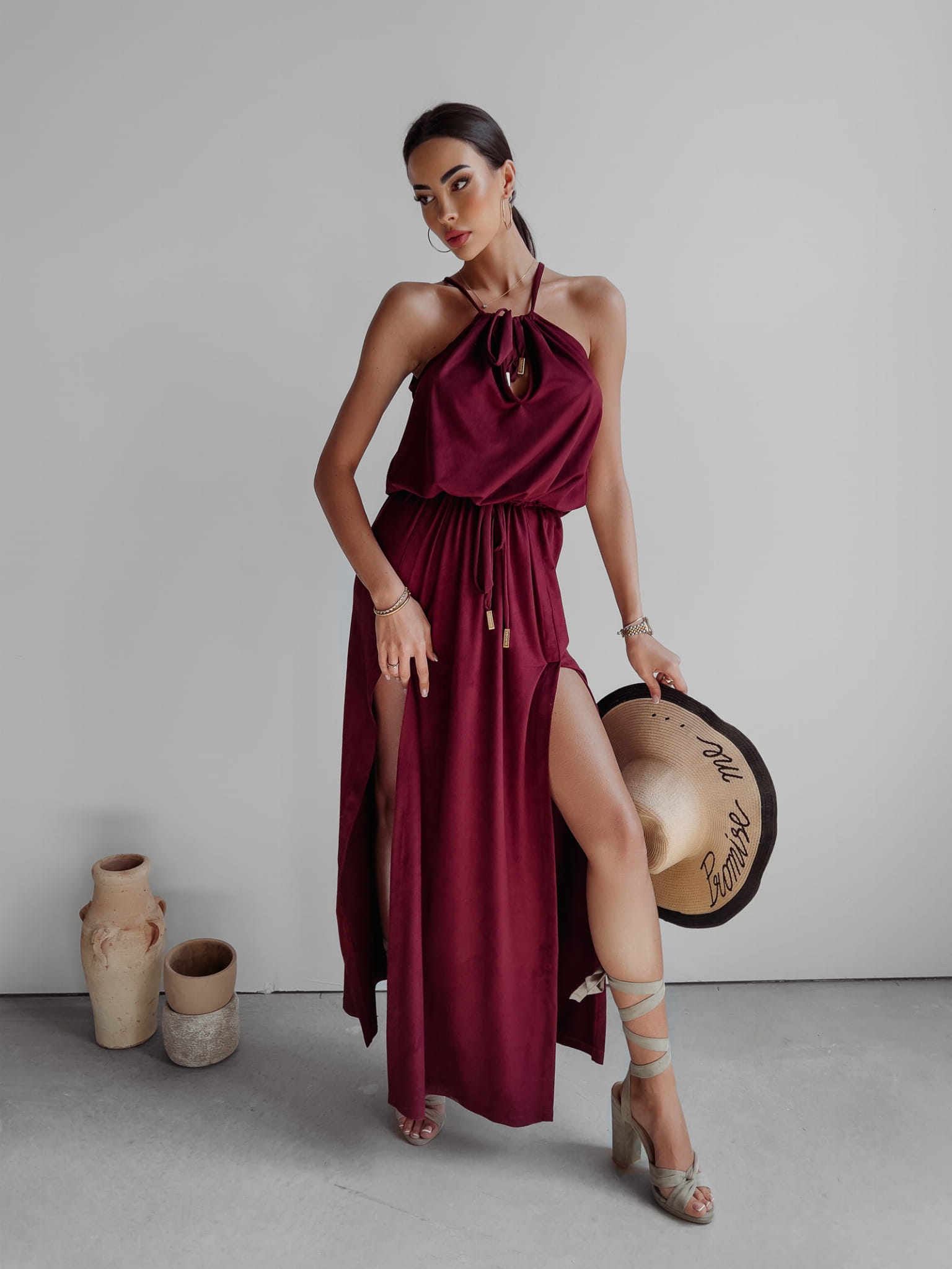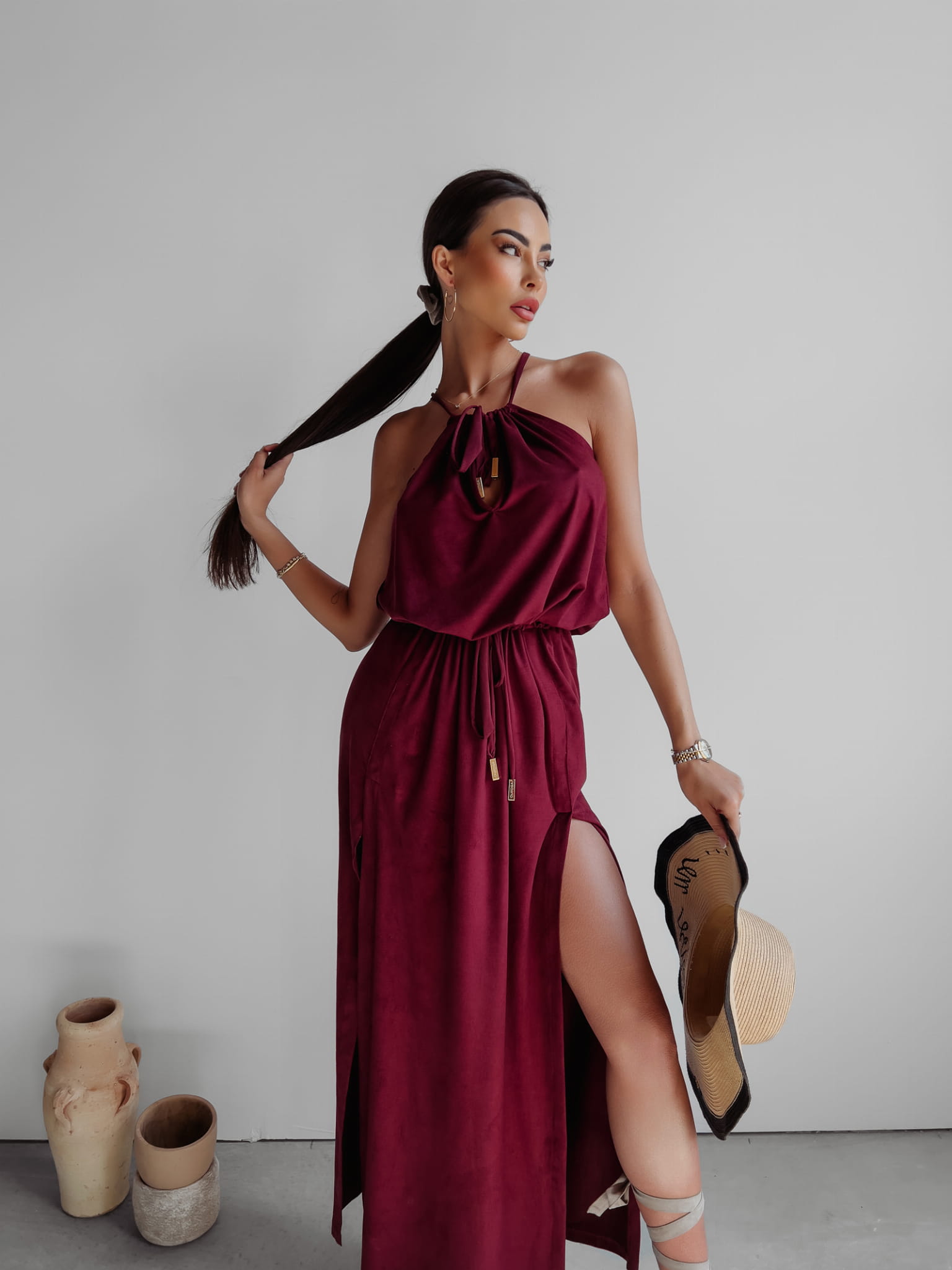 Sukienka maxi, z głębokimi rozcięciami uszyta z najwyższej jakości tkaniny zamszowej. Rozcięcia wyszczuplają sylwetkę i maksymalnie wydłużają nogi. Podwójne wiązanie – na szyi i w pasie umożliwia dopasowanie sukienki.