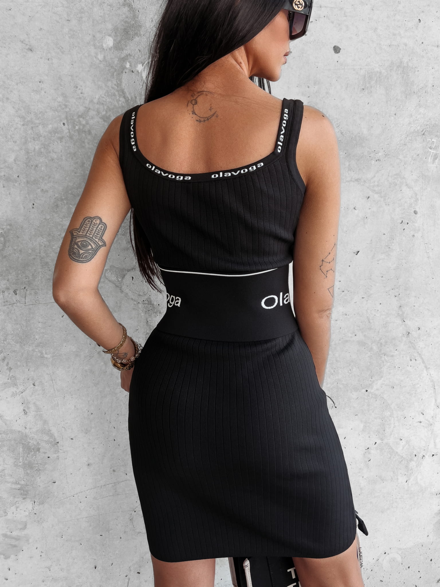 Podkreślająca figurę sukienka przed kolano. Głęboki dekolt z przodu i z tyłu. szerokie ramiączka. Góra wykończona lamówką z nadrukowanym logo.