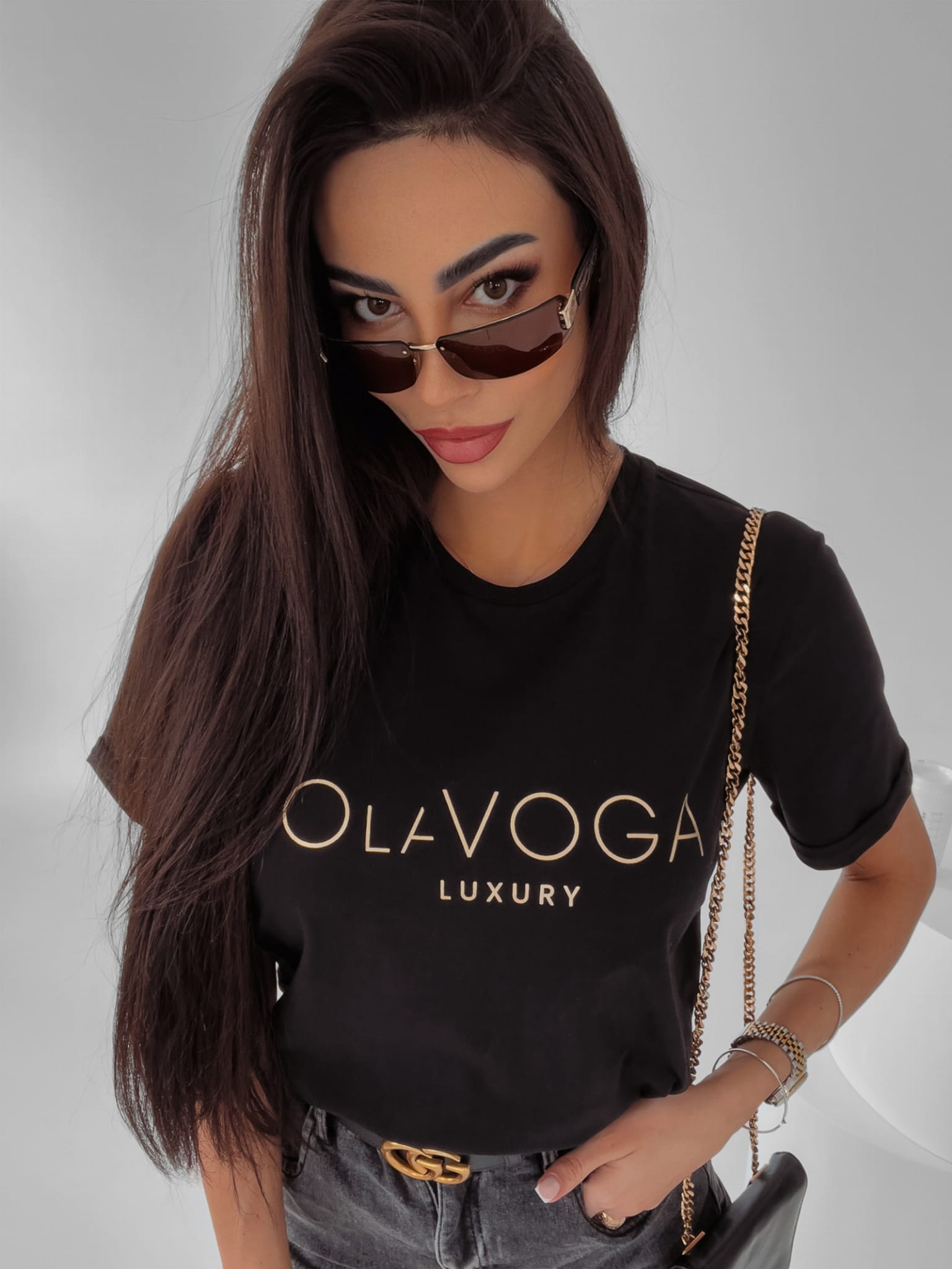 Uniwersalny, prosty T-shirt wykonany z wysokiej jakości, mięsistej bawełny. Przy szyi wykończony wąskim ściągaczem poprawiającym komfort noszenia. Fason o prostym, pudełkowym kroju z ozdobnym, złotym haftem na przodzie.