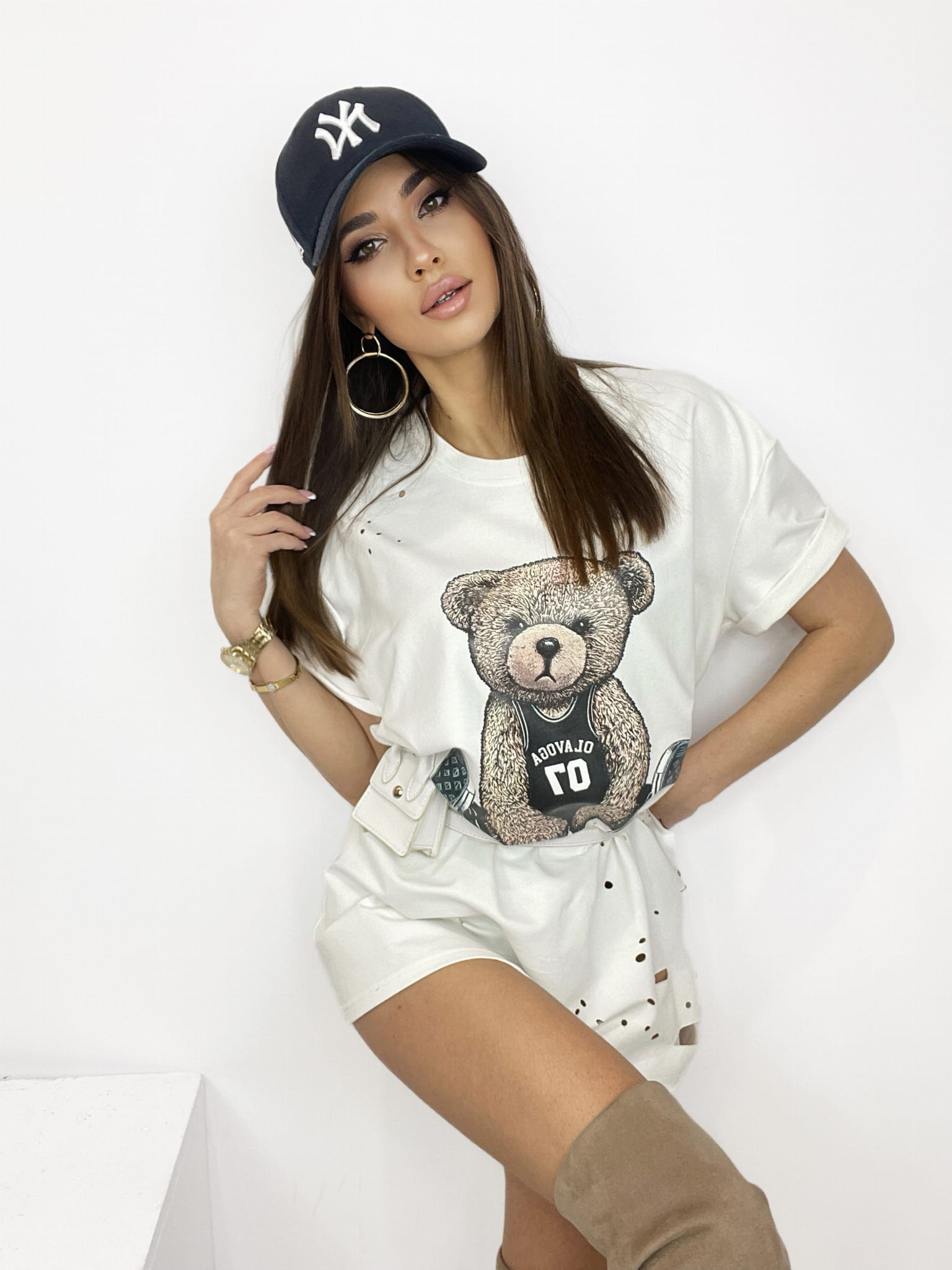 Wyjątkowy T-shirt „COOL BEAR” o oversizowym kroju, wykonany z wysokiej jakości bawełny. Na przodzie grafika misia oraz ozdobne strzępienia na materiale. Wykonany jest w czterech uniwersalnych kolorach.