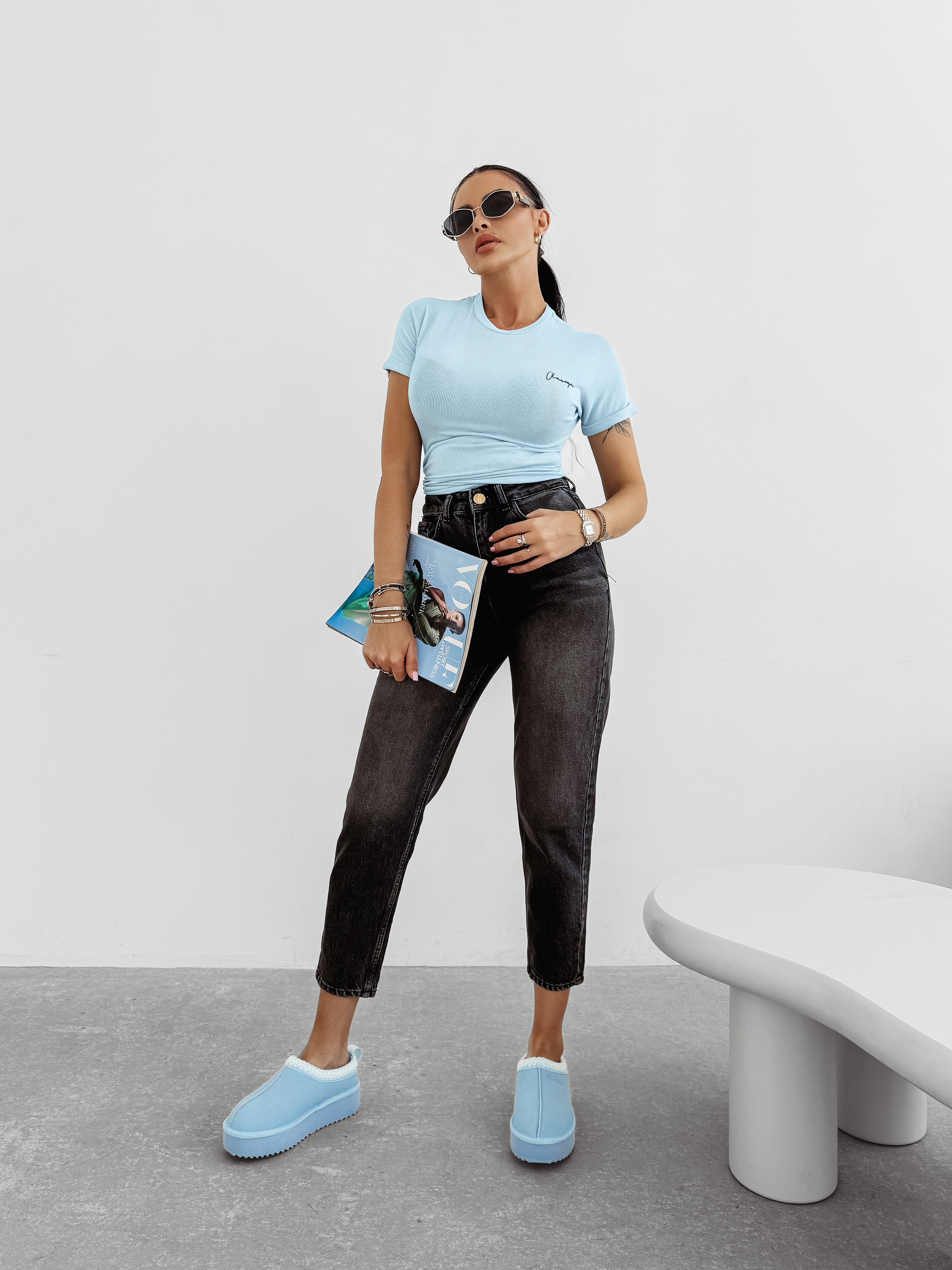 dealnie dopasowany t-shirt z krótkim rękawem, o dłuższym kroju. Wykonany z wysokiej jakości bawełny, z domieszką wiskozy. Okrągły dekolt. Na przodzie subtelny, pisany haft z logo marki OLAVOGA.