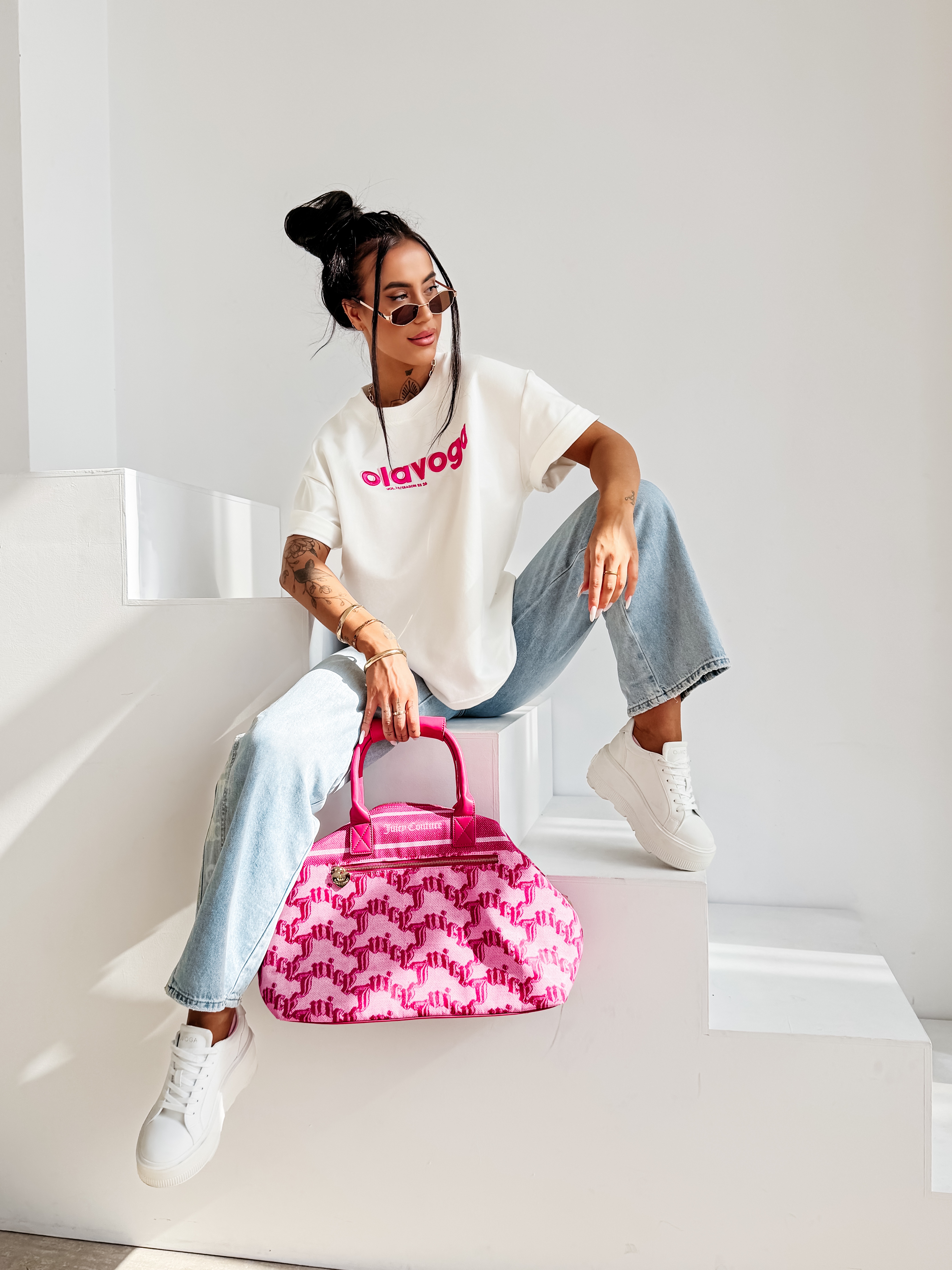 Swobodny oversize’owy krój - okrągły dekolt - krótki szeroki rękaw - kontrastowy haft na przodzie z shadow effect - nowoczesny, wyrazisty charakter