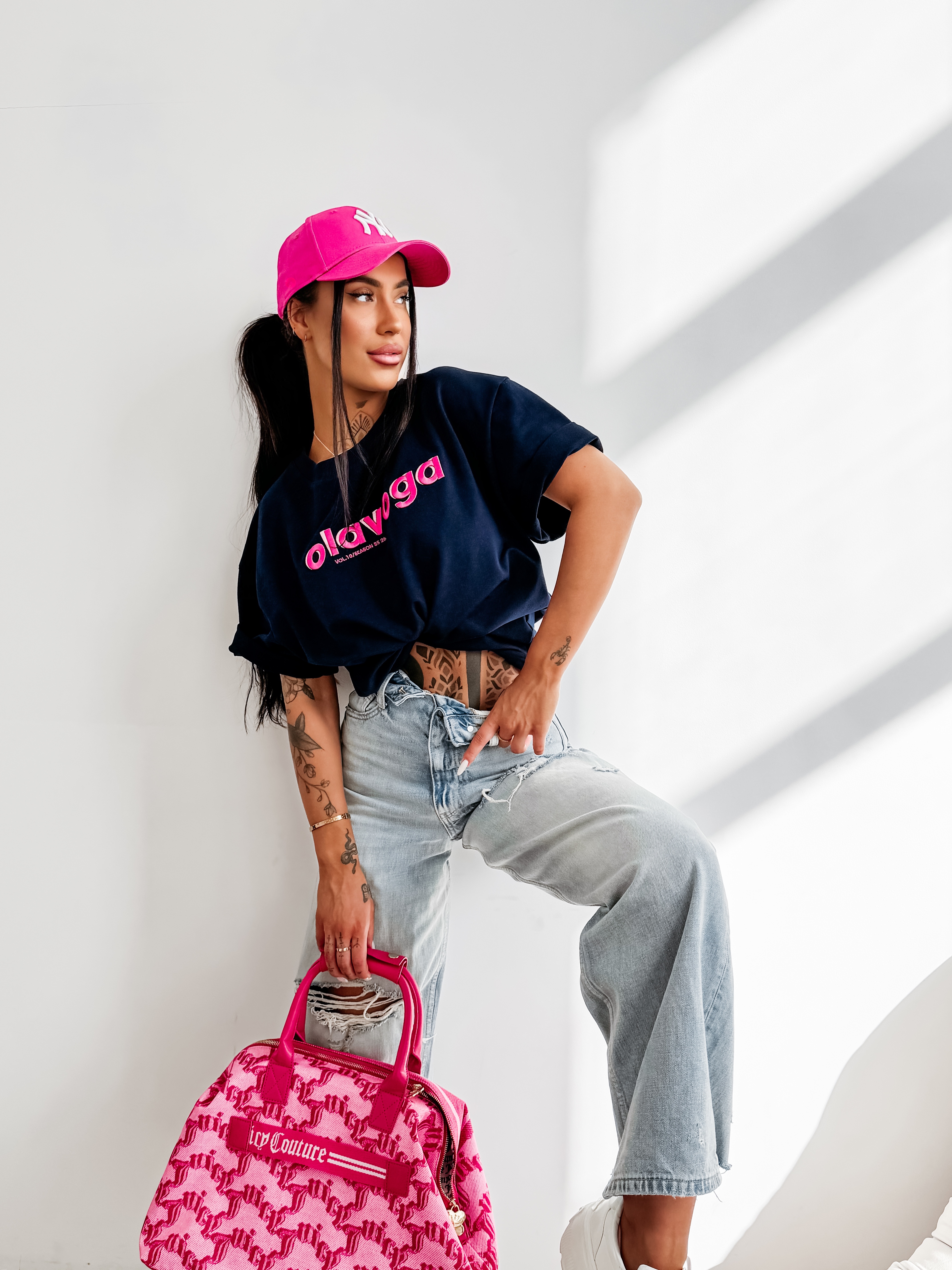 Swobodny oversize’owy krój - okrągły dekolt - krótki szeroki rękaw - kontrastowy haft na przodzie z shadow effect - nowoczesny, wyrazisty charakter