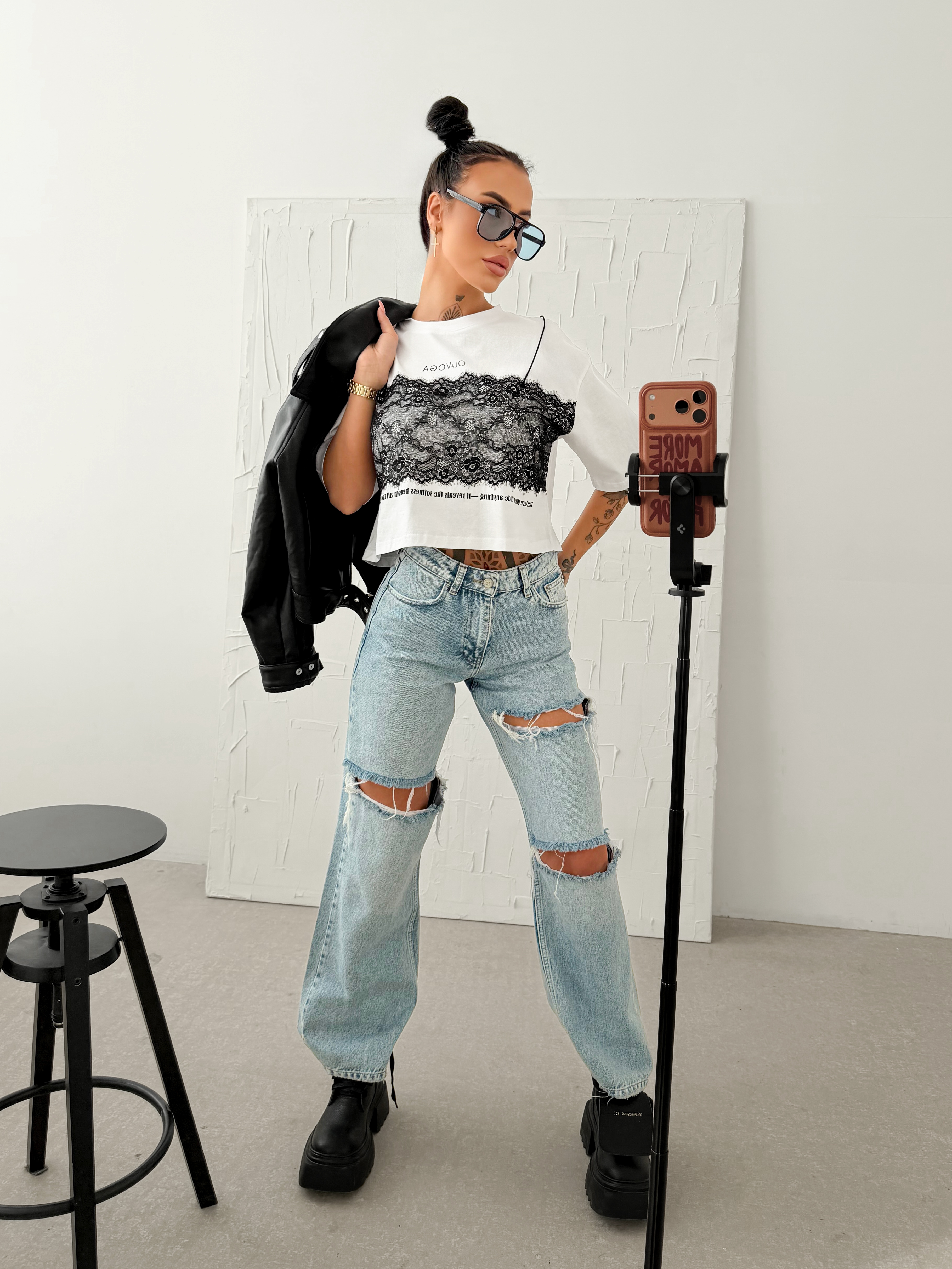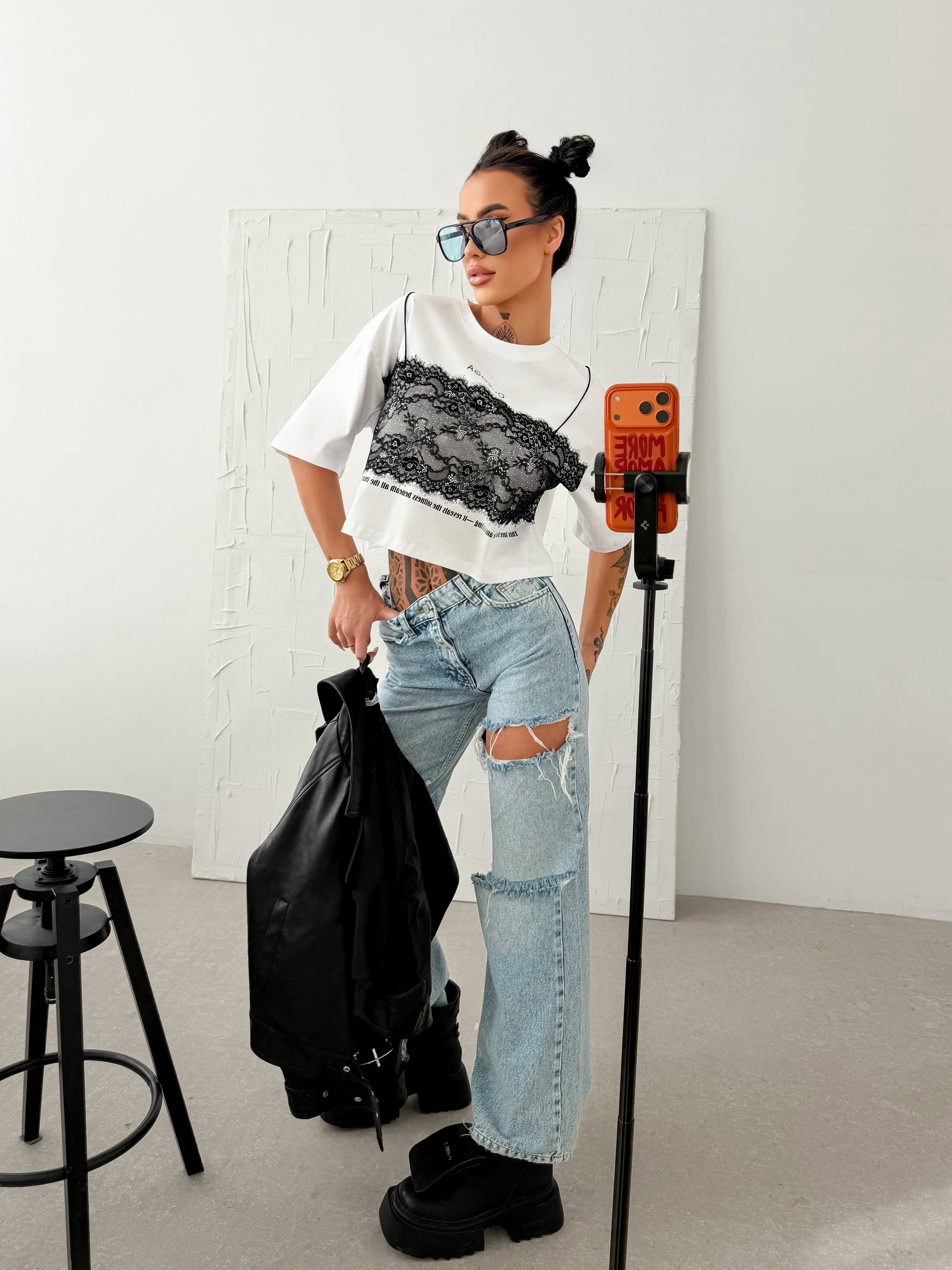 Krój boxy - krótszy krój - okrągły dekolt - krótki rękaw - z przodu kontrastowa aplikacja z koronki tworząca efekt bieliźnianej warstwy - nadruk z logo i inspirującym hasłem