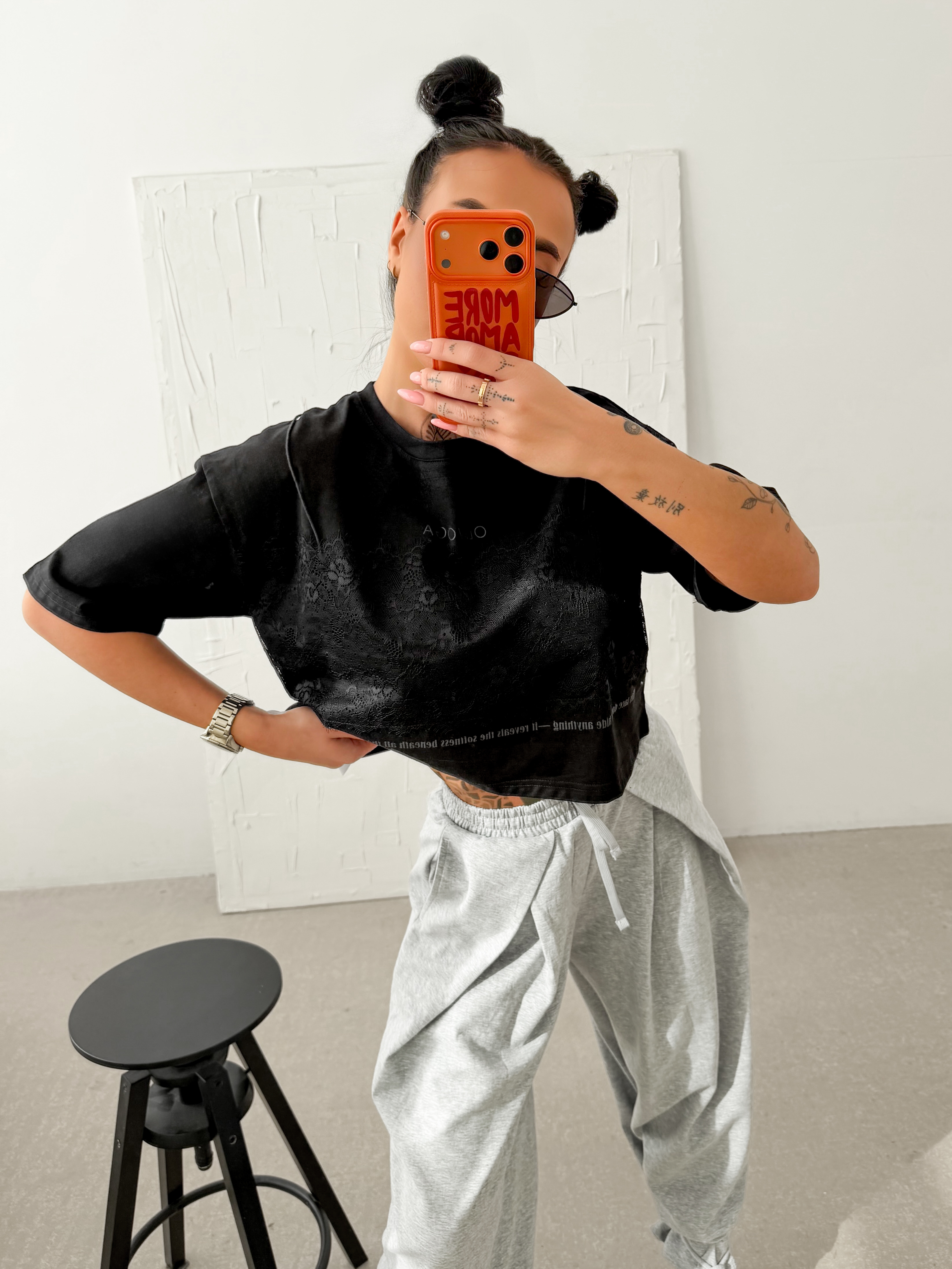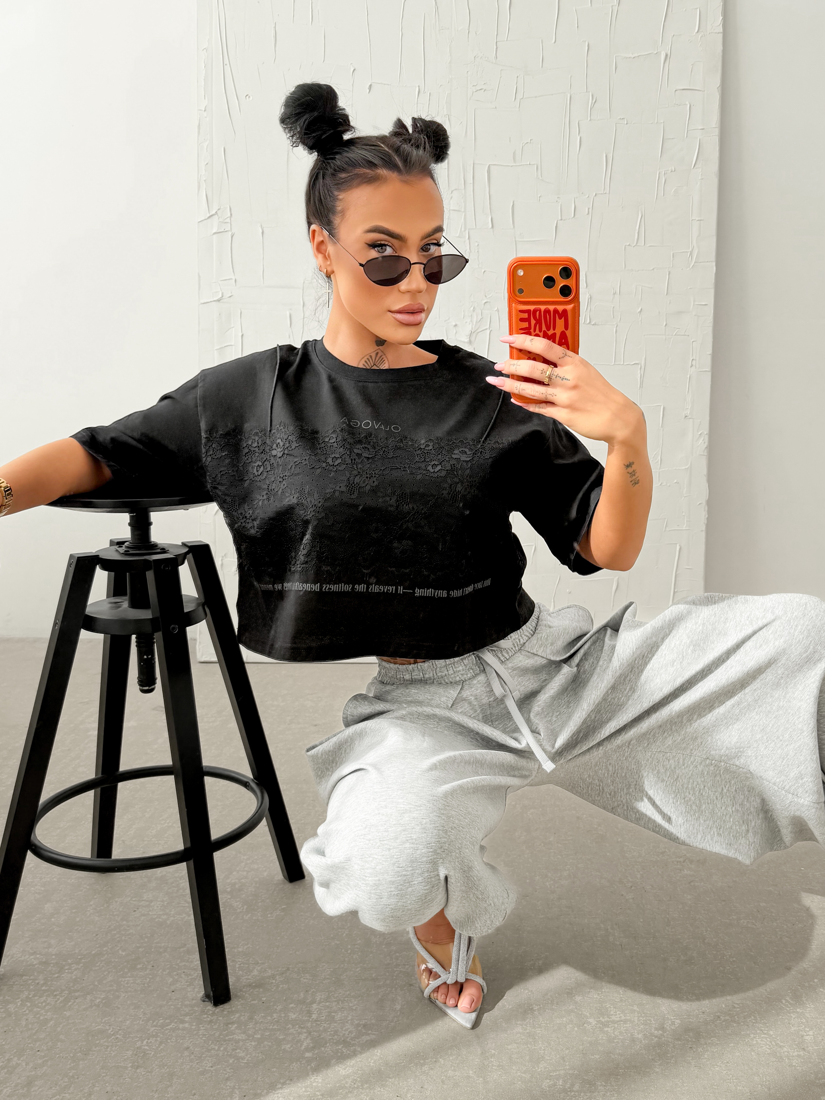 Krój boxy - krótszy krój - okrągły dekolt - krótki rękaw - z przodu kontrastowa aplikacja z koronki tworząca efekt bieliźnianej warstwy - nadruk z logo i inspirującym hasłem
