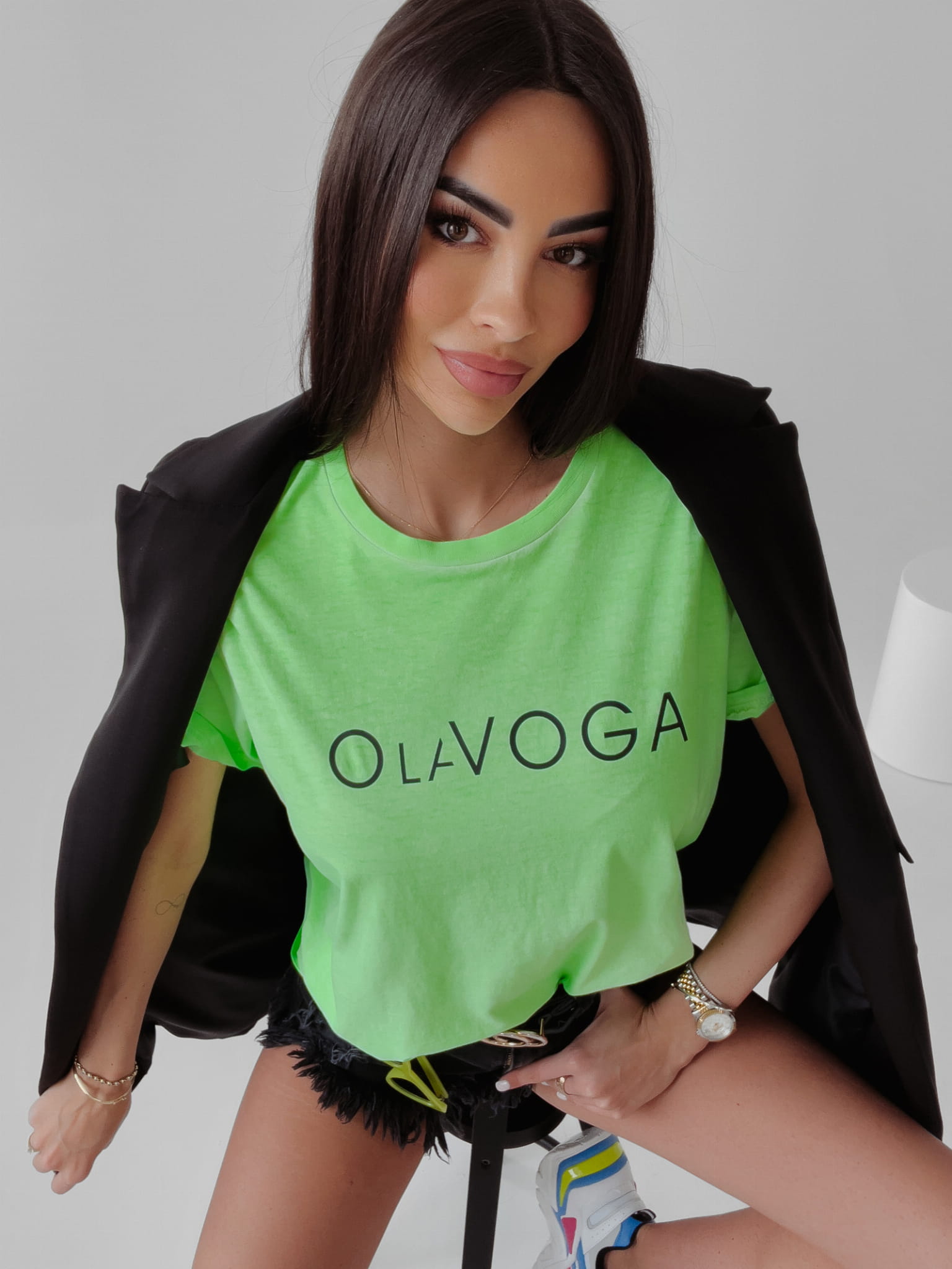 Klasyczny, bawełniany T- shirt z delikatnym efektem sprania. Mocny, wyrazisty kolor fluo dodaje pazura stylizacji. Na przodzie nadruk logo OLAVOGA. T- shirt idealnie współgra z szortami czy ulubionymi jeansami.