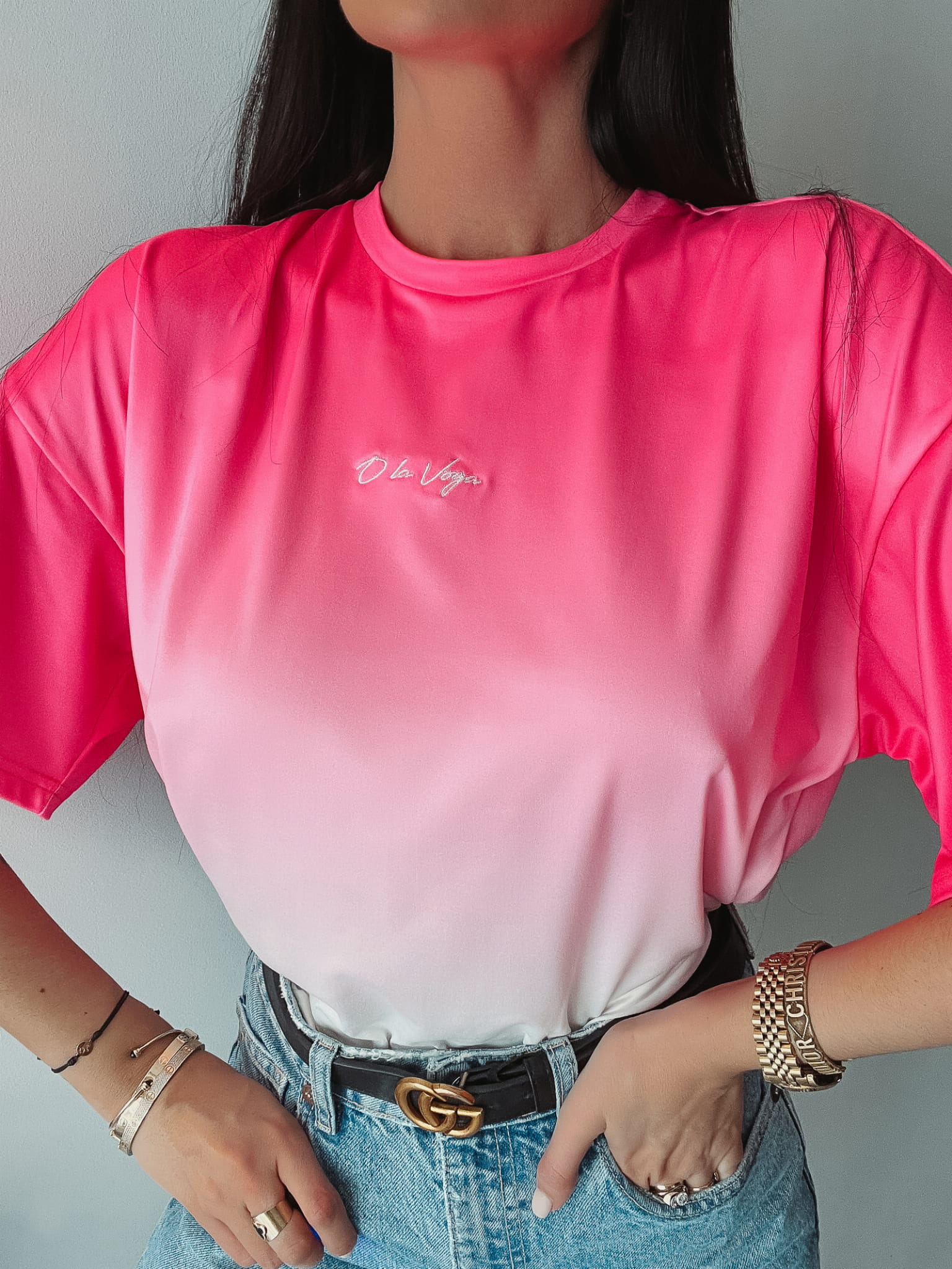 Klasyczny, lekko oversizowy T-shirt z prostym, okrągłym dekoltem. Wysokiej jakości materiał farbowany w stylu ombre. Na przodzie delikatny haft. Ciekawa alternatywa dla prostego, gładkiego T-shirtu.