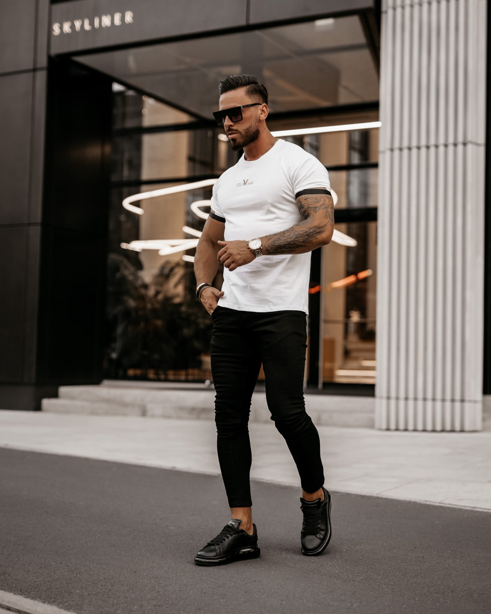 Stylowy i elegancki męski T-shirt wykończony na końcach rękawków czarną gumką z beżowobiałymi akcentami oraz delikatnym pisemnym haftem OlaVoga na środku.