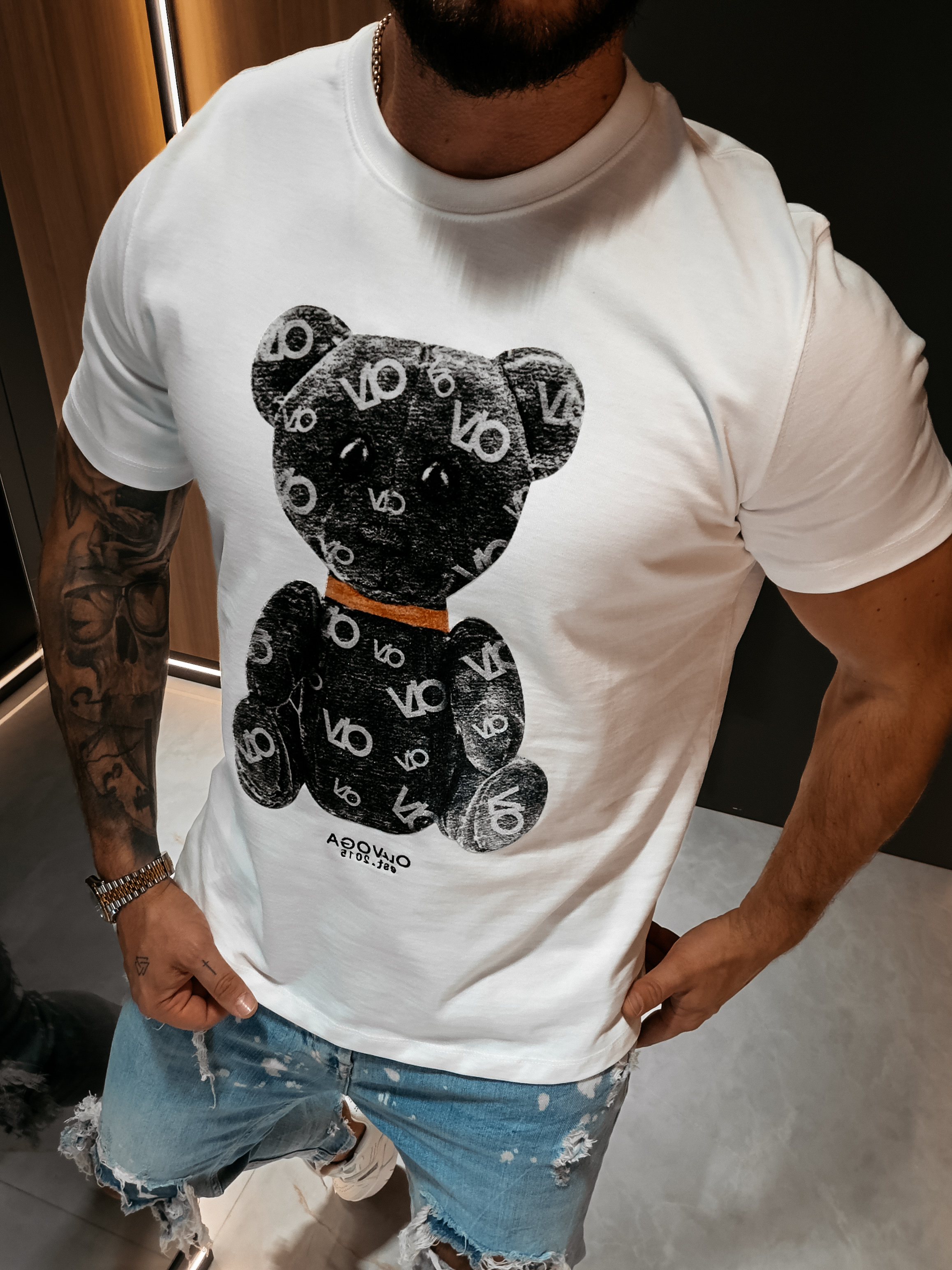 Swobodny krój - okrągły dekolt wykończony ściągaczem - na przodzie nadruk z motywem misia w kontrastowej kolorystyce z monogramem OLAVOGA oraz subtelnym haftem brandu poniżej - szeroki, krótki rękaw o prostej linii