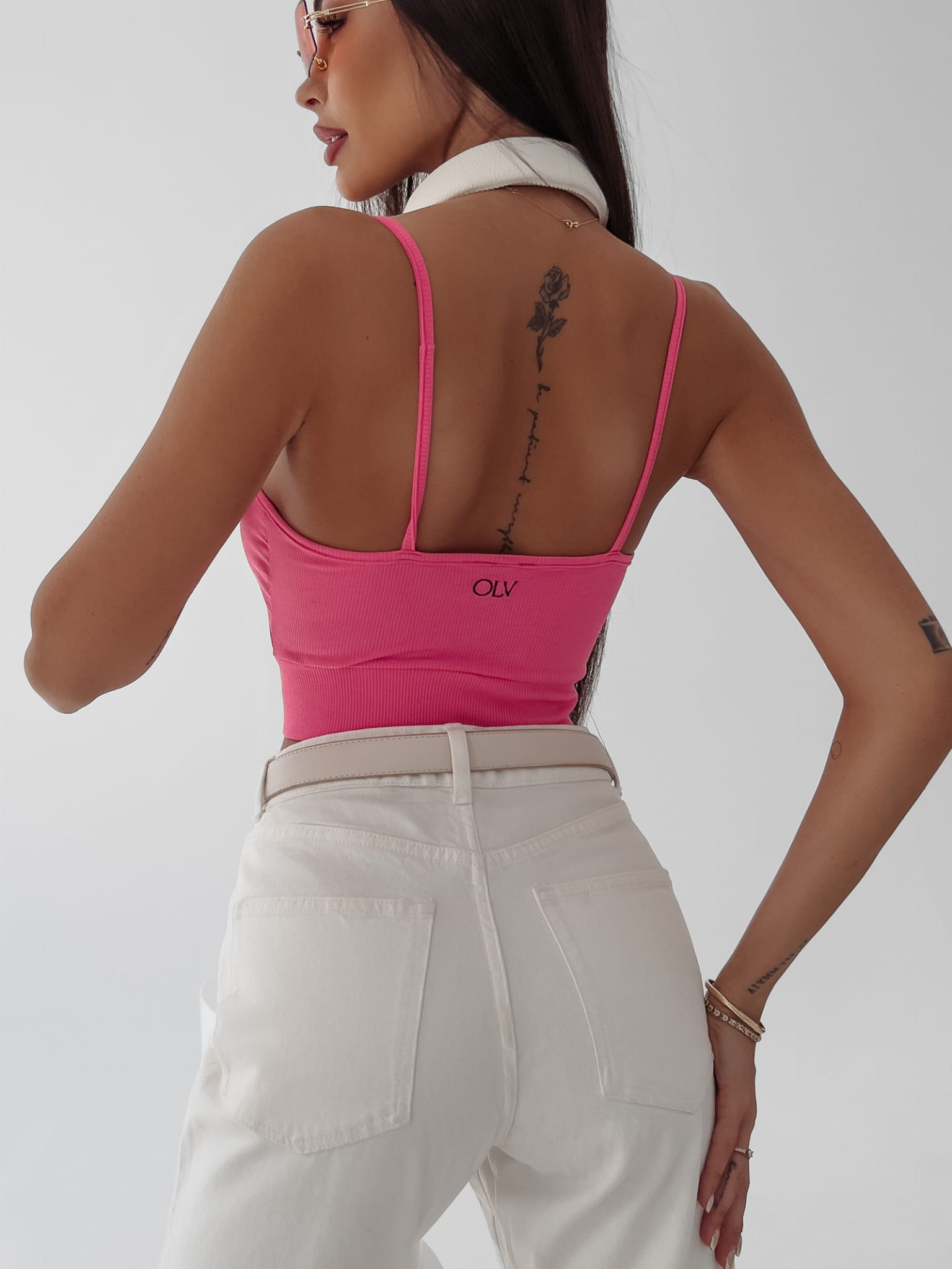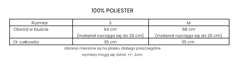 Krótki, dopasowany top na ramiączkach, zakończony na dole szeroką gumą, idealnie podtrzymującą biust. Na tyle delikatny haft OLV. Basic pod marynarkę, ramoneskę czy po prostu do noszenia w upalny dzień.
